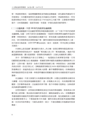8%u4eba%u6587%u8207%u793e%u6703%u79d1%u5b78%u7c21%u8a0a%u300026%u53774%u671f%uff0e114%u5e749%u6708%u5bdf%u3002%u6797%u526f%u6559%u6388%u88dc%u5145%uff0c%u6c23%u5019%u8b8a%u9077%u96d6%u5c0e%u81f4%u67d0%u4e9b%u570b%u5bb6%u9762%u7a4d%u7e2e%u6e1b%uff0c%u537b%u4e5f%u8b93%u67d0%u4e9b%u570b%u5bb6%u7684%u53ef%u7528%u5730%u589e%u52a0%u3002%u53e6%u6709%u89c0%u773e%u63d0%u554f%u518d%u751f%u80fd%u6e90%u662f%u5426%u5177%u5099%u771f%u6b63%u7684%u97cc%u6027%u3002%u6797%u526f%u6559%u6388%u6307%u51fa%uff0c%u6240%u6709%u80fd%u6e90%u521d%u671f%u6210%u672c%u7686%u9ad8%uff0c%u4f46%u518d%u751f%u80fd%u6e90%u5728%u8fd1%u5341%u5e74%u5167%u6210%u672c%u5df2%u5927%u5e45%u4e0b%u964d%uff0c%u4e14%u767c%u96fb%u6548%u7387%u986f%u8457%u63d0%u5347%u3002%u672a%u4f86%u900f%u904e%u5132%u80fd%u3001%u6c2b%u80fd%u7b49%u6280%u8853%uff0c%u6709%u671b%u9032%u4e00%u6b65%u5f37%u5316%u80fd%u6e90%u7cfb%u7d71%u7684%u97cc%u6027%u3002%uff08%u4e8c%uff09%u4e3b%u984c%u6f14%u8b1b%uff1a%u5ddd%u666e2.0%u6642%u4ee3%u7684%u7d93%u6fdf%u91d1%u878d%u6311%u6230%u672c%u5834%u6f14%u8b1b%u9080%u8acb%u4e2d%u4fe1%u91d1%u878d%u7ba1%u7406%u5b78%u9662%u6797%u5efa%u752b%u8b1b%u5ea7%u6559%u6388%uff0c%u4ee5%u300c%u5ddd%u666e2.0%u6642%u4ee3%u7684%u7d93%u6fdf%u91d1%u878d%u6311%u6230%u300d%u70ba%u984c%uff0c%u5206%u6790%u5ddd%u666e%u518d%u6b21%u7576%u9078%u7e3d%u7d71%u5f8c%uff0c%u53ef%u80fd%u5c0d%u5168%u7403%u7d93%u6fdf%u8207%u91d1%u878d%u79e9%u5e8f%u9020%u6210%u7684%u885d%u64ca%u3002%u6797%u6559%u6388%u6307%u51fa%uff0c%u7576%u524d%u5730%u7de3%u653f%u6cbb%u98a8%u96aa%u5347%u9ad8%u3001%u8cbf%u6613%u4fdd%u8b77%u4e3b%u7fa9%u5fa9%u7526%u8207%u7522%u696d%u653f%u7b56%u5167%u5411%u5316%uff0c%u4f7f%u5168%u7403%u7d93%u6fdf%u6210%u9577%u9810%u671f%u666e%u904d%u4e0b%u4fee%u3002%u96d6%u7136%u7f8e%u570b%u66fe%u56e0%u75ab%u5f8c%u5fa9%u7526%u5e36%u52d5%u80a1%u5e02%u4e0a%u6f32%uff0c%u4f46%u5ddd%u666e%u518d%u6b21%u57f7%u653f%u5f8c%uff0c%u9996%u5b63GDP%u8f49%u70ba%u8ca0%u6210%u9577%uff0c%u80a1%u5e02%u4e00%u5ea6%u91cd%u632b%uff0c%u6240%u5e78%u8fd1%u671f%u5df2%u56de%u7a69%u751a%u81f3%u5275%u9ad8%u3002%u5ddd%u666e%u6838%u5fc3%u653f%u898b%u5ef6%u7e8c%u300c%u8b93%u7f8e%u570b%u518d%u6b21%u5049%u5927%u300d%u7684%u4e3b%u8ef8%uff0c%u653f%u7b56%u76ee%u6a19%u805a%u7126%u88fd%u9020%u696d%u56de%u6d41%u3001%u64f4%u5927%u5c31%u696d%u8207%u63a7%u7ba1%u8ca1%u653f%u8d64%u5b57%u3002%u4ed6%u5f37%u8abf%u300c%u5e6b%u7f8e%u570b%u4eba%u627e%u5de5%u4f5c%u3001%u5e6b%u7f8e%u570b%u627e%u9322%u300d%uff0c%u65bd%u653f%u624b%u6bb5%u6db5%u84cb%u95dc%u7a05%u5236%u88c1%u3001%u64f4%u5927%u80fd%u6e90%u958b%u63a1%u3001%u9650%u5236%u79fb%u6c11%u8207%u6e1b%u7a05%u7b49%uff0c%u4ee5%u5f37%u5316%u7f8e%u570b%u7d93%u6fdf%u4e3b%u9ad4%u6027%u3002%u5176%u4e2d%uff0c%u5c0d%u7b49%u95dc%u7a05%u662f%u5ddd%u666e%u4e3b%u6253%u7b56%u7565%u4e4b%u4e00%u3002%u4ed6%u900f%u904e%u5ba3%u544a%u7d93%u6fdf%u7dca%u6025%u72c0%u614b%uff0c%u5f15%u7528%u300a%u570b%u969b%u7dca%u6025%u7d93%u6fdf%u6b0a%u529b%u6cd5%u300b%u7e5e%u904e%u570b%u6703%uff0c%u6839%u64da%u8cbf%u6613%u5925%u4f34%u570b%u5c0d%u7f8e%u570b%u5fb5%u6536%u7684%u95dc%u7a05%u7a05%u7387%u4ee5%u7259%u9084%u7259%uff0c%u4e14%u5c0d%u4e2d%u570b%u3001%u58a8%u897f%u54e5%u3001%u52a0%u62ff%u5927%u7b49%u570b%u7686%u63a1%u5f37%u786c%u7acb%u5834%u3002%u6797%u6559%u6388%u6307%u51fa%uff0c%u8a72%u653f%u7b56%u96d6%u5177%u653f%u6cbb%u6548%u679c%uff0c%u4f46%u5728%u8a08%u7b97%u516c%u5f0f%u3001%u5ffd%u7565%u670d%u52d9%u8cbf%u6613%u9806%u5dee%u53caWTO%u898f%u5247%u7b49%u5c64%u9762%u5b58%u5728%u722d%u8b70%u3002%u5c0d%u81fa%u7063%u800c%u8a00%uff0c%u8cc7%u901a%u8a0a%u7522%u54c1%u51fa%u53e3%u5c07%u53d7%u8f03%u5927%u5f71%u97ff%uff0c%u96d6%u534a%u5c0e%u9ad4%u66ab%u6642%u8c41%u514d%uff0c%u4f46%u50b3%u7d71%u88fd%u9020%u8207%u7d42%u7aef%u7d44%u88dd%u696d%u6050%u9996%u7576%u5176%u885d%uff0c%u6797%u6559%u6388%u547c%u7c72%u653f%u5e9c%u61c9%u9748%u6d3b%u904b%u7528%u6301%u6709%u7f8e%u570b%u8cc7%u7522%u4f5c%u70ba%u8ac7%u5224%u7c4c%u78bc%u3002%u5728%u91d1%u878d%u9762%uff0c%u5ddd%u666e%u4e3b%u5f35%u767c%u884c%u4ee5%u7f8e%u50b5%u64d4%u4fdd%u7684%u7a69%u5b9a%u5e63%uff0c%u4ee5%u7a69%u5b9a%u7f8e%u50b5%u50f9%u683c%u4e26%u7dad%u6301%u7f8e%u5143%u9738%u6b0a%uff0c%u4f46%u4e5f%u53ef%u80fd%u4fc3%u4f7f%u4ed6%u570b%u8ddf%u9032%u767c%u884c%uff0c%u9032%u4e00%u6b65%u63a8%u52d5%u53bb%u7f8e%u5143%u5316%uff0c%u5176%u9577%u671f%u5f71%u97ff%u4ecd%u9700%u89c0%u5bdf%u3002%u81f3%u65bc%u806f%u6e96%u6703%u653f%u7b56%uff0c%u76ee%u524d%u7dad%u6301%u5229%u7387%u4e0d%u8b8a%uff0c%u60df%u4eca%u5e74%u7a0d%u665a%u53ef%u80fd%u964d%u606f%uff0c%u53cd%u6620%u7d93%u6fdf%u6210%u9577%u6e1b%u901f%u8207%u901a%u81a8%u58d3%u529b%u5347%u9ad8%u3002%u5728%u554f%u7b54%u74b0%u7bc0%u4e2d%uff0c%u91dd%u5c0d%u81fa%u7f8e%u8ecd%u8cfc%u8207%u6295%u8cc7%u662f%u5426%u6709%u52a9%u65bc%u964d%u4f4e%u95dc%u7a05%uff0c%u6797%u6559%u6388%u8868%u793a%u8ecd%u8cfc%u4e0d%u7d0d%u5165%u7d93%u5e38%u5e33%uff0c%u7121%u6cd5%u62b5%u6d88%u7f8e%u570b%u7684%u8cbf%u6613%u9006%u5dee%uff0c%u95dc%u7a05%u5e95%u7dda%u61c9%u70ba10%%uff0c%u4f46%u6574%u9ad4%u9084%u8981%u8003%u616e%u6211%u570b%u8207%u7f8e%u570b%u8ac7%u5224%u7b54%u61c9%u5c0d%u7f8e%u570b%u7684%u5e02%u5834%u958b%u653e%u53ca%u6295%u8cc7%u91d1%u984d%u3002%u4ed6%u4e5f%u5efa%u8b70%u6295%u8cc7%u4eba%u53ca%u570b%u5bb6%u8cc7%u7522%u914d%u7f6e%u61c9%u591a%u5143%uff0c%u4e0d%u61c9%u904e%u5ea6%u96c6%u4e2d%u65bc%u7f8e%u570b%uff0c%u96d6%u7136%u7f8e%u50b5%u8fd1%u671f%u53d7%u532f%u7387%u6ce2%u52d5%u5f71%u97ff%u8667%u640d%uff0c%u4f46%u5176%u4fe1%u7528%u4f9d%u7136%u7a69%u5b9a%uff0c%u53ef%u8996%u70ba%u8cc7%u7522%u7684%u4e00%u90e8%u5206%uff0c%u4e0d%u904e%u4e5f%u61c9%u95dc%u6ce8%u5176%u4ed6%u570b%u5bb6%u7684%u6295%u8cc7%u6a5f%u6703%u3002
