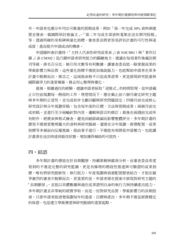 %u8d70%u5f97%u9577%u9060%u7684%u7814%u7a76%uff1a%u591a%u5e74%u671f%u8a08%u756b%u64b0%u5beb%u8207%u7533%u8acb%u7b56%u7565%u7b46%u8a18105%u5916%uff0c%u7533%u8acb%u8005%u4e5f%u61c9%u5206%u5e74%u5217%u51fa%u53ef%u8861%u91cf%u7684%u9810%u671f%u6210%u679c%uff0c%u4f8b%u5982%u300c%u7b2c%u4e00%u5e74%u5b8c%u621030%%u8cc7%u6599%u5eab%u5efa%u7f6e%u4e26%u767c%u8868%u4e00%u7bc7%u570b%u969b%u7814%u8a0e%u6703%u8ad6%u6587%u300d%u3001%u300c%u7b2c%u4e8c%u5e74%u5b8c%u6210%u5168%u90e8%u8cc7%u6599%u8490%u96c6%u4e26%u9001%u4ea4%u671f%u520a%u6295%u7a3f%u300d%u7b49%u3002%u900f%u904e%u660e%u78ba%u7684%u91cc%u7a0b%u7891%u8207%u91cf%u5316%u6307%u6a19%uff0c%u5be9%u67e5%u59d4%u54e1%u5c07%u66f4%u5bb9%u6613%u8a55%u4f30%u8a08%u756b%u7684%u53ef%u884c%u6027%u8207%u9054%u6210%u5ea6%uff0c%u9032%u800c%u63d0%u5347%u7533%u8acb%u6210%u529f%u7684%u6a5f%u6703%u3002%u7533%u8acb%u570b%u79d1%u6703%u8a08%u756b%u6642%uff0c%u300c%u4e3b%u6301%u4eba%u4ee3%u8868%u6027%u7814%u7a76%u6210%u679c%u8868%u300d%uff08%u8868NSCH01%uff09%u8207%u300c%u8457%u4f5c%u76ee%u9304%u300d%uff08%u8868CM302%uff09%u662f%u51f8%u986f%u7533%u8acb%u8005%u7814%u7a76%u80fd%u529b%u7684%u95dc%u9375%u5730%u65b9%u3002%u5efa%u8b70%u5728%u6bcf%u9805%u8457%u4f5c%u5f8c%u5099%u8a3b%u671f%u520a%u7b49%u7d1a%u3001%u6392%u540d%u767e%u5206%u6bd4%u3001%u88ab%u5f15%u7528%u6b21%u6578%u7b49%u6709%u5229%u6578%u64da%uff0c%u8b93%u5be9%u67e5%u59d4%u54e1%u80fd%u4e00%u773c%u638c%u63e1%u6210%u679c%u7684%u5b78%u8853%u5f71%u97ff%u529b%u8207%u54c1%u8cea%u3002%u9019%u4e9b%u91cf%u5316%u6307%u6a19%u4e0d%u50c5%u80fd%u52a0%u5f37%u8aaa%u670d%u529b%uff0c%u4e5f%u80fd%u5e6b%u52a9%u7533%u8acb%u8005%u5728%u773e%u591a%u8a08%u756b%u4e2d%u812b%u7a4e%u800c%u51fa%u3002%u63db%u8a00%u4e4b%uff0c%u9019%u5169%u5f35%u8868%u683c%u4e0d%u53ea%u662f%u6210%u679c%u6e05%u55ae%uff0c%u66f4%u662f%u5c55%u73fe%u7814%u7a76%u80fd%u91cf%u8207%u570b%u969b%u7af6%u722d%u529b%u7684%u91cd%u8981%u821e%u81fa%uff0c%u52d9%u5fc5%u7528%u5fc3%u6574%u7406%u8207%u512a%u5316%u3002%u6700%u5f8c%uff0c%u6839%u64da%u904e%u5f80%u7684%u7d93%u9a57%uff0c%u5efa%u8b70%u7533%u8acb%u8005%u63a1%u53d6%u300c%u9006%u63a8%u5f0f%u300d%u7684%u6642%u9593%u7ba1%u7406%uff0c%u5f9e%u7533%u8acb%u622a%u6b62%u65e5%u5f80%u524d%u898f%u5283%u6bcf%u4e00%u968e%u6bb5%u7684%u5de5%u4f5c%u3002%u7406%u60f3%u60c5%u6cc1%u4e0b%uff0c%u61c9%u5728%u622a%u6b62%u524d%u516d%u500b%u6708%u78ba%u5b9a%u7814%u7a76%u4e3b%u984c%u8207%u591a%u5e74%u671f%u7684%u6b63%u7576%u6027%uff0c%u4e26%u5b8c%u6210%u521d%u6b65%u6587%u737b%u56de%u9867%u8207%u7814%u7a76%u554f%u984c%u8a2d%u5b9a%uff1b%u56db%u500b%u6708%u524d%u5b8c%u6210%u6838%u5fc3%u7814%u7a76%u8a2d%u8a08%u8207%u5206%u5e74%u898f%u5283%u8349%u7a3f%uff0c%u5305%u542b%u6bcf%u5e74%u5ea6%u7684%u76ee%u6a19%u3001%u65b9%u6cd5%u8207%u9810%u671f%u6210%u679c%uff1b%u5169%u500b%u6708%u524d%u5b8c%u6210%u521d%u7a3f%uff0c%u4e26%u9032%u884c%u81f3%u5c11%u5169%u8f2a%u91dd%u5c0d%u5167%u5bb9%u3001%u908f%u8f2f%u8207%u8a9e%u8a00%u7684%u4fee%u8a02%uff1b%u6700%u5f8c%u5728%u5169%u9031%u524d%u5b8c%u6210%u6240%u6709%u9644%u4ef6%u3001%u7d93%u8cbb%u8868%u8207%u683c%u5f0f%u6aa2%u67e5%uff0c%u907f%u514d%u56e0%u7d30%u7bc0%u758f%u6f0f%u800c%u5f71%u97ff%u6574%u9ad4%u8a55%u5206%u3002%u591a%u5e74%u671f%u8a08%u756b%u7684%u64b0%u5beb%u4e0d%u50c5%u9700%u8981%u6574%u7406%u9f90%u5927%u7684%u8cc7%u6599%u8207%u7814%u7a76%u8108%u7d61%uff0c%u9084%u9700%u5728%u5206%u5e74%u898f%u5283%u3001%u7d93%u8cbb%u914d%u7f6e%u3001%u6210%u679c%u6307%u6a19%u7b49%u591a%u500b%u9762%u5411%u53cd%u8986%u63a8%u6572%u3002%u63d0%u524d%u8457%u624b%u9032%u884c%uff0c%u4e0d%u50c5%u80fd%u6709%u6548%u964d%u4f4e%u7533%u8acb%u58d3%u529b%uff0c%u4e5f%u80fd%u8b93%u8a08%u756b%u66f8%u5728%u9001%u51fa%u6642%u9054%u5230%u6700%u4f73%u72c0%u614b%uff0c%u589e%u52a0%u7372%u5f97%u88dc%u52a9%u7684%u53ef%u80fd%u6027%u3002%u56db%u3001%u7d50%u8a9e%u591a%u5e74%u671f%u8a08%u756b%u7684%u50f9%u503c%u5728%u65bc%u9577%u671f%u89c0%u5bdf%u3001%u6301%u7e8c%u7d2f%u7a4d%u8207%u7e31%u6df1%u5206%u6790%uff0c%u800c%u5be9%u67e5%u59d4%u54e1%u5e0c%u671b%u770b%u5230%u7684%u4e0d%u50c5%u662f%u5b8c%u6574%u7684%u7814%u7a76%u85cd%u5716%uff0c%u66f4%u662f%u6709%u689d%u7406%u7684%u968e%u6bb5%u6027%u63a8%u9032%u8207%u53ef%u9a57%u8b49%u7684%u6210%u679c%u6307%u6a19%u3002%u552f%u6709%u5c07%u7814%u7a76%u5275%u65b0%u6027%u3001%u57f7%u884c%u80fd%u529b%u3001%u5e74%u5ea6%u898f%u5283%u8207%u8cc7%u6e90%u914d%u7f6e%u7dca%u5bc6%u7d50%u5408%uff0c%u624d%u80fd%u5728%u7af6%u722d%u6fc0%u70c8%u7684%u5be9%u67e5%u4e2d%u812b%u7a4e%u800c%u51fa%u3002%u66f4%u91cd%u8981%u7684%u662f%uff0c%u7533%u8acb%u8005%u9700%u5728%u63d0%u6848%u4e2d%u5c55%u73fe%u5c0d%u7814%u7a76%u4e3b%u984c%u7684%u300c%u9577%u671f%u9858%u666f%u300d%uff0c%u4e26%u80fd%u4ee5%u5177%u9ad4%u6578%u64da%u8207%u904e%u5f80%u6210%u679c%u8b49%u660e%u81ea%u8eab%u7684%u57f7%u884c%u529b%u8207%u6301%u7e8c%u7522%u51fa%u80fd%u529b%u3002%u591a%u5e74%u671f%u8a08%u756b%u4e26%u975e%u55ae%u7d14%u7684%u7d93%u8cbb%u722d%u53d6%uff0c%u800c%u662f%u4e00%u4efd%u5c0d%u7814%u7a76%u54c1%u8cea%u3001%u5b78%u8853%u5f71%u97ff%u529b%u7684%u9577%u671f%u6295%u8cc7%u3002%u53ea%u8981%u7533%u8acb%u8005%u80fd%u6e05%u695a%u898f%u5283%u6bcf%u5e74%u7684%u9032%u5ea6%u3001%u76ee%u6a19%u8207%u7522%u51fa%uff0c%u591a%u5e74%u671f%u4e0d%u50c5%u662f%u7d93%u8cbb%u7a69%u5b9a%u7684%u4fdd%u8b49%uff0c%u4e5f%u662f%u5efa%u7acb%u5b78%u8853%u8072%u671b%u8207%u7814%u7a76%u8108%u7d61%u7684%u91cd%u8981%u8d77%u9ede%u3002