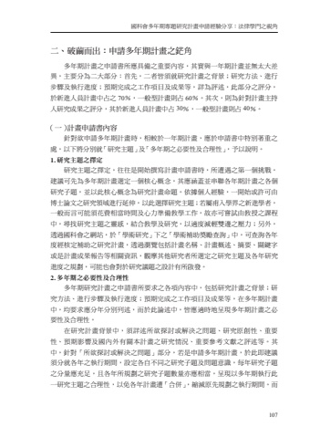 %u570b%u79d1%u6703%u591a%u5e74%u671f%u5c08%u984c%u7814%u7a76%u8a08%u756b%u7533%u8acb%u7d93%u9a57%u5206%u4eab%uff1a%u6cd5%u5f8b%u5b78%u9580%u4e4b%u8996%u89d2107%u4e8c%u3001%u7834%u7e6d%u800c%u51fa%uff1a%u7533%u8acb%u591a%u5e74%u671f%u8a08%u756b%u4e4b%u92e9%u89d2%u591a%u5e74%u671f%u8a08%u756b%u4e4b%u7533%u8acb%u66f8%u6240%u61c9%u5177%u5099%u4e4b%u91cd%u8981%u5167%u5bb9%uff0c%u5176%u5be6%u8207%u4e00%u5e74%u671f%u8a08%u756b%u4e26%u7121%u592a%u5927%u5dee%u7570%uff0c%u4e3b%u8981%u5206%u70ba%u4e8c%u5927%u90e8%u5206%uff1a%u9996%u5148%uff0c%u4e8c%u8005%u7686%u9808%u5c31%u7814%u7a76%u8a08%u756b%u4e4b%u80cc%u666f%uff1b%u7814%u7a76%u65b9%u6cd5%u3001%u9032%u884c%u6b65%u9a5f%u53ca%u57f7%u884c%u9032%u5ea6%uff1b%u9810%u671f%u5b8c%u6210%u4e4b%u5de5%u4f5c%u9805%u76ee%u53ca%u6210%u679c%u7b49%uff0c%u8a73%u70ba%u8a55%u8ff0%uff0c%u6b64%u90e8%u5206%u4e4b%u8a55%u5206%uff0c%u65bc%u65b0%u9032%u4eba%u54e1%u8a08%u756b%u4e2d%u5360%u4e4b70%uff05%uff0c%u4e00%u822c%u578b%u8a08%u756b%u5247%u536060%uff05%u3002%u5176%u6b21%uff0c%u5247%u70ba%u91dd%u5c0d%u8a08%u756b%u4e3b%u6301%u4eba%u7814%u7a76%u6210%u679c%u4e4b%u8a55%u5206%uff0c%u5176%u65bc%u65b0%u9032%u4eba%u54e1%u8a08%u756b%u4e2d%u536030%uff05%uff0c%u4e00%u822c%u578b%u8a08%u756b%u5247%u536040%uff05%u3002%uff08%u4e00%uff09%u8a08%u756b%u7533%u8acb%u66f8%u5167%u5bb9%u91dd%u5c0d%u6b32%u7533%u8acb%u591a%u5e74%u671f%u8a08%u756b%u6642%uff0c%u76f8%u8f03%u65bc%u4e00%u5e74%u671f%u8a08%u756b%uff0c%u61c9%u65bc%u7533%u8acb%u66f8%u4e2d%u7279%u5225%u8457%u91cd%u4e4b%u8655%uff0c%u4ee5%u4e0b%u5c07%u5206%u5225%u5c31%u300c%u7814%u7a76%u4e3b%u984c%u300d%u53ca%u300c%u591a%u5e74%u671f%u4e4b%u5fc5%u8981%u6027%u53ca%u5408%u7406%u6027%u300d%uff0c%u4e88%u4ee5%u8aaa%u660e%u30021.%u7814%u7a76%u4e3b%u984c%u4e4b%u64c7%u5b9a%u7814%u7a76%u4e3b%u984c%u4e4b%u64c7%u5b9a%uff0c%u5f80%u5f80%u662f%u958b%u59cb%u64b0%u5beb%u8a08%u756b%u7533%u8acb%u66f8%u6642%uff0c%u6240%u906d%u9047%u4e4b%u7b2c%u4e00%u500b%u6311%u6230%u3002%u5efa%u8b70%u53ef%u5148%u70ba%u591a%u5e74%u671f%u8a08%u756b%u9078%u5b9a%u4e00%u500b%u6838%u5fc3%u6982%u5ff5%uff0c%u5176%u61c9%u6db5%u84cb%u4e26%u4e32%u806f%u5404%u5e74%u671f%u8a08%u756b%u4e4b%u5404%u500b%u7814%u7a76%u5b50%u984c%uff0c%u4e26%u4ee5%u6b64%u6838%u5fc3%u6982%u5ff5%u70ba%u7814%u7a76%u8a08%u756b%u547d%u984c%u3002%u4f9d%u64da%u500b%u4eba%u7d93%u9a57%uff0c%u4e00%u958b%u59cb%u6216%u8a31%u53ef%u7531%u535a%u58eb%u8ad6%u6587%u4e4b%u7814%u7a76%u9818%u57df%u9032%u884c%u5ef6%u4f38%uff0c%u4ee5%u6b64%u9078%u64c7%u7814%u7a76%u4e3b%u984c%uff1b%u82e5%u5c6c%u752b%u5165%u5b78%u754c%u4e4b%u65b0%u9032%u5b78%u8005%uff0c%u4e00%u822c%u800c%u8a00%u53ef%u80fd%u9808%u82b1%u8cbb%u76f8%u7576%u6642%u9593%u53ca%u5fc3%u529b%u6e96%u5099%u6559%u5b78%u5de5%u4f5c%uff0c%u6545%u4ea6%u53ef%u5617%u8a66%u7531%u6559%u6388%u4e4b%u8ab2%u7a0b%u4e2d%uff0c%u5c0b%u627e%u7814%u7a76%u4e3b%u984c%u4e4b%u9748%u611f%uff0c%u7d50%u5408%u6559%u5b78%u53ca%u7814%u7a76%uff0c%u4ee5%u9069%u5ea6%u6e1b%u8f15%u96d9%u908a%u4e4b%u58d3%u529b%uff1b%u53e6%u5916%uff0c%u900f%u904e%u570b%u79d1%u6703%u4e4b%u7db2%u7ad9%uff0c%u65bc%u300c%u5b78%u8853%u7814%u7a76%u300d%u4e0b%u4e4b%u300c%u5b78%u8853%u88dc%u52a9%u734e%u52f5%u67e5%u8a62%u300d%u4e2d%uff0c%u53ef%u67e5%u8a62%u5404%u5e74%u5ea6%u7d93%u6838%u5b9a%u88dc%u52a9%u4e4b%u7814%u7a76%u8a08%u756b%uff0c%u900f%u904e%u700f%u89bd%u5305%u62ec%u8a08%u756b%u540d%u7a31%u3001%u8a08%u756b%u6982%u8ff0%u3001%u6458%u8981%u3001%u95dc%u9375%u5b57%u6216%u662f%u8a08%u756b%u6210%u679c%u5831%u544a%u7b49%u76f8%u95dc%u8cc7%u8a0a%uff0c%u89c0%u6469%u5176%u4ed6%u7814%u7a76%u8005%u6240%u9078%u5b9a%u4e4b%u7814%u7a76%u4e3b%u984c%u53ca%u5404%u5e74%u7814%u7a76%u9032%u5ea6%u4e4b%u898f%u5283%uff0c%u53ef%u80fd%u4e5f%u6703%u5c0d%u65bc%u7814%u7a76%u8b70%u984c%u4e4b%u8a2d%u8a08%u6709%u6240%u555f%u767c%u30022.%u591a%u5e74%u671f%u4e4b%u5fc5%u8981%u6027%u53ca%u5408%u7406%u6027%u591a%u5e74%u671f%u7814%u7a76%u8a08%u756b%u4e4b%u7533%u8acb%u66f8%u6240%u8981%u6c42%u4e4b%u5404%u9805%u5167%u5bb9%u4e2d%uff0c%u5305%u62ec%u7814%u7a76%u8a08%u756b%u4e4b%u80cc%u666f%uff1b%u7814%u7a76%u65b9%u6cd5%u3001%u9032%u884c%u6b65%u9a5f%u53ca%u57f7%u884c%u9032%u5ea6%uff1b%u9810%u671f%u5b8c%u6210%u4e4b%u5de5%u4f5c%u9805%u76ee%u53ca%u6210%u679c%u7b49%uff0c%u5728%u591a%u5e74%u671f%u8a08%u756b%u4e2d%uff0c%u5747%u8981%u6c42%u61c9%u5206%u5e74%u5206%u5225%u5217%u8ff0%uff0c%u800c%u65bc%u6b64%u8ad6%u8ff0%u4e2d%uff0c%u7686%u61c9%u9069%u6642%u5730%u5448%u73fe%u591a%u5e74%u671f%u8a08%u756b%u4e4b%u5fc5%u8981%u6027%u53ca%u5408%u7406%u6027%u3002%u5728%u7814%u7a76%u8a08%u756b%u80cc%u666f%u4e2d%uff0c%u9808%u8a73%u8ff0%u6240%u6b32%u63a2%u8a0e%u6216%u89e3%u6c7a%u4e4b%u554f%u984c%u3001%u7814%u7a76%u539f%u5275%u6027%u3001%u91cd%u8981%u6027%u3001%u9810%u671f%u5f71%u97ff%u53ca%u570b%u5167%u5916%u6709%u95dc%u672c%u8a08%u756b%u4e4b%u7814%u7a76%u60c5%u6cc1%u3001%u91cd%u8981%u53c3%u8003%u6587%u737b%u4e4b%u8a55%u8ff0%u7b49%u3002%u5176%u4e2d%uff0c%u91dd%u5c0d%u300c%u6240%u6b32%u63a2%u8a0e%u6216%u89e3%u6c7a%u4e4b%u554f%u984c%u300d%u90e8%u5206%uff0c%u82e5%u662f%u7533%u8acb%u591a%u5e74%u671f%u8a08%u756b%uff0c%u65bc%u6b64%u5373%u5efa%u8b70%u9808%u5206%u5c31%u5404%u5e74%u4e4b%u57f7%u884c%u671f%u9593%uff0c%u8a2d%u5b9a%u5404%u81ea%u4e0d%u540c%u4e4b%u7814%u7a76%u5b50%u984c%u53ca%u554f%u984c%u610f%u8b58%uff0c%u6bcf%u5e74%u7814%u7a76%u5b50%u984c%u4e4b%u5206%u91cf%u61c9%u5145%u8db3%uff0c%u4e14%u5404%u5e74%u6240%u898f%u5283%u4e4b%u7814%u7a76%u5b50%u984c%u6578%u91cf%u4ea6%u61c9%u76f8%u7576%uff0c%u5448%u73fe%u4ee5%u591a%u5e74%u671f%u57f7%u884c%u6b64%u4e00%u7814%u7a76%u4e3b%u984c%u4e4b%u5408%u7406%u6027%uff0c%u4ee5%u514d%u5404%u5e74%u8a08%u756b%u906d%u300c%u5408%u4f75%u300d%uff0c%u7e2e%u6e1b%u539f%u5148%u898f%u5283%u4e4b%u57f7%u884c%u671f%u9593%u3002%u800c
