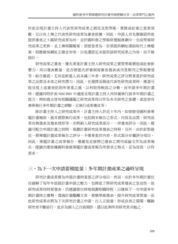 %u570b%u79d1%u6703%u591a%u5e74%u671f%u5c08%u984c%u7814%u7a76%u8a08%u756b%u7533%u8acb%u7d93%u9a57%u5206%u4eab%uff1a%u6cd5%u5f8b%u5b78%u9580%u4e4b%u8996%u89d2109%u65bc%u6b64%u5448%u73fe%u8a08%u756b%u4e3b%u6301%u4eba%u4ee3%u8868%u6027%u7814%u7a76%u6210%u679c%u4e4b%u5275%u898b%u53ca%u5c0d%u5b78%u8853%u3001%u5be6%u52d9%u6216%u793e%u6703%u4e4b%u91cd%u8981%u8ca2%u737b%uff0c%u4e14%u4ee5%u6709%u4e0a%u50b3%u4e4b%u4ee3%u8868%u6027%u7814%u7a76%u6210%u679c%u70ba%u5be9%u67e5%u4f9d%u64da%u3002%u56e0%u6b64%uff0c%u7533%u8acb%u4eba%u9996%u5148%u61c9%u78ba%u8a8d%u6240%u6b32%u63d0%u4f9b%u5be9%u67e5%u4e4b5%u7bc7%u7814%u7a76%u6210%u679c%u70ba%u4f55%uff0c%u4e26%u65bc%u570b%u79d1%u6703%u4e4b%u5b78%u8853%u7814%u767c%u670d%u52d9%u7db2%u4e2d%uff0c%u5b8c%u6210%u5b78%u8853%u7814%u7a76%u6210%u679c%u4e4b%u66f4%u65b0%uff0c%u4e26%u4e0a%u50b3%u76f8%u95dc%u6a94%u6848%uff0c%u9808%u7559%u610f%u8005%u70ba%uff0c%u82e5%u4fc2%u63d0%u4f9b%u7db2%u5740%u9023%u7d50%u53d6%u4ee3%u4e0a%u50b3%u6a94%u6848%uff0c%u5247%u61c9%u78ba%u4fdd%u7db2%u5740%u6b63%u78ba%u4e26%u6709%u6548%uff0c%u4ee5%u514d%u906d%u8a8d%u5b9a%u672a%u63d0%u4f9b%u8a72%u7814%u7a76%u6210%u679c%u4e4b%u5167%u5bb9%uff0c%u800c%u4e0d%u88ab%u63a1%u8a08%u3002%u7814%u7a76%u6210%u679c%u4e4b%u5be9%u67e5%uff0c%u512a%u5148%u8457%u91cd%u8a08%u756b%u4e3b%u6301%u4eba%u7814%u7a76%u6210%u679c%u4e4b%u5be6%u8cea%u5b78%u8853%u50f9%u503c%u6216%u793e%u6703%u5f71%u97ff%u529b%uff0c%u518d%u4ee5%u767c%u8868%u6578%u91cf%u3001%u662f%u5426%u7d93%u533f%u540d%u8a55%u5be9%u5236%u5ea6%u5be9%u67e5%u767c%u8868%u6216%u520a%u767b%u671f%u520a%u4e4b%u5b78%u8853%u8072%u671b%u7b49%uff0c%u7d9c%u5408%u5be9%u8a8d%u3002%u5c24%u5176%u662f%u65b0%u9032%u4eba%u54e1%u672a%u6eff%u4e09%u5e74%u8005%uff0c%u7814%u7a76%u6210%u679c%u4e4b%u8a55%u5206%u5c07%u8457%u91cd%u65bc%u7814%u7a76%u6210%u679c%u4e4b%u54c1%u8cea%u53ca%u672a%u4f86%u4e4b%u7814%u7a76%u6f5b%u529b%u3002%u56e0%u6b64%uff0c%u5728%u9078%u64c7%u53ca%u7c21%u8ff0%u4ee3%u8868%u6027%u7814%u7a76%u6210%u679c%u6642%uff0c%u61c9%u76e1%u53ef%u80fd%u5448%u73fe%u4e0a%u8ff0%u5be9%u67e5%u539f%u5247%u6240%u8457%u91cd%u4e4b%u8655%uff0c%u4ee5%u5229%u53d6%u5f97%u8f03%u9ad8%u4e4b%u5206%u6578%u3002%u800c%u7533%u8acb%u591a%u5e74%u671f%u8a08%u756b%u6642%uff0c%u5efa%u8b70%u540c%u6642%u65bc%u8868NSCH01%u4e2d%u9069%u5ea6%u5448%u73fe%u8a08%u756b%u4e3b%u6301%u4eba%u6240%u5177%u5099%u57f7%u884c%u8a72%u591a%u5e74%u671f%u8a08%u756b%u4e4b%u80fd%u529b%uff0c%u4f8b%u5982%u904e%u53bb%u66fe%u6709%u76f8%u95dc%u8b70%u984c%u4e4b%u7814%u7a76%u6210%u679c%u5f97%u4ee5%u4f5c%u70ba%u672c%u6b21%u7814%u7a76%u4e4b%u57fa%u790e%uff0c%u6216%u662f%u66fe%u6709%u53c3%u8207%u57f7%u884c%u591a%u5e74%u671f%u8a08%u756b%u4e4b%u7d93%u9a57%uff0c%u4e14%u57f7%u884c%u6210%u679c%u512a%u826f%u7b49%u3002%u9664%u8a08%u756b%u4e3b%u6301%u4eba%u4e4b%u7814%u7a76%u6210%u679c%u5916%uff0c%u8a08%u756b%u4e3b%u6301%u4eba%u65bc%u8fd15%u5e74%u5167%uff0c%u5982%u66fe%u63a5%u53d7%u570b%u79d1%u6703%u5c08%u984c%u8a08%u756b%u88dc%u52a9%uff0c%u5c31%u5176%u5be6%u969b%u57f7%u884c%u6210%u679c%uff0c%u5305%u62ec%u671f%u672b%u5831%u544a%u4e4b%u5f62%u5f0f%u3001%u5167%u5bb9%u53ca%u54c1%u8cea%uff0c%u7814%u7a76%u6210%u679c%u6709%u7121%u767c%u8868%u53ca%u767c%u8868%u60c5%u5f62%u7b49%uff0c%u4ea6%u5c07%u7d0d%u5165%u7814%u7a76%u6210%u679c%u90e8%u5206%uff0c%u4e00%u4f75%u5be9%u67e5%u8a55%u5206%u3002%u56e0%u6b64%uff0c%u5efa%u8b70%u53ef%u914d%u5408%u7533%u8acb%u8a08%u756b%u4e4b%u6642%u9593%uff0c%u898f%u5283%u8a08%u756b%u7814%u7a76%u6210%u679c%u767c%u8868%u4e4b%u6642%u7a0b%u3002%u53e6%u5916%uff0c%u7531%u65bc%u91dd%u5c0d%u6700%u8fd1%u4e00%u671f%u5c08%u984c%u8a08%u756b%u6210%u679c%u5831%u544a%u4e4b%u8a55%u5206%uff0c%u4e0d%u50c5%u8457%u91cd%u65bc%u5167%u5bb9%uff0c%u5f62%u5f0f%u90e8%u5206%u4ea6%u5c6c%u8a55%u5206%u9805%u76ee%uff0c%u56e0%u6b64%uff0c%u5c08%u984c%u8a08%u756b%u4e4b%u6210%u679c%u5831%u544a%uff0c%u61c9%u907f%u514d%u76f4%u63a5%u5c07%u5df2%u767c%u8868%u4e4b%u671f%u520a%u6216%u8ad6%u6587%u4f5c%u70ba%u6210%u679c%u5831%u544a%uff0c%u5efa%u8b70%u4ecd%u61c9%u4f9d%u64da%u570b%u79d1%u6703%u5c31%u5c08%u984c%u8a08%u756b%u6210%u679c%u5831%u544a%u6240%u8981%u6c42%u4e4b%u683c%u5f0f%uff0c%u59a5%u70ba%u6539%u5beb%uff0c%u4ee5%u7b26%u8981%u6c42%u3002%u4e09%u3001%u70ba%u4e0b%u4e00%u6b21%u7533%u8acb%u84c4%u7a4d%u80fd%u91cf%uff1a%u591a%u5e74%u671f%u8a08%u756b%u6210%u679c%u4e4b%u9069%u6642%u5448%u73fe%u7814%u7a76%u8a08%u756b%u6210%u679c%u5be6%u70ba%u7533%u8acb%u8a08%u756b%u6642%u91cd%u8981%u4e4b%u8a55%u5206%u9805%u76ee%uff0c%u7136%u800c%uff0c%u7531%u65bc%u591a%u5e74%u671f%u8a08%u756b%u5f80%u5f80%u7de9%u89e3%u4e86%u6bcf%u5e74%u5e74%u5e95%u63d0%u8a08%u756b%u7533%u8acb%u4e4b%u58d3%u529b%uff0c%u4e5f%u964d%u4f4e%u4e86%u5c07%u7814%u7a76%u6210%u679c%u767c%u8868%u4e4b%u6025%u8feb%u6027%uff0c%u6545%u7814%u7a76%u6210%u679c%u4f55%u6642%u8981%u767c%u8868%uff0c%u4ecd%u5efa%u8b70%u9700%u81ea%u5f8b%u5730%u898f%u5283%u76f8%u95dc%u6642%u7a0b%uff0c%u4ee5%u78ba%u4fdd%u4e0b%u4e00%u6b21%u7533%u8acb%u591a%u5e74%u671f%u8a08%u756b%u6642%u4e4b%u512a%u52e2%u3002%u900f%u904e%u8a08%u756b%u919e%u91c0%u6587%u7ae0%uff0c%u7d2f%u7a4d%u5b78%u8853%u767c%u8868%uff0c%u63d0%u5347%u7814%u7a76%u6210%u679c%u8cea%u91cf%uff0c%u800c%u6b64%u7814%u7a76%u6210%u679c%u4ea6%u5c07%u70ba%u4e0b%u6b21%u7814%u7a76%u8a08%u756b%u4e4b%u7533%u8acb%uff0c%u6ce8%u5165%u6b63%u80fd%u91cf%uff0c%u5f62%u6210%u826f%u5584%u4e4b%u5faa%u74b0%uff0c%u9a45%u52d5%u7814%u7a76%u8005%u4e0d%u65b7%u524d%u884c%uff0c%u6b64%u4ea6%u70ba%u500b%u4eba%u4e4b%u81ea%u6211%u671f%u8a31%uff0c%u8b39%u4ee5%u6b64%u8207%u6240%u6709%u7814%u7a76%u8005%u5171%u52c9%u4e4b%u3002
