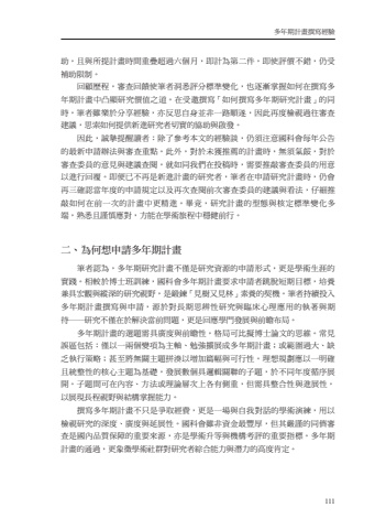 %u591a%u5e74%u671f%u8a08%u756b%u64b0%u5beb%u7d93%u9a57111%u52a9%uff0c%u4e14%u8207%u6240%u63d0%u8a08%u756b%u6642%u9593%u91cd%u758a%u8d85%u904e%u516d%u500b%u6708%uff0c%u5373%u8a08%u70ba%u7b2c%u4e8c%u4ef6%uff0c%u5373%u4f7f%u8a55%u50f9%u4e0d%u932f%uff0c%u4ecd%u53d7%u88dc%u52a9%u9650%u5236%u3002%u56de%u9867%u6b77%u7a0b%uff0c%u5be9%u67e5%u56de%u994b%u4f7f%u7b46%u8005%u6d1e%u6089%u8a55%u5206%u6a19%u6e96%u8b8a%u5316%uff0c%u4e5f%u9010%u6f38%u638c%u63e1%u5982%u4f55%u5728%u64b0%u5beb%u591a%u5e74%u671f%u8a08%u756b%u4e2d%u51f8%u986f%u7814%u7a76%u50f9%u503c%u4e4b%u9053%u3002%u5728%u53d7%u9080%u64b0%u5beb%u300c%u5982%u4f55%u64b0%u5beb%u591a%u5e74%u671f%u7814%u7a76%u8a08%u756b%u300d%u7684%u540c%u6642%uff0c%u7b46%u8005%u96d6%u6a02%u65bc%u5206%u4eab%u7d93%u9a57%uff0c%u4ea6%u53cd%u601d%u81ea%u8eab%u4e26%u975e%u4e00%u8def%u9806%u9042%uff0c%u56e0%u6b64%u518d%u5ea6%u6aa2%u8996%u904e%u5f80%u5be9%u67e5%u5efa%u8b70%uff0c%u601d%u7d22%u5982%u4f55%u63d0%u4f9b%u65b0%u9032%u7814%u7a76%u8005%u5207%u5be6%u7684%u5354%u52a9%u8207%u555f%u767c%u3002%u56e0%u6b64%uff0c%u8aa0%u646f%u63d0%u9192%u8b80%u8005%uff1a%u9664%u4e86%u53c3%u8003%u672c%u6587%u7684%u7d93%u9a57%u8ac7%uff0c%u4ecd%u9808%u6ce8%u610f%u570b%u79d1%u6703%u6bcf%u5e74%u516c%u544a%u7684%u6700%u65b0%u7533%u8acb%u8fa6%u6cd5%u8207%u5be9%u67e5%u91cd%u9ede%u3002%u6b64%u5916%uff0c%u5c0d%u65bc%u672a%u7372%u63a8%u85a6%u7684%u8a08%u756b%u6642%uff0c%u7121%u9808%u6c23%u9912%uff0c%u5c0d%u65bc%u5be9%u67e5%u59d4%u54e1%u7684%u610f%u898b%u8207%u5efa%u8b70%u67e5%u95b1%uff0c%u5c31%u5982%u540c%u6211%u5011%u5728%u6295%u7a3f%u6642%uff0c%u9700%u8981%u63a8%u6572%u5be9%u67e5%u59d4%u54e1%u7684%u7528%u610f%u4ee5%u9032%u884c%u56de%u8986%u3002%u5373%u4fbf%u5df2%u4e0d%u518d%u662f%u65b0%u9032%u8a08%u756b%u7684%u7814%u7a76%u8005%uff0c%u7b46%u8005%u5728%u7533%u8acb%u7814%u7a76%u8a08%u756b%u6642%uff0c%u4ecd%u6703%u518d%u4e09%u78ba%u8a8d%u7576%u5e74%u5ea6%u7684%u7533%u8acb%u898f%u5b9a%u4ee5%u53ca%u518d%u6b21%u67e5%u95b1%u524d%u6b21%u5be9%u67e5%u59d4%u54e1%u7684%u5efa%u8b70%u8207%u770b%u6cd5%uff0c%u4ed4%u7d30%u63a8%u6572%u5982%u4f55%u5728%u524d%u4e00%u6b21%u7684%u8a08%u756b%u4e2d%u66f4%u7cbe%u9032%u3002%u7562%u7adf%uff0c%u7814%u7a76%u8a08%u756b%u7684%u578b%u614b%u8207%u6838%u5b9a%u6a19%u6e96%u8b8a%u5316%u591a%u7aef%uff0c%u719f%u6089%u4e14%u8b39%u614e%u61c9%u5c0d%uff0c%u65b9%u80fd%u5728%u5b78%u8853%u65c5%u7a0b%u4e2d%u7a69%u5065%u524d%u884c%u3002%u4e8c%u3001%u70ba%u4f55%u60f3%u7533%u8acb%u591a%u5e74%u671f%u8a08%u756b%u7b46%u8005%u8a8d%u70ba%uff0c%u591a%u5e74%u671f%u7814%u7a76%u8a08%u756b%u4e0d%u50c5%u662f%u7814%u7a76%u8cc7%u6e90%u7684%u7533%u8acb%u5f62%u5f0f%uff0c%u66f4%u662f%u5b78%u8853%u751f%u6daf%u7684%u5be6%u8e10%u3002%u76f8%u8f03%u65bc%u535a%u58eb%u73ed%u8a13%u7df4%uff0c%u570b%u79d1%u6703%u591a%u5e74%u671f%u8a08%u756b%u8981%u6c42%u7533%u8acb%u8005%u8df3%u812b%u77ed%u671f%u76ee%u6a19%uff0c%u57f9%u990a%u517c%u5177%u5b8f%u89c0%u8207%u7e31%u6df1%u7684%u7814%u7a76%u8996%u91ce%uff0c%u662f%u935b%u934a%u300c%u898b%u6a39%u53c8%u898b%u6797%u300d%u7d20%u990a%u7684%u5951%u6a5f%u3002%u7b46%u8005%u6301%u7e8c%u6295%u5165%u591a%u5e74%u671f%u8a08%u756b%u64b0%u5beb%u8207%u7533%u8acb%uff0c%u6e90%u65bc%u5c0d%u9577%u671f%u601d%u8fa8%u6027%u7814%u7a76%u8207%u81e8%u5e8a%u5fc3%u7406%u61c9%u7528%u7684%u57f7%u8457%u8207%u671f%u5f85%u7814%u7a76%u4e0d%u50c5%u5728%u65bc%u89e3%u6c7a%u7576%u524d%u554f%u984c%uff0c%u66f4%u662f%u56de%u61c9%u5b78%u9580%u767c%u5c55%u8207%u524d%u77bb%u5e03%u5c40%u3002%u591a%u5e74%u671f%u8a08%u756b%u7684%u9078%u984c%u9700%u5177%u5ee3%u5ea6%u8207%u524d%u77bb%u6027%uff0c%u683c%u5c40%u53ef%u6bd4%u64ec%u535a%u58eb%u8ad6%u6587%u7684%u601d%u7dad%u3002%u5e38%u898b%u8aa4%u5340%u5305%u62ec%uff1a%u50c5%u4ee5%u4e00%u5169%u500b%u8b8a%u9805%u70ba%u4e3b%u8ef8%u3001%u52c9%u5f37%u64f4%u5c55%u6210%u591a%u5e74%u671f%u8a08%u756b%uff1b%u6216%u7bc4%u570d%u904e%u5927%u3001%u7f3a%u4e4f%u57f7%u884c%u7b56%u7565%uff1b%u751a%u81f3%u5c07%u7121%u95dc%u4e3b%u984c%u62fc%u6e4a%u4ee5%u589e%u52a0%u7bc7%u5e45%u8207%u53ef%u884c%u6027%u3002%u7406%u60f3%u898f%u5283%u61c9%u4ee5%u4e00%u660e%u78ba%u4e14%u7d71%u6574%u6027%u7684%u6838%u5fc3%u4e3b%u984c%u70ba%u57fa%u790e%uff0c%u767c%u5c55%u6578%u500b%u5177%u908f%u8f2f%u95dc%u806f%u7684%u5b50%u984c%uff0c%u65bc%u4e0d%u540c%u5e74%u5ea6%u5faa%u5e8f%u5c55%u958b%u3002%u5b50%u984c%u9593%u53ef%u5728%u5167%u5bb9%u3001%u65b9%u6cd5%u6216%u7406%u8ad6%u5c64%u6b21%u4e0a%u5404%u6709%u5074%u91cd%uff0c%u4f46%u9700%u5177%u6574%u5408%u6027%u8207%u9032%u5c55%u6027%uff0c%u4ee5%u5c55%u73fe%u9577%u7a0b%u8996%u91ce%u8207%u7d50%u69cb%u638c%u63e1%u80fd%u529b%u3002%u64b0%u5beb%u591a%u5e74%u671f%u8a08%u756b%u4e0d%u53ea%u662f%u722d%u53d6%u7d93%u8cbb%uff0c%u66f4%u662f%u4e00%u5834%u8207%u81ea%u6211%u5c0d%u8a71%u7684%u5b78%u8853%u6f14%u7df4%uff0c%u7528%u4ee5%u6aa2%u8996%u7814%u7a76%u7684%u6df1%u5ea6%u3001%u5ee3%u5ea6%u8207%u5ef6%u5c55%u6027%u3002%u570b%u79d1%u6703%u96d6%u975e%u8cc7%u91d1%u6700%u8c50%u539a%uff0c%u4f46%u5176%u56b4%u8b39%u7684%u540c%u5115%u5be9%u67e5%u662f%u570b%u5167%u54c1%u8cea%u4fdd%u969c%u7684%u91cd%u8981%u4f86%u6e90%uff0c%u4ea6%u662f%u5b78%u8853%u5347%u7b49%u8207%u6a5f%u69cb%u8003%u8a55%u7684%u91cd%u8981%u6307%u6a19%u3002%u591a%u5e74%u671f%u8a08%u756b%u7684%u901a%u904e%uff0c%u66f4%u8c61%u5fb5%u5b78%u8853%u793e%u7fa4%u5c0d%u7814%u7a76%u8005%u7d9c%u5408%u80fd%u529b%u8207%u6f5b%u529b%u7684%u9ad8%u5ea6%u80af%u5b9a%u3002