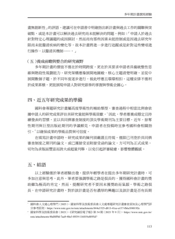 %u591a%u5e74%u671f%u8a08%u756b%u64b0%u5beb%u7d93%u9a57113%u756b%u7121%u5275%u65b0%u6027%u300d%u7684%u8a55%u8a9e%u3002%u5efa%u8b70%u53ef%u5728%u7533%u8acb%u66f8%u4e2d%u660e%u78ba%u6307%u51fa%u65b0%u8a08%u756b%u8207%u904e%u53bb%u5de5%u4f5c%u7684%u95dc%u806f%u8207%u7a81%u7834%u9ede%uff0c%u6216%u662f%u672c%u8a08%u756b%u53ef%u4ee5%u89e3%u6c7a%u904e%u53bb%u7814%u7a76%u5c1a%u672a%u80fd%u89e3%u6c7a%u7684%u554f%u984c%u3002%u4f8b%u5982%uff1a%u300c%u7533%u8acb%u4eba%u65bc%u904e%u53bb%u91dd%u5c0d%u7279%u5b9a%u5fc3%u7406%u8b70%u984c%u7684%u6210%u56e0%u63a2%u8a0e%uff0c%u7136%u800c%u5c1a%u6709%u90a3%u4e9b%u56e0%u7d20%u672a%u80fd%u63a7%u5236%u6216%u662f%u56e0%u904e%u53bb%u7814%u7a76%u5e74%u9650%u5c1a%u672a%u80fd%u91d0%u6e05%u75be%u75c5%u7684%u8b8a%u5316%u7b49%uff0c%u6545%u672c%u8a08%u756b%u5c07%u9032%u4e00%u6b65%u9032%u884c%u8ffd%u8e64%u6216%u662f%u91dd%u5c0d%u9019%u4e9b%u8b8a%u9805%u9032%u884c%u64cd%u4f5c%uff0c%u4ee5%u91d0%u6e05%u5176%u6a5f%u5236%u22ef%u22ef%u3002%u300d%uff08%u4e94%uff09%u990a%u6210%u524d%u77bb%u8207%u6574%u5408%u7684%u7814%u7a76%u8996%u91ce%u591a%u5e74%u671f%u8a08%u756b%u7684%u50f9%u503c%u4e0d%u50c5%u5728%u65bc%u6642%u9593%u8de8%u5ea6%uff0c%u66f4%u5728%u65bc%u5176%u8981%u6c42%u7533%u8acb%u8005%u5177%u5099%u7d71%u6574%u6027%u601d%u7dad%u8207%u968e%u6bb5%u6027%u898f%u5283%u80fd%u529b%u3002%u7814%u7a76%u67b6%u69cb%u61c9%u50cf%u5c55%u958b%u5730%u5716%u822c%uff0c%u6838%u5fc3%u4e3b%u984c%u6e05%u695a%u660e%u78ba%uff0c%u4e26%u5f9e%u4e2d%u5c55%u958b%u6578%u500b%u5b50%u984c%uff0c%u65bc%u4e0d%u540c%u5e74%u5ea6%u9010%u6b65%u9032%u884c%uff0c%u5f7c%u6b64%u547c%u61c9%u4e14%u74b0%u74b0%u76f8%u6263%u3002%u9019%u7a2e%u5b89%u6392%u4e0d%u50c5%u5229%u65bc%u6210%u679c%u7d2f%u7a4d%uff0c%u66f4%u80fd%u5c55%u73fe%u7533%u8acb%u4eba%u5c0d%u7814%u7a76%u7bc0%u594f%u7684%u638c%u63e1%u8207%u5b78%u8853%u4f01%u5716%u5fc3%u3002%u56db%u3001%u8fd1%u4e94%u5e74%u7814%u7a76%u6210%u679c%u7684%u6e96%u5099%u570b%u79d1%u6703%u5c08%u984c%u7814%u7a76%u8a08%u756b%u5c6c%u9ad8%u5ea6%u5b78%u8853%u6027%u7684%u88dc%u52a9%u985e%u578b%uff0c%u5be9%u67e5%u904e%u7a0b%u4e2d%u76f8%u7576%u6bd4%u4f8b%u6703%u4f9d%u64da%u7533%u8acb%u4eba%u7684%u7814%u7a76%u6210%u679c%u8a55%u4f30%u5176%u7814%u7a76%u91cf%u80fd%u8207%u5b78%u8853%u8ca2%u737b%u30021%u56e0%u6b64%uff0c%u5b78%u8005%u61c9%u990a%u6210%u7a69%u5b9a%u4e14%u6301%u7e8c%u767c%u8868%u7684%u7fd2%u6163%uff0c%u4e26%u4ee5%u5177%u540c%u5115%u5be9%u67e5%u5236%u5ea6%u7684%u9802%u5c16%u5b78%u8853%u671f%u520a%u70ba%u4e3b%u8981%u76ee%u6a19%u3002%u8fd1%u5e74%uff0c%u63a0%u596a%u6027%u671f%u520a%u8207%u5de8%u578b%u51fa%u7248%u793e%u671f%u520a%u7684%u722d%u8b70%u983b%u898b%uff0c%u7533%u8acb%u8005%u5728%u6295%u7a3f%u6642%u5b9c%u53c3%u8003%u570b%u79d1%u6703%u76f8%u95dc%u6307%u5f15%uff0c2%u4ee5%u78ba%u4fdd%u6210%u679c%u7684%u5b78%u8853%u54c1%u8cea%u8207%u53ef%u4fe1%u5ea6%u3002%u5728%u586b%u5beb%u8a08%u756b%u7533%u8acb%u6642%uff0c%u7814%u7a76%u6210%u679c%u7684%u9673%u5217%u9808%u56b4%u8b39%u4e14%u7b26%u898f%u3002%u50c5%u9650%u5df2%u520a%u767b%u65bc%u5177%u540c%u5115%u5be9%u67e5%u5236%u5ea6%u4e4b%u671f%u520a%u7684%u8ad6%u6587%uff0c%u6216%u5df2%u7372%u63a5%u53d7%u4e26%u9644%u63a5%u53d7%u51fd%u7684%u8ad6%u6587%uff0c%u65b9%u53ef%u5217%u70ba%u6b63%u5f0f%u6210%u679c%u3002%u5207%u52ff%u70ba%u6c42%u7248%u9762%u8c50%u5bcc%u800c%u8a87%u5927%u6216%u8d85%u91cf%u5217%u8209%uff0c%u4ee5%u514d%u5f15%u8d77%u8a55%u5be9%u7591%u616e%uff0c%u5f71%u97ff%u6574%u9ad4%u89c0%u611f%u3002%u4e94%u3001%u7d50%u8a9e%u4ee5%u4e0a%u7d93%u9a57%u50c5%u65bc%u7b46%u8005%u7d93%u9a57%u51fa%u767c%uff0c%u63d0%u4f9b%u5e74%u8f15%u5b78%u8005%u5728%u63d0%u51fa%u591a%u5e74%u671f%u7814%u7a76%u8a08%u756b%u6642%uff0c%u53ef%u591a%u52a0%u6ce8%u610f%u8207%u601d%u8003%u3002%u6b64%u5916%uff0c%u7b46%u8005%u8981%u5f37%u8abf%u5b78%u8853%u4e4b%u8def%u662f%u5f88%u9577%u7684%uff0c%u7372%u5f97%u570b%u79d1%u6703%u8a08%u756b%u7684%u734e%u52a9%u96d6%u70ba%u6975%u9ad8%u7684%u80af%u5b9a%uff0c%u7136%u800c%uff0c%u63d0%u9192%u7814%u7a76%u8005%u4e0d%u8981%u56e0%u672a%u7372%u734e%u52a9%u800c%u6c23%u9912%u3002%u5b78%u8853%u4e4b%u8def%u5f88%u9577%uff0c%u5728%u7533%u8acb%u7814%u7a76%u8a08%u756b%u6642%uff0c%u5c0d%u65bc%u8a72%u8a08%u756b%u662f%u5426%u6709%u6fc3%u539a%u7684%u8208%u8da3%u4ee5%u53ca%u8a72%u8a08%u756b%u662f%u5426%u6709%u9577%u671f1%u570b%u79d1%u6703%u4eba%u6587%u8655%u5fc3%u7406%u5b78%u9580%uff082025%uff09%u3002%u570b%u5bb6%u79d1%u5b78%u53ca%u6280%u8853%u59d4%u54e1%u6703%u4eba%u6587%u8655%u5c08%u984c%u7814%u7a76%u8a08%u756b%u5be9%u67e5%u9808%u77e5%u53ca%u5fc3%u7406%u5b78%u9580%u8a55%u5206%u53c3%u8003%u539f%u5247%u3002https://www.nstc.gov.tw/nstc/attachments/844e3525-d813-41ee-a157-fb6e5f40192e2%u570b%u5bb6%u79d1%u5b78%u53ca%u6280%u8853%u59d4%u54e1%u6703%uff082023%uff09%u3002%u300a%u7814%u7a76%u8aa0%u4fe1%u96fb%u5b50%u5831%u300b%u7b2c54%u671f%uff082023%u5e749%u6708%uff09%u3002https://www.nstc.gov.tw/nstc/attachments/4bd8ff9d-7aa9-40a5-8939-116019e8895d?