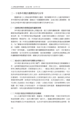 116%u4eba%u6587%u8207%u793e%u6703%u79d1%u5b78%u7c21%u8a0a%u300026%u53774%u671f%uff0e114%u5e749%u6708%u4e8c%u3001%u5341%u9805%u591a%u5e74%u671f%u8a08%u756b%u64b0%u5beb%u6280%u5de7%u5206%u4eab%u61c9%u570b%u79d1%u6703%u300a%u4eba%u6587%u8207%u793e%u6703%u79d1%u5b78%u7c21%u8a0a%u300b%u9080%u8acb%uff0c%u7b46%u8005%u5f59%u6574%u591a%u5e74%u65bc%u4eba%u6587%u8655%u7533%u8acb%u8207%u57f7%u884c%u591a%u5e74%u671f%u7814%u7a76%u8a08%u756b%u7684%u7d93%u9a57%uff0c%u6b78%u7d0d%u51fa%u5341%u9805%u95dc%u9375%u64b0%u5beb%u7b56%u7565%uff0c%u4e26%u7d50%u5408%u500b%u4eba%u5be6%u52d9%u6b77%u7a0b%uff0c%u671f%u70ba%u6709%u5fd7%u7533%u8acb%u591a%u5e74%u671f%u8a08%u756b%u7684%u7814%u7a76%u8005%u63d0%u4f9b%u5177%u9ad4%u53ef%u884c%u7684%u53c3%u8003%u65b9%u5411%u3002%uff08%u4e00%uff09%u5efa%u69cb%u6e05%u6670%u7684%u6574%u9ad4%u85cd%u5716%u8207%u908f%u8f2f%u67b6%u69cb%u591a%u5e74%u671f%u8a08%u756b%u7684%u64b0%u5beb%u61c9%u5f9e%u6838%u5fc3%u554f%u984c%u51fa%u767c%uff0c%u5efa%u7acb%u5b8c%u6574%u7684%u908f%u8f2f%u7d50%u69cb%u3002%u5efa%u8b70%u5584%u7528%u908f%u8f2f%u6846%u67b6%u6216%u7406%u8ad6%u5c0e%u5411%u6a21%u578b%uff0c%u5283%u5206%u51fa%u5404%u5e74%u671f%u76ee%u6a19%u548c%u767c%u5c55%u968e%u6bb5%u3002%u4ee5%u7b46%u8005%u66fe%u7533%u8acb%u4e4b%u8a08%u756b%u6848%u70ba%u4f8b%uff1a%u7b2c%u4e00%u5e74%u53ef%u805a%u7126%u65bc%u5960%u5b9a%u7406%u8ad6%u57fa%u790e%uff0c%u4e26%u9032%u884c%u6559%u5177%u6216%u6578%u4f4d%u5de5%u5177%u7684%u8a2d%u8a08%u3001%u521d%u6b65%u958b%u767c%u8207%u7b2c%u4e00%u968e%u6bb5%u8a55%u4f30%uff1b%u7b2c%u4e8c%u5e74%u5247%u9032%u884c%u7522%u54c1%u7684%u529f%u80fd%u64f4%u5145%u3001%u4e2d%u671f%u4fee%u6b63%u6216%u64f4%u5927%u898f%u6a21%u7684%u5be6%u8b49%u7814%u7a76%uff1b%u7b2c%u4e09%u5e74%u5247%u5b8c%u6210%u6574%u9ad4%u7814%u767c%u8207%u61c9%u7528%u63a8%u5ee3%uff0c%u4e26%u540c%u6b65%u5c55%u958b%u6210%u679c%u767c%u8868%u6216%u5be6%u52d9%u8f49%u5316%u3002%u70ba%u4e86%u8b93%u5be9%u67e5%u8005%u6e05%u695a%u638c%u63e1%u6574%u9ad4%u7814%u7a76%u7684%u767c%u5c55%u8def%u5f91%uff0c%u5efa%u8b70%u5728%u64b0%u5beb%u5206%u5e74%u7814%u7a76%u76ee%u7684%u4e4b%u524d%uff0c%u5148%u7e6a%u88fd%u4e00%u5f35%u6f38%u9032%u5f0f%u7814%u7a76%u85cd%u5716%u3002%u5982%u6b64%u53ef%u5728%u9032%u5165%u5e74%u5ea6%u7d30%u7bc0%u524d%uff0c%u63d0%u4f9b%u5be9%u67e5%u8005%u4e00%u76ee%u4e86%u7136%u7684%u300c%u7814%u7a76%u5730%u5716%u300d%uff0c%u8fc5%u901f%u7406%u89e3%u8a08%u756b%u7684%u908f%u8f2f%u8108%u7d61%u8207%u9032%u5c55%u968e%u6bb5%u3002%u6b64%u5916%uff0c%u82e5%u8a08%u756b%u6d89%u53ca%u7cfb%u7d71%u958b%u767c%uff0c%u4e5f%u53ef%u5728%u7814%u7a76%u65b9%u6cd5%u7ae0%u7bc0%u7e6a%u88fd%u4e00%u5f35%u7cfb%u7d71%u67b6%u69cb%u5716%uff0c%u4ee5%u8aaa%u660e%u5404%u529f%u80fd%u6a21%u7d44%u4e4b%u9593%u7684%u908f%u8f2f%u95dc%u4fc2%u8207%u6574%u9ad4%u904b%u4f5c%u9810%u671f%uff0c%u5716%u50cf%u5316%u7684%u5448%u73fe%u6709%u52a9%u65bc%u63d0%u5347%u8a08%u756b%u66f8%u7684%u53ef%u8b80%u6027%u3002%uff08%u4e8c%uff09%u7d44%u6210%u5177%u4e92%u88dc%u6027%u7684%u7814%u7a76%u5718%u968a%u4e26%u660e%u78ba%u5206%u5de5%u591a%u5e74%u671f%u8a08%u756b%u6709%u6642%u5019%u4e26%u975e%u55ae%u6253%u7368%u9b25%uff0c%u5076%u723e%u53ef%u80fd%u9700%u8981%u8de8%u9818%u57df%u751a%u81f3%u8de8%u570b%u5718%u968a%u5408%u4f5c%u3002%u9019%u6642%u61c9%u660e%u78ba%u8aaa%u660e%u6bcf%u4f4d%u6210%u54e1%u7684%u5b78%u8853%u80cc%u666f%u8207%u8077%u8cac%uff0c%u4f8b%u5982%u4e3b%u6301%u4eba%u4e00%u822c%u90fd%u9700%u8981%u7d71%u6574%u7814%u7a76%u4e3b%u8ef8%u8207%u54c1%u8cea%u76e3%u7763%uff1b%u82e5%u9700%u8981%u5354%u540c%u4e3b%u6301%u4eba%uff0c%u4e00%u822c%u662f%u4ee5%u5c08%u9577%u4e92%u88dc%u7684%u5b78%u8005%u70ba%u4e3b%uff0c%u5176%u6b21%u4e5f%u53ef%u4ee5%u627e%u5177%u6709%u52a0%u4e58%u4f5c%u7528%u7684%u5b78%u8005%uff0c%u5c24%u5176%u4eba%u6587%u8655%u8a31%u591a%u7533%u8acb%u4eba%u4e26%u975e%u6280%u8853%u5c08%u9577%uff0c%u53ef%u4ee5%u627e%u5177%u6709%u79d1%u6280%u80cc%u666f%u7684%u5354%u540c%u4e3b%u6301%u4eba%u652f%u6301%uff1b%u6216%u8005%u79d1%u6280%u80cc%u666f%u70ba%u4e3b%u7684%u7533%u8acb%u4eba%u5728%u4eba%u6587%u8655%u7533%u8acb%u8a08%u756b%u6848%u6642%uff0c%u53ef%u4ee5%u627e%u5177%u6709%u6559%u80b2%u6216%u8005%u4eba%u6587%u80cc%u666f%u7684%u5354%u540c%u4e3b%u6301%u4eba%u652f%u6301%uff0c%u5354%u52a9%u91cf%u5316%u5206%u6790%u6216%u9818%u57df%u7684%u8cea%u6027%u8a6e%u91cb%u3002%u5982%u679c%u7576%u4e2d%u6709%u4e9b%u6210%u54e1%u66fe%u5171%u540c%u5408%u4f5c%u904e%uff0c%u5c24%u5176%u662f%u5354%u540c%u4e3b%u6301%u4eba%uff0c%u5efa%u8b70%u53ef%u4ee5%u9644%u4e0a%u5148%u524d%u7522%u51fa%uff08%u5982%u5408%u8457%u8ad6%u6587%u3001%u8a08%u756b%uff09%uff0c%u4ee5%u5f37%u5316%u53ef%u4fe1%u5ea6%u3002%u81f3%u65bc%u52a9%u7406%u8207%u535a%u58eb%u751f%u7684%u898f%u5283%uff0c%u9664%u4e86%u627f%u64d4%u4eba%u624d%u57f9%u80b2%u529f%u80fd%u5916%uff0c%u4ea6%u53ef%u5354%u52a9%u9032%u884c%u8cc7%u6599%u8490%u96c6%u3001%u6578%u64da%u8655%u7406%u8207%u7814%u767c%u6a21%u7d44%u7684%u5be6%u4f5c%uff0c%u6709%u6548%u652f%u63f4%u5404%u968e%u6bb5%u7814%u7a76%u4efb%u52d9%u7684%u63a8%u5c55%u3002%uff08%u4e09%uff09%u5e74%u5ea6%u8a08%u756b%u8a2d%u8a08%u8207%u968e%u6bb5%u6027%u8a55%u4f30%u6a5f%u5236%u5728%u4eba%u6587%u8655%u7533%u8acb%u591a%u5e74%u671f%u8a08%u756b%u6642%uff0c%u5efa%u8b70%u6bcf%u4e00%u5e74%u90fd%u61c9%u6709%u660e%u78ba%u3001%u53ef%u57f7%u884c%u7684%u7814%u7a76%u76ee%u7684%u548c%u6210%u679c%u6307%u6a19%uff08%u8a55%u4f30%uff09%uff0c%u800c%u975e%u542b%u7cca%u4e0d%u6e05%u7684%u300c%u9032%u884c%u4e2d%u300d%u3002%u5efa%u8b70%u5728%u64b0%u5beb%u9810%u671f%u6210%u679c%u6642%uff0c%u4ee5%u8868%u683c%u6216%u7518%u7279%u5716%u5f62%u5f0f%u5206%u5e74%u5ea6%u6e05%u695a%u5448%u73fe%uff1a%u5305%u542b%u5404%u5e74%u5ea6%u7684%u4efb%u52d9%u5b89%u6392%u8207%u9810%u671f%u5b8c%u6210%u6642%u7a0b%u3001%u5c0d