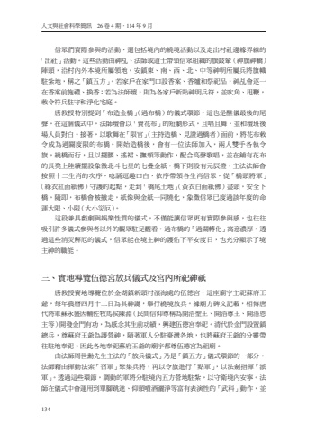 134%u4eba%u6587%u8207%u793e%u6703%u79d1%u5b78%u7c21%u8a0a%u300026%u53774%u671f%uff0e114%u5e749%u6708%u4fe1%u773e%u5011%u5be6%u969b%u53c3%u8207%u7684%u6d3b%u52d5%uff0c%u9084%u5305%u62ec%u5883%u5167%u7684%u7e5e%u5883%u6d3b%u52d5%u4ee5%u53ca%u8d70%u51fa%u6751%u793e%u908a%u7de3%u754c%u7dda%u7684%u300c%u51fa%u793e%u300d%u6d3b%u52d5%u3002%u9019%u4e9b%u6d3b%u52d5%u7531%u795e%u4e69%u3001%u6cd5%u5e2b%u6216%u9053%u58eb%u5e36%u9818%u4fe1%u773e%u7d44%u7e54%u7684%u65d7%u9f13%u8f26%uff08%u795e%u65d7%u795e%u8f4e%uff09%u9663%u982d%uff0c%u6cbf%u6751%u5167%u5916%u672c%u5883%u6240%u5c6c%u9818%u5730%uff0c%u5b89%u93ae%u6771%u3001%u5357%u3001%u897f%u3001%u5317%u3001%u4e2d%u7b49%u795e%u660e%u6240%u5c6c%u5175%u5c07%u65d7%u5e5f%u99d0%u7d2e%u5730%uff0c%u7a31%u4e4b%u300c%u93ae%u4e94%u65b9%u300d%u3002%u82e5%u5bb6%u6236%u5728%u5bb6%u9580%u53e3%u8a2d%u9999%u6848%u3001%u9999%u7210%u548c%u796d%u7940%u54c1%uff0c%u795e%u4e69%u6703%u9010%u4e00%u5728%u9999%u6848%u524d%u65bd%u79ae%u3001%u63db%u9999%uff1b%u82e5%u70ba%u6cd5%u5e2b%u58c7%uff0c%u5247%u70ba%u5404%u5bb6%u6236%u65b0%u8cbc%u795e%u660e%u5175%u7b26%uff0c%u4e26%u5439%u89d2%u3001%u7529%u97ad%uff0c%u6555%u4ee4%u7b26%u5175%u99d0%u5b88%u548c%u6de8%u5316%u5b85%u5ead%u3002%u5510%u6559%u6388%u7279%u5225%u63d0%u5230%u300c%u5e03%u9020%u91d1%u6a4b%u300d%uff08%u904e%u5e03%u6a4b%uff09%u7684%u5100%u5f0f%u74b0%u7bc0%uff0c%u9019%u4e5f%u662f%u91ae%u5100%u6700%u5f8c%u7684%u5c3e%u8072%u3002%u5728%u9019%u500b%u5100%u5f0f%u4e2d%uff0c%u6cd5%u5e2b%u58c7%u6703%u4ee5%u300c%u8ce3%u82b1%u5e03%u300d%u7684%u77ed%u5287%u5f62%u5f0f%uff0c%u4e14%u5531%u4e14%u821e%uff0c%u4e26%u548c%u58c7%u73ed%u5f8c%u5834%u4eba%u54e1%u5c0d%u767d%u3002%u63a5%u8457%uff0c%u4ee5%u6b4c%u821e%u5728%u300c%u9650%u5b98%u300d%uff08%u4e3b%u6301%u9020%u6a4b%u3001%u898b%u8b49%u904e%u6a4b%u8005%uff09%u9762%u524d%uff0c%u5c07%u82b1%u5e03%u6555%u4ee4%u6210%u70ba%u904e%u95dc%u5ea6%u9650%u7684%u5e03%u6a4b%u3002%u958b%u59cb%u9020%u6a4b%u5f8c%uff0c%u6703%u6709%u4e00%u4f4d%u6cd5%u5e2b%u52a0%u5165%uff0c%u5169%u4eba%u96d9%u624b%u5404%u57f7%u4ee4%u65d7%uff0c%u7e5e%u6a4b%u800c%u884c%uff0c%u4e14%u4ee5%u64fa%u8170%u3001%u6416%u88d9%u3001%u64ab%u9830%u7b49%u52d5%u4f5c%uff0c%u914d%u5408%u9ad8%u8072%u6b4c%u5531%uff0c%u4e26%u5728%u92ea%u6709%u82b1%u5e03%u7684%u9577%u51f3%u4e0a%u9678%u7e8c%u64fa%u8a2d%u8c61%u5fb5%u5317%u6597%u4e03%u661f%u7684%u4e03%u758a%u91d1%u7d19%uff0c%u6a4b%u4e0b%u5247%u8a2d%u6709%u5143%u8fb0%u71c8%u3002%u4e3b%u6cd5%u6cd5%u5e2b%u6703%u6309%u7167%u5341%u4e8c%u751f%u8096%u7684%u6b21%u5e8f%uff0c%u5538%u8aa6%u9017%u8da3%u53e3%u767d%uff0c%u4f9d%u5e8f%u5e36%u9818%u5404%u751f%u8096%u4fe1%u773e%uff0c%u5f9e%u300c%u6a4b%u982d%u5c07%u8ecd%u300d%uff08%u7da0%u8863%u7d05%u9762%u7d19%u4f5b%uff09%u5b88%u8b77%u7684%u8d77%u9ede%uff0c%u8d70%u5230%u300c%u6a4b%u5c3e%u571f%u5730%u300d%uff08%u9ec3%u8863%u767d%u9762%u7d19%u4f5b%uff09%u76e1%u982d%uff0c%u5b89%u5168%u4e0b%u6a4b%u3002%u96a8%u5373%uff0c%u5e03%u6a4b%u6703%u88ab%u64a4%u8d70%uff0c%u7d19%u50cf%u8207%u91d1%u7d19%u4e00%u540c%u71d2%u5316%uff0c%u8c61%u5fb5%u4fe1%u773e%u5df2%u5ea6%u904e%u8a72%u5e74%u5ea6%u7684%u547d%u904b%u5927%u9650%u3001%u5c0f%u9650%uff08%u5927%u5c0f%u707d%u5384%uff09%u3002%u9019%u6bb5%u517c%u5177%u6232%u5287%u8207%u5a1b%u6a02%u6027%u8cea%u7684%u5100%u5f0f%uff0c%u4e0d%u50c5%u80fd%u8b93%u4fe1%u773e%u66f4%u6709%u5be6%u969b%u53c3%u8207%u611f%uff0c%u4e5f%u5f80%u5f80%u5438%u5f15%u8a31%u591a%u5100%u5f0f%u53c3%u8207%u8005%u4ee5%u5916%u7684%u89c0%u773e%u99d0%u8db3%u89c0%u770b%u3002%u904e%u5e03%u6a4b%u7684%u300c%u904e%u95dc%u8f49%u5316%u300d%u5bd3%u610f%u6fc3%u539a%uff0c%u900f%u904e%u9019%u4e9b%u6d88%u707d%u89e3%u5384%u7684%u5100%u5f0f%uff0c%u4fe1%u773e%u80fd%u5728%u5883%u4e3b%u795e%u7684%u8b77%u4f51%u4e0b%u5e73%u5b89%u5ea6%u65e5%uff0c%u4e5f%u5145%u5206%u986f%u793a%u4e86%u5883%u4e3b%u795e%u7684%u8077%u80fd%u3002%u4e09%u3001%u5be6%u5730%u5c0e%u89bd%u4f0d%u5fb7%u5bae%u653e%u5175%u5100%u5f0f%u53ca%u5bae%u5167%u6240%u7940%u795e%u7947%u5510%u6559%u6388%u5be6%u5730%u5c0e%u89bd%u4f4d%u65bc%u91d1%u6e56%u93ae%u65b0%u982d%u6751%u6ff1%u6d77%u8655%u7684%u4f0d%u5fb7%u5bae%u3002%u9019%u5ea7%u5edf%u5b87%u4e3b%u7940%u8607%u5e9c%u738b%u723a%uff0c%u6bcf%u5e74%u8fb2%u66c6%u56db%u6708%u5341%u4e8c%u65e5%u70ba%u5176%u795e%u8a95%uff0c%u8209%u884c%u7e5e%u5883%u653e%u5175%u3002%u64da%u5edf%u65b9%u7891%u6587%u8a18%u8f09%uff0c%u76f8%u50b3%u5510%u4ee3%u5c07%u8ecd%u8607%u6c38%u76db%u56e0%u8f14%u4f50%u7267%u99ac%u4faf%u9673%u6df5%uff08%u6c11%u9593%u4fe1%u4ef0%u5c0a%u7a31%u70ba%u958b%u6d6f%u8056%u738b%u3001%u958b%u6d6f%u5c0a%u738b%u3001%u958b%u6d6f%u6069%u4e3b%u7b49%uff09%u958b%u767c%u91d1%u9580%u6709%u529f%uff0c%u70ba%u611f%u5ff5%u5176%u751f%u524d%u529f%u7e3e%uff0c%u8208%u5efa%u4f0d%u5fb7%u5bae%u5949%u7940%u3002%u6e05%u4ee3%u65bc%u91d1%u9580%u8a2d%u7f6e%u93ae%u7e3d%u5175%uff0c%u5c0a%u8607%u5e9c%u738b%u723a%u70ba%u8b77%u71df%u795e%uff0c%u96a8%u8457%u8ecd%u4eba%u5206%u99d0%u81fa%u7063%u5404%u5730%uff0c%u4e5f%u5c07%u8607%u5e9c%u738b%u723a%u7684%u5206%u9748%u5e36%u5f80%u99d0%u5730%u5949%u7940%uff0c%u56e0%u6b64%u5404%u5730%u5949%u7940%u8607%u5e9c%u738b%u723a%u7684%u5edf%u5b87%u90fd%u5c0a%u4f0d%u5fb7%u5bae%u70ba%u7956%u5edf%u3002%u7531%u6cd5%u5e2b%u5468%u4e16%u52f3%u5148%u751f%u4e3b%u6cd5%u7684%u300c%u653e%u5175%u5100%u5f0f%u300d%u4e43%u662f%u300c%u93ae%u4e94%u65b9%u300d%u5100%u5f0f%u74b0%u7bc0%u7684%u4e00%u90e8%u5206%u3002%u6cd5%u5e2b%u85c9%u7531%u63ee%u52d5%u6cd5%u7d22%u300c%u53ec%u8ecd%u300d%u805a%u96c6%u5175%u5c07%uff0c%u518d%u4ee5%u4ee4%u65d7%u9032%u884c%u300c%u9ede%u8ecd%u300d%uff0c%u4ee5%u6cd5%u528d%u6307%u63ee%u300c%u6d3e%u8ecd%u300d%u3002%u900f%u904e%u9019%u4e9b%u74b0%u7bc0%uff0c%u8abf%u52d5%u7684%u8ecd%u5c07%u5206%u99d0%u5883%u5167%u4e94%u65b9%u71df%u5730%u99d0%u7d2e%uff0c%u4ee5%u5b88%u885b%u5883%u5167%u5b89%u5be7%u3002%u6cd5%u5e2b%u5728%u5100%u5f0f%u4e2d%u6703%u904b%u7528%u5230%u55ae%u8173%u8df3%u9032%u3001%u4ef0%u982d%u5674%u9152%u7051%u6de8%u7b49%u5bcc%u6709%u8868%u6f14%u6027%u7684%u300c%u6b66%u79d1%u300d%u52d5%u4f5c%uff0c%u4e26