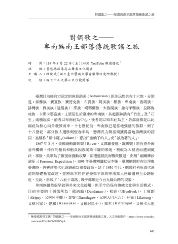 %u5c0d%u5076%u6b4c%u4e4b%u5351%u5357%u65cf%u5357%u738b%u90e8%u843d%u50b3%u7d71%u6b4c%u8b20%u4e4b%u65c5145%u5c0d%u5076%u6b4c%u4e4b%u2500%u5351%u5357%u65cf%u5357%u738b%u90e8%u843d%u50b3%u7d71%u6b4c%u8b20%u4e4b%u65c5%u6642%u3000%u3000%u9593%uff1a114%u5e748%u670822%u65e5%uff08%u4e94%uff09 14:00 YouTube%u983b%u9053%u64ad%u653e1%u5730%u3000%u3000%u9ede%uff1a%u666e%u60a0%u746a%u90e8%u843d%u9ad8%u5c71%u821e%u96c6%u6587%u5316%u5712%u5340%u4e3b%u8b1b%u4eba%uff1a%u9673%u4fca%u658c%uff08%u570b%u7acb%u81fa%u5317%u85dd%u8853%u5927%u5b78%u97f3%u6a02%u5b78%u7814%u7a76%u6240%u6559%u6388%uff09%u8a18%u3000%u3000%u9304%uff1a%u570b%u7acb%u4e2d%u6b63%u5927%u5b78%u4eba%u6587%u6c99%u9f8d%u5718%u968a%u81fa%u7063%u76ee%u524d%u7d93%u5b98%u65b9%u8a8d%u5b9a%u7684%u5357%u5cf6%u8a9e%u7cfb%uff08Astronesian%uff09%u539f%u4f4f%u6c11%u65cf%u5171%u6709%u5341%u516d%u65cf%uff0c%u5206%u5225%u662f%uff1a%u6cf0%u96c5%u65cf%u3001%u8cfd%u590f%u65cf%u3001%u8cfd%u5fb7%u514b%u65cf%u3001%u5e03%u8fb2%u65cf%u3001%u963f%u7f8e%u65cf%u3001%u9112%u65cf%u3001%u5351%u5357%u65cf%u3001%u9b6f%u51f1%u65cf%u3001%u6392%u7063%u65cf%u3001%u96c5%u7f8e%u65cf%uff08%u9054%u609f%u65cf%uff09%u3001%u90b5%u65cf%u3001%u5676%u746a%u862d%u65cf%u3001%u592a%u9b6f%u95a3%u65cf%u3001%u6492%u5947%u840a%u96c5%u65cf%u3001%u62c9%u963f%u9b6f%u54c7%u65cf%u3001%u5361%u90a3%u5361%u90a3%u5bcc%u65cf%u3002%u4e3b%u8981%u5c45%u4f4f%u65bc%u81fa%u6771%u7684%u5351%u5357%u65cf%uff0c%u5176%u8d77%u6e90%u795e%u8a71%u6709%u300c%u7af9%u751f%u300d%u53ca%u300c%u77f3%u751f%u300d%u5169%u7a2e%u8aaa%u6cd5%uff0c%u524d%u8005%u4ee5%u5351%u5357%u793e%u70ba%u4e2d%u5fc3%uff0c%u5f8c%u8005%u5247%u4ee5%u77e5%u672c%u793e%u70ba%u4e3b%uff0c%u5404%u90e8%u843d%u90fd%u662f%u4ee5%u6b64%u5169%u793e%u70ba%u6838%u5fc3%u5411%u5916%u767c%u5c55%u800c%u4f86%u3002%u5341%u4e03%u4e16%u7d00%u524d%uff0c%u5351%u5357%u65cf%u5df2%u662f%u7576%u5730%u5f37%u76db%u7684%u65cf%u7fa4%u3002%u5230%u4e86%u5341%u516b%u4e16%u7d00%uff0c%u90e8%u5206%u65cf%u4eba%u9077%u79fb%u5230%u6046%u6625%u534a%u5cf6%uff0c%u6191%u85c9%u6b66%u529b%u8207%u5deb%u8853%u7372%u5f97%u7576%u5730%u6392%u7063%u65cf%u7684%u8a8d%u540c%uff0c%u88ab%u7a31%u4f5c%u300c%u65af%u5361%u7f85%u300d%uff08sukaro%uff09%uff0c%u610f%u6307%u300c%u5750%u8f4e%u5b50%u7684%u4eba%u300d%u6216%u300c%u88ab%u62ac%u8457%u7684%u4eba%u300d%u30021867%u5e743%u6708%uff0c%u7f8e%u570b%u5546%u8239%u7f85%u59b9%u865f%uff08Rover%uff0c%u53c8%u8b6f%u7f85%u767c%u865f%u3001%u7f85%u4f5b%u865f%uff09%u65bc%u6046%u6625%u5916%u6d77%u610f%u5916%u89f8%u7901%u3002%u5016%u5b58%u7684%u8239%u9577%u548c%u8239%u54e1%u56e0%u8aa4%u95d6%u65af%u5361%u7f85%u7684%u9818%u5730%uff0c%u88ab%u8996%u70ba%u5165%u4fb5%u8005%u800c%u906d%u5230%u8655%u6c7a%u3002%u4e8b%u5f8c%uff0c%u7f8e%u8ecd%u70ba%u4e86%u5831%u5fa9%u800c%u767c%u52d5%u653b%u64ca%uff0c%u537b%u906d%u9047%u62b5%u6297%u800c%u6230%u6557%u64a4%u9000%uff0c%u53f2%u7a31%u300c%u798f%u723e%u6469%u6c99%u9060%u5f81%u300d%uff08Formosa Expedition%uff09%u30021895%u5e74%u81fa%u7063%u5272%u8b93%u7d66%u65e5%u672c%u5f8c%uff0c%u81fa%u7063%u7e3d%u7763%u5e9c%u5728%u6cbb%u7406%u6771%u81fa%u7063%u6642%uff0c%u5c07%u8208%u5efa%u73fe%u4ee3%u5316%u9053%u8def%u8996%u70ba%u91cd%u8981%u653f%u7b56%u3002%u5230%u4e861930%u5e74%u4ee3%uff0c%u7e3d%u7763%u5e9c%u5229%u7528%u6e05%u4ee3%u820a%u9053%u7684%u57fa%u790e%u62d3%u5bec%u6539%u5efa%uff0c%u4e26%u5c07%u539f%u672c%u5c45%u4f4f%u5728%u81fa%u6771%u5e73%u539f%u7684%u5351%u5357%u65cf%u4eba%u9678%u7e8c%u9077%u79fb%u81f3%u516c%u8def%u9644%u8fd1%u3002%u81f3%u6b64%uff0c%u5f62%u6210%u4e86%u300c%u516b%u793e%u5341%u90e8%u843d%u300d%u5e7e%u4e4e%u90fd%u9130%u8fd1%u4eca%u53f0%u4e5d%u7dda%u516c%u8def%u7684%u73fe%u8c61%u3002%u5351%u5357%u65cf%u96d6%u7136%u5f88%u65e9%u5c31%u8207%u5916%u4f86%u6587%u5316%u63a5%u89f8%uff0c%u4f46%u81f3%u4eca%u4ecd%u4fdd%u6709%u50b3%u7d71%u6587%u5316%u8207%u751f%u6d3b%u6a21%u5f0f%u3002%u76ee%u524d%u4e3b%u8981%u7684%u5341%u500b%u90e8%u843d%u70ba%uff1a%u9f8d%u904e%u8108%uff08Dandanaw%uff09%u3001%u521d%u9e7f%uff08Ulivelivek%uff09%u3001%u4e0a%u8cd3%u6717%uff08Alripay%uff0c%u53c8%u7a31%u963f%u91cc%u64fa%uff09%u3001%u6cf0%u5b89%uff08Damalagaw%uff0c%u53c8%u7a31%u5927%u5df4%u516d%u4e5d%uff09%u3001%u5229%u5609%uff08Likavung%uff0c%u53c8%u7a31%u5442%u5bb6%uff09%u3001%u5efa%u548c%uff08Kasavakan%uff0c%u53c8%u7a31%u5c04%u99ac%u5e72%uff09%u3001%u77e5%u672c%uff08Katratripul%uff0c%u53c8%u7a31%u5361%u5927%u57301 %u9673%u4fca%u658c%u6559%u6388%u4e3b%u8b1b%u300c%u5c0d%u5076%u6b4c%u4e4b%u5351%u5357%u65cf%u5357%u738b%u90e8%u843d%u50b3%u7d71%u6b4c%u8b20%u4e4b%u65c5%u300d%u4eba%u6587%u6c99%u9f8d%u5f71%u7247%uff1ahttps://www.youtube.com/watch?v=3nDb0EbHVyA