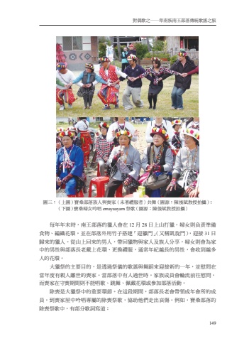 %u5c0d%u5076%u6b4c%u4e4b%u5351%u5357%u65cf%u5357%u738b%u90e8%u843d%u50b3%u7d71%u6b4c%u8b20%u4e4b%u65c5149%u6bcf%u5e74%u5e74%u672b%u6642%uff0c%u5357%u738b%u90e8%u843d%u7684%u7375%u4eba%u6703%u572812%u670828%u65e5%u4e0a%u5c71%u6253%u7375%uff0c%u5a66%u5973%u5247%u8ca0%u8cac%u6e96%u5099%u98df%u7269%u3001%u7de8%u7e54%u82b1%u74b0%uff0c%u4e26%u5728%u90e8%u843d%u5916%u7528%u7af9%u5b50%u642d%u5efa%u300c%u8fce%u7375%u9580%u300d%uff08%u53c8%u7a31%u51f1%u65cb%u9580%uff09%uff0c%u8fce%u63a531%u65e5%u6b78%u4f86%u7684%u7375%u4eba%u3002%u5f9e%u5c71%u4e0a%u56de%u4f86%u7684%u7537%u4eba%uff0c%u5e36%u56de%u7375%u7269%u8207%u5bb6%u4eba%u53ca%u65cf%u4eba%u5206%u4eab%uff0c%u5a66%u5973%u5247%u6703%u70ba%u5bb6%u4e2d%u7684%u7537%u6027%u8207%u90e8%u843d%u9577%u8001%u6234%u4e0a%u82b1%u74b0%u3001%u66f4%u63db%u79ae%u670d%uff0c%u901a%u5e38%u5e74%u7d00%u8d8a%u9577%u7684%u7537%u6027%uff0c%u6703%u6536%u5230%u8d8a%u591a%u4eba%u7684%u82b1%u74b0%u3002%u5927%u7375%u796d%u7684%u4e3b%u8981%u76ee%u7684%uff0c%u662f%u900f%u904e%u796d%u5100%u7684%u6b4c%u8b20%u8207%u821e%u8e48%u4f86%u8fce%u63a5%u65b0%u7684%u4e00%u5e74%uff0c%u4e26%u6170%u554f%u5728%u7576%u5e74%u5ea6%u6709%u89aa%u4eba%u96e2%u4e16%u7684%u55aa%u5bb6%u3002%u7576%u90e8%u843d%u4e2d%u6709%u4eba%u904e%u4e16%u6642%uff0c%u5bb6%u65cf%u6210%u54e1%u6703%u8f2a%u6d41%u524d%u5f80%u6170%u554f%uff0c%u800c%u55aa%u5bb6%u5728%u5b88%u55aa%u671f%u9593%u5247%u4e0d%u80fd%u5531%u6b4c%u3001%u8df3%u821e%u3001%u4f69%u6234%u82b1%u74b0%u6216%u53c3%u52a0%u90e8%u843d%u6d3b%u52d5%u3002%u9664%u55aa%u662f%u5927%u7375%u796d%u4e2d%u7684%u91cd%u8981%u74b0%u7bc0%u3002%u5728%u9019%u6bb5%u671f%u9593%uff0c%u90e8%u843d%u9577%u8001%u6703%u5e36%u9818%u6210%u5e74%u6703%u6240%u7684%u6210%u54e1%uff0c%u5230%u55aa%u5bb6%u5c4b%u4e2d%u541f%u5531%u5c08%u5c6c%u7684%u9664%u55aa%u796d%u6b4c%uff0c%u5354%u52a9%u4ed6%u5011%u8d70%u51fa%u54c0%u50b7%u3002%u4f8b%u5982%uff0c%u5bf6%u6851%u90e8%u843d%u7684%u9664%u55aa%u796d%u6b4c%u4e2d%uff0c%u6709%u90e8%u5206%u6b4c%u8a5e%u5beb%u9053%uff1a%u5716%u4e09%uff1a%uff08%u4e0a%u5716%uff09%u5bf6%u6851%u90e8%u843d%u65cf%u4eba%u8207%u55aa%u5bb6%uff08%u672a%u8457%u79ae%u670d%u8005%uff09%u5171%u821e%uff08%u5716%u6e90%uff1a%u9673%u4fca%u658c%u6559%u6388%u62cd%u651d%uff09%uff1b%uff08%u4e0b%u5716%uff09%u5bf6%u6851%u5a66%u5973%u541f%u5531emayaayam%u796d%u6b4c%uff08%u5716%u6e90%uff1a%u9673%u4fca%u658c%u6559%u6388%u62cd%u651d%uff09