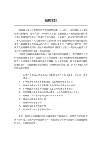 %u7de8%u8f2f%u4e3b%u65e8%u570b%u79d1%u6703%u4eba%u6587%u53ca%u793e%u6703%u79d1%u5b78%u7814%u7a76%u767c%u5c55%u8655%u65bc%u6c11%u570b%u516b%u5341%u516d%u5e74%u4e94%u6708%u958b%u59cb%u767c%u884c%u300a%u4eba%u6587%u8207%u793e%u6703%u79d1%u5b78%u7c21%u8a0a%u300b%uff0c%u6bcf%u5e74%u56db%u671f%uff0c%u4ee5%u5b63%u520a%u5f62%u5f0f%u51fa%u7248%uff1b%u5728%u5236%u5ea6%u9762%u4e0a%uff0c%u7de8%u8f2f%u59d4%u54e1%u7531%u570b%u79d1%u6703%u4eba%u6587%u793e%u6703%u79d1%u5b78%u7814%u7a76%u4e2d%u5fc3%u4e3b%u4efb%u53ca%u56db%u4f4d%u57f7%u884c%u59d4%u54e1%u3001%u4eba%u6587%u8655%u4e8c%u5341%u56db%u500b%u5b78%u9580%u4e4b%u53ec%u96c6%u4eba%u7b49%u4e8c%u5341%u4e5d%u4f4d%u5171%u540c%u64d4%u4efb%uff0c%u4eba%u6587%u8655%u5404%u5b78%u9580%u4e4b%u627f%u8fa6%u540c%u4ec1%u5247%u5354%u52a9%u63d0%u4f9b%u76f8%u95dc%u8cc7%u8a0a%u53ca%u5176%u4ed6%u884c%u653f%u652f%u63f4%u3002%u6b64%u7de8%u8f2f%u59d4%u54e1%u6703%u7d44%u6210%u4eba%u9078%u4e4b%u78ba%u7acb%uff0c%u9664%u70ba%u65e5%u5f8c%u5efa%u7acb%u4e00%u53ef%u4f9d%u5faa%u4e4b%u5236%u5ea6%u5916%uff0c%u4ea6%u5c07%u4f7f%u4eba%u6587%u8655%u76f8%u95dc%u5b78%u8005%u53ca%u540c%u4ec1%u90fd%u80fd%u5171%u540c%u53c3%u8207%u5354%u52a9%u300a%u7c21%u8a0a%u300b%u4e4b%u767c%u884c%uff0c%u9593%u63a5%u7684%u4e5f%u63d0%u5347%u4e86%u4eba%u6587%u793e%u6703%u79d1%u5b78%u5b78%u8005%u9593%u7684%u4ea4%u6d41%u3001%u6e9d%u901a%u8207%u91cd%u8996%u3002%u300a%u7c21%u8a0a%u300b%u5167%u5bb9%u9664%u5831%u5c0e%u570b%u79d1%u6703%u8207%u4eba%u6587%u8655%u4e4b%u696d%u52d9%u8a0a%u606f%u53ca%u52d5%u614b%u5916%uff0c%u5c0d%u5b78%u754c%u7814%u7a76%u5de5%u4f5c%u7684%u767c%u5c55%u53ca%u898f%u5283%u7b49%u4e8b%u52d9%uff0c%u4e5f%u63d0%u4f9b%u4e86%u826f%u597d%u4ea4%u6d41%u5712%u5730%u3002%u8fd1%u5e74%u4f86%u570b%u79d1%u6703%u7a4d%u6975%u63a8%u52d5%u8de8%u9818%u57df%u7814%u7a76%uff0c%u4f01%u76fc%u900f%u904e%u5404%u5c08%u984c%u8a08%u756b%u5f62%u6210%u7814%u7a76%u5718%u968a%uff0c%u4ee5%u4eba%u6587%u8655%u70ba%u4f8b%uff0c%u9664%u4e86%u555f%u52d5%u7814%u7a76%u5718%u968a%u6301%u7e8c%u8015%u8018%u5916%uff0c%u4e26%u5c07%u6301%u7e8c%u63a2%u7d22%u898f%u6a21%u8f03%u5927%u3001%u727d%u6d89%u8f03%u5ee3%u7684%u7814%u7a76%u4e3b%u984c%u3002%u4ee5%u4e0b%u70ba%u300a%u7c21%u8a0a%u300b%u5167%u5bb9%u6240%u6db5%u84cb%u4e4b%u7bc4%u570d%uff1a%u4e00%u3001%u5404%u5b78%u9580%u6b21%u9818%u57df%u4e4b%u7814%u7a76%u73fe%u6cc1%uff08%u4f8b%u5982%u8a9e%u8a00%u5b78%u9580%u4e2d%u7684%u97f3%u97fb%u5b78%u3001%u8a9e%u6cd5%u5b78%u3001%u8a9e%u7528%u5b78%u7b49%uff09%uff1b%u4e8c%u3001%u5404%u5b78%u9580%u6b21%u9818%u57df%u4e4b%u570b%u969b%u767c%u5c55%u8da8%u52e2%uff08%u5305%u62ec%u7406%u8ad6%u8207%u8b70%u984c%u5831%u5c0e%uff09%uff1b%u4e09%u3001%u570b%u5167%u91cd%u8981%u5b78%u8853%u7814%u7a76%u6210%u679c%u5831%u5c0e%uff08%u5305%u62ec%u5b78%u9580%u7814%u7fd2%u71df%u53ca%u500b%u4eba%u8ad6%u8457%uff09%uff1b%u56db%u3001%u5404%u5b78%u9580%u570b%u5167%u5916%u5091%u51fa%u5b78%u8005%u8a2a%u8ac7%uff08%u5305%u62ec%u5176%u7814%u7a76%u904e%u7a0b%u53ca%u9858%u666f%uff09%uff1b%u4e94%u3001%u5b78%u754c%u5c0d%u570b%u5167%u5b78%u8853%u6a5f%u69cb%u6216%u653f%u7b56%u4e4b%u5efa%u8b70%u3001%u6279%u8a55%u53ca%u76f8%u95dc%u55ae%u4f4d%u4e4b%u56de%u61c9%uff1b%u516d%u3001%u570b%u79d1%u6703%u4eba%u6587%u793e%u6703%u79d1%u5b78%u7814%u7a76%u4e2d%u5fc3%u76f8%u95dc%u6d3b%u52d5%u5831%u5c0e%uff1b%u4e03%u3001%u570b%u5167%u5916%u76f8%u95dc%u5b78%u8853%u671f%u520a%u4ecb%u7d39%uff1b%u516b%u3001%u570b%u5167%u5916%u76f8%u95dc%u5b78%u6703%u4ecb%u7d39%uff1b%u4e5d%u3001%u570b%u5167%u5916%u76f8%u95dc%u5b78%u8853%u6a5f%u69cb%u4ecb%u7d39%uff1b%u5341%u3001%u597d%u66f8%u63a8%u85a6%u3001%u7814%u8a0e%u6703%u7b49%u5b78%u8853%u8cc7%u8a0a%u3002%u672a%u4f86%uff0c%u300a%u7c21%u8a0a%u300b%u7684%u5831%u5c0e%u5167%u5bb9%u9664%u5ef6%u7e8c%u524d%u671f%u4e4b%u4e3b%u984c%u8981%u9805%u5916%uff0c%u540c%u6642%u5c07%u529b%u6c42%u5167%u5bb9%u5145%u5be6%uff0c%u9664%u4f5c%u70ba%u4eba%u6587%u8655%u8207%u5b78%u754c%u6e9d%u901a%u6a4b%u6881%u5916%uff0c%u5176%u64d4%u7576%u6574%u5408%u5404%u5b78%u9580%u53ca%u63d0%u4f9b%u4ea4%u6d41%u6e9d%u901a%u5712%u5730%u7684%u89d2%u8272%uff0c%u4e5f%u5c07%u66f4%u70ba%u91cd%u8981%u3002