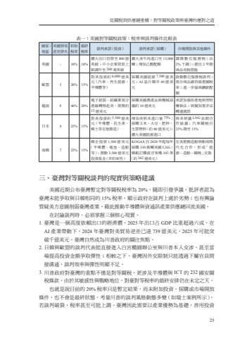 %u5f9e%u95dc%u7a05%u5230%u4f9b%u61c9%u93c8%u91cd%u69cb%uff1a%u5c0d%u7b49%u95dc%u7a05%u653f%u7b56%u8207%u81fa%u7063%u7684%u61c9%u5c0d%u4e4b%u905325%u8868%u4e00%uff1a%u7f8e%u570b%u5c0d%u7b49%u95dc%u7a05%u653f%u7b56%uff1a%u7a05%u7387%u8207%u8ac7%u5224%u689d%u4ef6%u6bd4%u8f03%u8868%u570b%u5bb6/%u5730%u5340%u7f8e%u570b%u8cbf%u6613%u9006%u5dee%u6392%u540d%u521d%u59cb%u7a05%u7387%u6700%u7d42%u7a05%u7387%u8ac7%u5224%u627f%u8afe%uff08%u6295%u8cc7%uff09%u8ac7%u5224%u627f%u8afe%uff08%u63a1%u8cfc%uff09%u5e02%u5834%u958b%u653e%u8207%u5176%u4ed6%u689d%u4ef6%u82f1%u570b10%10%%u64f4%u5927%u51fa%u53e3%u4fe1%u8cb8%u81f3800%u5104%u82f1%u938a%uff1b%u4e2d%u5c0f%u4f01%u696d%u8cb8%u6b3e%u4e0a%u9650%u8abf%u5347%u81f3200%u842c%u82f1%u938a%u64f4%u5927%u7f8e%u725b%u8089%u9032%u53e3%u81f313,000%u5678%uff1b%u589e%u52a0%u4e59%u9187%u914d%u984d%u8abf%u964d%u6578%u4f4d%u670d%u52d9%u7a05%uff08 %u75312%%u4e0b%u8abf%uff09%uff1b%u63a8%u51fa2%u5e74%u671f%u5546%u54c1%u514d%u7a05%u63aa%u65bd%u6b50%u76df320%15%%u5c0d%u7f8e%u6295%u8cc7%u7d046,000%u5104%u7f8e%u5143%uff08%u6c7d%u8eca%u3001%u518d%u751f%u80fd%u6e90%u3001%u534a%u5c0e%u9ad4%u7b49%uff09%u63a1%u8cfc%u7f8e%u570b%u80fd%u6e907,500%u5104%u7f8e%u5143%uff1bAI%u6676%u7247%u984d%u591640%u5104%u7f8e%u5143%u555f%u52d5%u6578%u4f4d%u670d%u52d9%u7a05%u8ac7%u5224%uff1b%u90e8%u5206%u5546%u54c1%u7dad%u6301%u6700%u60e0%u570b%u7a05%u7387%uff1b%u9032%u4e00%u6b65%u5354%u5546%u92fc%u92c1%u914d%u984d%u8d8a%u5357846%20%%u96fb%u5b50%u7d44%u88dd%u3001%u7d21%u7e54%u696d%u90e8%u5206%u7522%u7dda%u8f49%u79fb%u8d74%u7f8e%uff0c%u898f%u6a21%u7d0415%u5104%u7f8e%u5143%u63a1%u8cfc%u7f8e%u570b%u8fb2%u7522%u54c1%u8207%u6a5f%u68b0%u8a2d%u5099%u7d0410%u5104%u7f8e%u5143%u627f%u8afe%u52a0%u5f37%u539f%u7522%u5730%u8207%u667a%u8ca1%u6b0a%u57f7%u6cd5%uff1b%u7814%u64ec%u52a0%u91cd%u975e%u6cd5%u8f49%u904b%u8655%u7f70%u65e5%u672c425%15%%u5c0d%u7f8e%u6295%u8cc7%u7d045,500%u5104%u7f8e%u5143%uff08%u534a%u5c0e%u9ad4%u3001%u6297%u751f%u7d20%u3001%u7a00%u571f%u7b49%u5728%u5730%u88fd%u9020%uff09%u589e%u52a0%u7f8e%u7a3b%u7c73%u9032%u53e3%u91cf75%%uff1b%u63a1%u8cfc%u7389%u7c73%u3001%u5927%u8c46%u3001%u80a5%u6599%u3001%u751f%u8cea%u71c3%u6599%uff08%u7d0480%u5104%u7f8e%u5143%uff09%uff1b%u64f4%u5927%u7f8e%u570b%u80fd%u6e90%u9032%u53e3%u8207%u7f8e%u7814%u8b70LNG%u9577%u671f%u5408%u4f5c%u5354%u8b70%uff1b%u6c7d%u8eca%u95dc%u7a05%u81ea25%%u964d%u81f3 15%%u5357%u97d3725%15%%u97d3%u4f01%u6295%u8cc71,500%u5104%u7f8e%u5143%uff08%u534a%u5c0e%u9ad4%u3001%u96fb%u6c60%u3001%u9020%u8239%u7b49%uff09%uff1b%u63a8%u52d53,500%u5104%u7f8e%u5143%u6295%u8cc7%u57fa%u91d1%uff08%u975e%u7d04%u675f%u6027%uff09KOGAS%u81ea2028%u5e74%u8d77%u6bcf%u5e74%u63a1%u8cfc330%u842c%u5678%u7f8e%u570bLNG%uff1b%u97d3%u822a%u8a02%u8cfc%u6ce2%u97f3%u5ba2%u6a5f103%u67b6%uff08%u7d04362%u5104%u7f8e%u5143%uff09%u5728%u7f8e%u63a8%u52d5%u9020%u8239%u8207%u8239%u5862%u73fe%u4ee3 %u5316 %u5408 %u4f5c%uff0c %u5f62 %u6210%u300c %u80fd%u6e90%u2500%u9020%u8239%u2500%u95dc%u7a05%u300d%u4ea4%u63db%u4e09%u3001%u81fa%u7063%u5c0d%u7b49%u95dc%u7a05%u8ac7%u5224%u7684%u73fe%u5be6%u8207%u7b56%u7565%u5efa%u8b70%u7f8e%u570b%u8fd1%u671f%u516c%u5e03%u81fa%u7063%u66ab%u5b9a%u5c0d%u7b49%u95dc%u7a05%u7a05%u7387%u70ba20%%uff0c%u96a8%u5373%u5f15%u767c%u722d%u8b70%u3002%u6279%u8a55%u8005%u8a8d%u70ba%u81fa%u7063%u672a%u80fd%u722d%u53d6%u8207%u65e5%u97d3%u76f8%u540c%u768415%%u7a05%u7387%uff0c%u986f%u793a%u653f%u5e9c%u5728%u8ac7%u5224%u4e0a%u8655%u65bc%u52a3%u52e2%uff1b%u4e5f%u6709%u8f3f%u8ad6%u8cea%u7591%u7f8e%u65b9%u610f%u5716%u524a%u5f31%u81fa%u7063%u7522%u696d%uff0c%u85c9%u6b64%u63a8%u52d5%u534a%u5c0e%u9ad4%u8207%u8cc7%u901a%u8a0a%u7522%u696d%u4f9b%u61c9%u93c8%u56de%u6d41%u7f8e%u570b%u3002%u5728%u8a0e%u8ad6%u8ac7%u5224%u6642%uff0c%u5fc5%u9808%u638c%u63e1%u4e09%u500b%u6838%u5fc3%u73fe%u5be6%u30021. %u81fa%u7063%u662f%u4e00%u500b%u9ad8%u5ea6%u4f9d%u8cf4%u51fa%u53e3%u7684%u7d93%u6fdf%u9ad4%uff0c2025%u5e74%u51fa%u53e3%u5360GDP%u6bd4%u91cd%u8d85%u904e%u516d%u6210%u3002%u5728AI%u7522%u696d%u5e36%u52d5%u4e0b%uff0c2024%u5e74%u81fa%u7063%u5c0d%u7f8e%u8cbf%u6613%u9006%u5dee%u5df2%u9054739%u5104%u7f8e%u5143%uff0c2025%u5e74%u53ef%u80fd%u7a81%u7834%u5343%u5104%u7f8e%u5143%uff0c%u81fa%u7063%u81ea%u7136%u6210%u70ba%u5ddd%u666e%u653f%u5e9c%u7684%u95dc%u6ce8%u7126%u9ede%u30022. %u65e5%u97d3%u8207%u6b50%u76df%u7684%u8ac7%u5224%u4ee3%u8868%u80fd%u76f4%u63a5%u9032%u5165%u767d%u5bae%u6a62%u5713%u8fa6%u516c%u5ba4%u8207%u5ddd%u666e%u672c%u4eba%u4ea4%u6d89%uff0c%u751a%u81f3%u7576%u5834%u63d0%u9ad8%u6295%u8cc7%u91d1%u984d%u722d%u53d6%u5f48%u6027%uff1b%u76f8%u8f03%u4e4b%u4e0b%uff0c%u81fa%u7063%u56e0%u5916%u4ea4%u9650%u5236%u53ea%u80fd%u900f%u904e%u4e0b%u5c6c%u5b98%u54e1%u9593%u63a5%u6e9d%u901a%uff0c%u8ac7%u5224%u6548%u7387%u8207%u5f48%u6027%u660e%u986f%u4e0d%u8db3%u30023. %u5ddd%u666e%u653f%u5e9c%u5c0d%u81fa%u7063%u7684%u91cd%u9ede%u4e0d%u50c5%u662f%u5c0d%u7b49%u95dc%u7a05%uff0c%u66f4%u6d89%u53ca%u534a%u5c0e%u9ad4%u8207ICT%u7684232%u570b%u5b89%u95dc%u7a05%u689d%u6b3e%u3002%u7531%u65bc%u5176%u654f%u611f%u6027%u8207%u6230%u7565%u5730%u4f4d%uff0c%u5c0d%u81fa%u5c0d%u7b49%u7a05%u7387%u7684%u6700%u7d42%u5b89%u6392%u4ecd%u5728%u672a%u5b9a%u4e4b%u5929%u3002%u4e5f%u5c31%u662f%u8aaa%u76ee%u524d%u768420%%u7a05%u7387%u53ea%u662f%u66ab%u5b9a%u7d50%u679c%uff0c%u5c1a%u672a%u9644%u52a0%u6295%u8cc7%u3001%u63a1%u8cfc%u6216%u5e02%u5834%u958b%u653e%u689d%u4ef6%uff0c%u4e5f%u4e0d%u6703%u662f%u6700%u7d42%u72c0%u614b%u3002%u8003%u91cf%u5ddd%u666e%u7684%u8ac7%u5224%u98a8%u683c%u52d5%u614b%u591a%u8b8a%uff08%u5982%u745e%u58eb%u6848%u4f8b%u6240%u793a%uff09%uff0c%u82e5%u8ac7%u5224%u7834%u88c2%uff0c%u7a05%u7387%u751a%u81f3%u53ef%u80fd%u4e0a%u8abf%u3002%u81fa%u7063%u56e0%u6b64%u9700%u8981%u4ee5%u7522%u696d%u512a%u52e2%u70ba%u57fa%u790e%uff0c%u5584%u7528%u6295%u8cc7