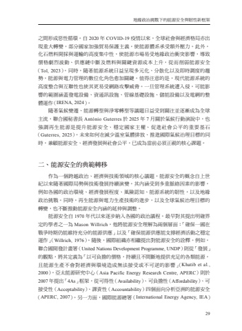 %u5730%u7de3%u653f%u6cbb%u6311%u6230%u4e0b%u7684%u80fd%u6e90%u5b89%u5168%u8207%u97cc%u6027%u65b0%u6846%u67b629%u4e4b%u9593%u5f62%u6210%u60e1%u6027%u5faa%u74b0%u3002%u81ea2020%u5e74COVID-19%u75ab%u60c5%u4ee5%u4f86%uff0c%u5168%u7403%u793e%u6703%u8207%u7d93%u6fdf%u683c%u5c40%u4ea6%u51fa%u73fe%u91cd%u5927%u8f49%u8b8a%uff0c%u90e8%u5206%u570b%u5bb6%u52a0%u5f37%u8cbf%u6613%u4fdd%u8b77%u4e3b%u7fa9%uff0c%u4f7f%u80fd%u6e90%u9ad4%u7cfb%u627f%u53d7%u984d%u5916%u58d3%u529b%u3002%u6b64%u5916%uff0c%u5316%u77f3%u71c3%u6599%u958b%u63a1%u8207%u904b%u8f38%u7684%u9ad8%u5ea6%u96c6%u4e2d%u6027%uff0c%u4f7f%u80fd%u6e90%u5e02%u5834%u6613%u53d7%u5730%u7de3%u653f%u6cbb%u885d%u7a81%u5f71%u97ff%uff0c%u5c0e%u81f4%u50f9%u683c%u5287%u70c8%u6ce2%u52d5%u3001%u4f9b%u61c9%u93c8%u4e2d%u65b7%u53ca%u71c3%u6599%u8207%u95dc%u9375%u8cc7%u6e90%u6210%u672c%u4e0a%u5347%uff0c%u5f9e%u800c%u524a%u5f31%u80fd%u6e90%u5b89%u5168%uff08Tol, 2023%uff09%u3002%u540c%u6642%uff0c%u96a8%u8457%u80fd%u6e90%u7cfb%u7d71%u65e5%u76ca%u5448%u73fe%u591a%u5143%u5316%u3001%u5206%u6563%u5316%u4ee5%u53ca%u5373%u6642%u8abf%u5ea6%u7684%u8da8%u52e2%uff0c%u80fd%u6e90%u8207%u96fb%u529b%u7ba1%u7406%u7684%u6578%u4f4d%u5316%u89d2%u8272%u6108%u52a0%u95dc%u9375%u3002%u503c%u5f97%u6ce8%u610f%u7684%u662f%uff0c%u73fe%u4ee3%u80fd%u6e90%u7cfb%u7d71%u7684%u9ad8%u5ea6%u6574%u5408%u8207%u4e92%u806f%u6027%u4e5f%u4f7f%u5176%u66f4%u6613%u53d7%u7db2%u8def%u653b%u64ca%u5a01%u8105%u3002%u4e00%u65e6%u7ba1%u7406%u7cfb%u7d71%u906d%u5165%u4fb5%uff0c%u53ef%u80fd%u5f71%u97ff%u7684%u7bc4%u570d%u6db5%u84cb%u767c%u96fb%u8a2d%u5099%u3001%u8cc7%u901a%u8a0a%u8a2d%u65bd%u3001%u7ba1%u7dda%u57fa%u790e%u8a2d%u65bd%u3001%u5132%u80fd%u8a2d%u5099%u4ee5%u53ca%u96fb%u7db2%u7684%u6574%u9ad4%u904b%u4f5c%uff08IRENA, 2024%uff09%u3002%u96a8%u8457%u6c23%u5019%u8b8a%u9077%u3001%u80fd%u6e90%u8f49%u578b%u8207%u6de8%u96f6%u8f49%u578b%u7b49%u8b70%u984c%u65e5%u76ca%u53d7%u5230%u95dc%u6ce8%u4e26%u9010%u6f38%u6210%u70ba%u5168%u7403%u4e3b%u6d41%uff0c%u806f%u5408%u570b%u79d8%u66f8%u9577Ant%u00f3nio Guterres%u65bc2025%u5e747%u6708%u95dc%u65bc%u6c23%u5019%u884c%u52d5%u6f14%u8aaa%u4e2d%uff0c%u4e5f%u5f37%u8abf%u518d%u751f%u80fd%u6e90%u662f%u63d0%u5347%u80fd%u6e90%u5b89%u5168%u3001%u7a69%u5b9a%u570b%u5bb6%u4e3b%u6b0a%u3001%u4fc3%u9032%u793e%u6703%u516c%u5e73%u7684%u91cd%u8981%u57fa%u77f3%uff08Guterres, 2025%uff09%u3002%u672a%u4f86%u5982%u4f55%u5728%u6e1b%u5c11%u6eab%u5ba4%u6c23%u9ad4%u6392%u653e%u3001%u63a8%u9032%u570b%u969b%u6c23%u5019%u6cbb%u7406%u76ee%u6a19%u7684%u540c%u6642%uff0c%u517c%u9867%u80fd%u6e90%u5b89%u5168%u3001%u7d93%u6fdf%u767c%u5c55%u8207%u793e%u6703%u516c%u5e73%uff0c%u5df2%u6210%u70ba%u7576%u524d%u5fc5%u9808%u6b63%u8996%u7684%u6838%u5fc3%u8ab2%u984c%u3002%u4e8c%u3001%u80fd%u6e90%u5b89%u5168%u7684%u5178%u7bc4%u8f49%u79fb%u4f5c%u70ba%u4e00%u500b%u8de8%u8d8a%u653f%u6cbb%u3001%u7d93%u6fdf%u8207%u6280%u8853%u9818%u57df%u7684%u6838%u5fc3%u8b70%u984c%uff0c%u80fd%u6e90%u5b89%u5168%u7684%u6982%u5ff5%u81ea%u4e0a%u4e16%u7d00%u4ee5%u4f86%u96a8%u8457%u570b%u969b%u5c40%u52e2%u8207%u6280%u8853%u767c%u5c55%u6301%u7e8c%u6f14%u8b8a%u3002%u5176%u5167%u6db5%u53d7%u5230%u591a%u91cd%u8108%u7d61%u56e0%u7d20%u7684%u5f71%u97ff%uff0c%u4f8b%u5982%u5404%u570b%u7684%u653f%u6cbb%u74b0%u5883%u3001%u7d93%u6fdf%u767c%u5c55%u7a0b%u5ea6%u3001%u98a8%u96aa%u8a8d%u77e5%u3001%u80fd%u6e90%u7cfb%u7d71%u7684%u97cc%u6027%uff0c%u4ee5%u53ca%u5730%u7de3%u653f%u6cbb%u6311%u6230%u3002%u540c%u6642%uff0c%u518d%u751f%u80fd%u6e90%u8207%u96fb%u529b%u751f%u7522%u6280%u8853%u7684%u9032%u6b65%uff0c%u4ee5%u53ca%u5168%u7403%u6c23%u5019%u6cbb%u7406%u76ee%u6a19%u7684%u8f49%u8b8a%uff0c%u4e5f%u4e0d%u65b7%u63a8%u52d5%u80fd%u6e90%u5b89%u5168%u5167%u6db5%u7684%u5ef6%u4f38%u8207%u8abf%u6574%u3002%u80fd%u6e90%u5b89%u5168%u81ea1970%u5e74%u4ee3%u4ee5%u4f86%u9010%u6b65%u7d0d%u5165%u5404%u570b%u7684%u653f%u6cbb%u8b70%u7a0b%u3002%u6700%u65e9%u5c0d%u5176%u63d0%u51fa%u660e%u78ba%u754c%u5b9a%u7684%u5b78%u8005%u4e4b%u4e00%u70baMason Willrich%uff0c%u4ed6%u5c07%u80fd%u6e90%u5b89%u5168%u7406%u89e3%u70ba%u5169%u500b%u5c64%u9762%uff1a%u300c%u78ba%u4fdd%u4e00%u570b%u5728%u6230%u722d%u6642%u671f%u4ecd%u80fd%u7dad%u6301%u5145%u5206%u7684%u80fd%u6e90%u4f9b%u61c9%u300d%u4ee5%u53ca%u300c%u78ba%u4fdd%u80fd%u6e90%u4f9b%u61c9%u80fd%u652f%u6490%u7d93%u6fdf%u6d3b%u52d5%u4e4b%u7a69%u5b9a%u904b%u4f5c%u300d%uff08Willrich, 1976%uff09%u3002%u96a8%u5f8c%uff0c%u570b%u969b%u7d44%u7e54%u4ea6%u76f8%u7e7c%u63d0%u51fa%u5c0d%u80fd%u6e90%u5b89%u5168%u7684%u8a6e%u91cb%u3002%u4f8b%u5982%uff0c%u806f%u5408%u570b%u958b%u767c%u8a08%u756b%u7f72%uff08United Nations Development Programme, UNDP%uff09%u5247%u5f9e%u300c%u767c%u5c55%u300d%u7684%u89c0%u9ede%uff0c%u5c07%u5176%u5b9a%u7fa9%u70ba%u300c%u4ee5%u53ef%u8ca0%u64d4%u7684%u50f9%u683c%uff0c%u6301%u7e8c%u4e14%u4e0d%u9593%u65b7%u5730%u63d0%u4f9b%u5145%u8db3%u7684%u5404%u985e%u80fd%u6e90%uff0c%u4e14%u80fd%u6e90%u751f%u7522%u4e0d%u6703%u5c0d%u7d93%u6fdf%u8207%u74b0%u5883%u9020%u6210%u7121%u6cd5%u63a5%u53d7%u6216%u4e0d%u53ef%u9006%u7684%u5f71%u97ff%u300d%uff08Khatib et al., 2000%uff09%u3002%u4e9e%u592a%u80fd%u6e90%u7814%u7a76%u4e2d%u5fc3%uff08Asia Pacific Energy Research Centre, APERC%uff09%u5247%u65bc2007%u5e74%u63d0%u51fa%u300c4As%u300d%u6846%u67b6%uff0c%u5f9e%u53ef%u5f97%u6027%uff08Availability%uff09%u3001%u53ef%u8ca0%u64d4%u6027%uff08Affordability%uff09%u3001%u53ef%u63a5%u53d7%u6027%uff08Acceptability%uff09%u3001%u8ab2%u8cac%u6027%uff08Accountability%uff09%u56db%u500b%u9762%u5411%u5206%u6790%u4e9e%u6d32%u7684%u80fd%u6e90%u5b89%u5168%uff08APERC, 2007%uff09%u3002%u53e6%u4e00%u65b9%u9762%uff0c%u570b%u969b%u80fd%u6e90%u7e3d%u7f72%uff08International Energy Agency, IEA%uff09