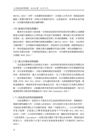 32%u4eba%u6587%u8207%u793e%u6703%u79d1%u5b78%u7c21%u8a0a%u300026%u53774%u671f%uff0e114%u5e749%u6708IRENA, 2024%uff09%u3002%u540c%u6642%uff0c%u5728%u898f%u5283%u8207%u8a2d%u7f6e%u904e%u7a0b%u4e2d%uff0c%u4ea6%u9808%u7d0d%u5165%u81ea%u7136%u707d%u5bb3%u3001%u6975%u7aef%u6c23%u5019%u8207%u7db2%u8def%uff0f%u5be6%u9ad4%u653b%u64ca%u7b49%u55ae%u4e00%u8207%u8907%u5408%u578b%u98a8%u96aa%u7684%u8a55%u4f30%uff0c%u4e26%u900f%u904e%u653f%u5e9c%u3001%u7522%u696d%u8207%u793e%u6703%u7684%u5354%u4f5c%uff0c%u6709%u6548%u8b58%u5225%u98a8%u96aa%u4e26%u63d0%u51fa%u7de9%u89e3%u7b56%u7565%u3002%uff08%u56db%uff09%u5340%u57df%u5408%u4f5c%u6df1%u5316%u8207%u64f4%u5927%u96a8%u8457%u518d%u751f%u80fd%u6e90%u7684%u5927%u91cf%u4f48%u5efa%uff0c%u5168%u7403%u80fd%u6e90%u8cc7%u6e90%u539f%u6599%u8207%u6280%u8853%u7684%u8cbf%u6613%u9ad4%u7cfb%u6b63%u9010%u6f38%u64fa%u812b%u904e%u53bb%u4f9d%u8cf4%u5c11%u6578%u570b%u5bb6%u5316%u77f3%u71c3%u6599%u9032%u53e3%u7684%u9ad8%u5ea6%u4e0d%u5c0d%u7a31%u95dc%u4fc2%uff0c%u8f49%u800c%u5efa%u7acb%u66f4%u70ba%u5c0d%u7a31%u7684%u8cbf%u6613%u9023%u7d50%u3002%u9019%u4e00%u904e%u7a0b%u4fc3%u4f7f%u5404%u570b%u5728%u95dc%u9375%u80fd%u6e90%u8cc7%u6e90%u4e0a%u5f62%u6210%u8de8%u570b%u7db2%u7d61%uff0c%u4e26%u9032%u4e00%u6b65%u91cd%u5851%u5730%u7de3%u653f%u6cbb%u683c%u5c40%uff0c%u767c%u5c55%u51fa%u65b0%u578b%u614b%u7684%u8907%u96dc%u4f9d%u8cf4%u9ad4%u7cfb%uff08IRENA, 2024%uff09%u3002%u7136%u800c%uff0c%u5728%u6b64%u65b0%u7684%u4e92%u8cf4%u7d50%u69cb%u4e0b%uff0c%u4e5f%u4f34%u96a8%u65b0%u7684%u98a8%u96aa%u8207%u8106%u5f31%u6027%uff0c%u5c0d%u80fd%u6e90%u5b89%u5168%u9020%u6210%u6311%u6230%uff0c%u8de8%u570b%u8207%u5340%u57df%u5408%u4f5c%uff0c%u4f8b%u5982%u900f%u904e%u80fd%u6e90%u7ba1%u7dda%u3001%u96fb%u7db2%u4e92%u806f%u53ca%u904b%u8f38%u9ad4%u7cfb%u7684%u5f37%u5316%u7b56%u7565%uff0c%u5c07%u626e%u6f14%u95dc%u9375%u89d2%u8272%uff0c%u6709%u52a9%u65bc%u5404%u570b%u5728%u6280%u8853%u3001%u5e02%u5834%u8207%u653f%u7b56%u5c64%u9762%u4e0a%u5354%u540c%u5408%u4f5c%uff0c%u5171%u540c%u61c9%u5c0d%u6c23%u5019%u8b8a%u9077%u8207%u80fd%u6e90%u5b89%u5168%u6311%u6230%uff08WEF, 2023%uff09%u3002%uff08%u4e94%uff09%u96fb%u529b%u5e02%u5834%u6539%u9769%u8207%u5275%u65b0%u70ba%u4fc3%u9032%u80fd%u6e90%u8f49%u578b%u4ee5%u53ca%u80fd%u6e90%u5b89%u5168%u5f37%u5316%uff0c%u653f%u5e9c%u8207%u7522%u696d%u9808%u805a%u7126%u65bc%u5275%u9020%u9577%u671f%u7a69%u5b9a%u7684%u6295%u8cc7%u74b0%u5883%uff0c%u4ee5%u53ca%u63a8%u52d5%u524d%u77bb%u6027%u7684%u96fb%u529b%u5e02%u5834%u6539%u9769%u3002%u80fd%u6e90%u8f49%u578b%u904e%u7a0b%u4e2d%u7684%u4f9b%u61c9%u93c8%u97cc%u6027%u78ba%u4fdd%u3001%u518d%u751f%u80fd%u6e90%u767c%u96fb%u64f4%u5927%u3001%u5206%u6563%u5f0f%u96fb%u7db2%u8207%u5132%u80fd%u7cfb%u7d71%u5efa%u7f6e%uff0c%u4e43%u81f3%u667a%u6167%u80fd%u6e90%u7ba1%u7406%u7cfb%u7d71%u66f4%u65b0%uff0c%u90fd%u9700%u8981%u5373%u6642%u3001%u9f90%u5927%u4e14%u6301%u7e8c%u7684%u8cc7%u91d1%u6339%u6ce8%u3002%u70ba%u4e86%u5f15%u5c0e%u6c11%u9593%u8cc7%u91d1%u9577%u671f%u7a69%u5b9a%u6295%u5165%uff0c%u653f%u5e9c%u61c9%u63d0%u4f9b%u7a69%u5b9a%u3001%u53ef%u9810%u6e2c%u7684%u653f%u7b56%u8207%u6cd5%u898f%u6846%u67b6%uff0c%u5411%u5e02%u5834%u91cb%u653e%u6e05%u6670%u7684%u9577%u671f%u6295%u8cc7%u4fe1%u865f%uff08WEF, 2023; IEA, 2022b%uff09%u3002%u800c%u70ba%u907f%u514d%u6295%u8cc7%u5931%u8861%uff0c%u4e5f%u9700%u63a8%u52d5%u8de8%u90e8%u9580%u5354%u8abf%uff0c%u78ba%u4fdd%u96fb%u7db2%u5efa%u8a2d%u3001%u767c%u96fb%u8207%u7ba1%u7406%u7cfb%u7d71%u5747%u7372%u9069%u7576%u652f%u6301%u3002%u96fb%u529b%u5e02%u5834%u8a2d%u8a08%u4ea6%u9808%u512a%u5316%u50f9%u683c%u4fe1%u865f%uff0c%u4ee5%u53cd%u6620%u5be6%u969b%u9700%u6c42%uff0c%u4e26%u9f13%u52f5%u6d88%u8cbb%u8005%u53c3%u8207%u9700%u6c42%u9762%u7ba1%u7406%u8207%u865b%u64ec%u96fb%u5ee0%u904b%u4f5c%uff0c%u63d0%u5347%u7cfb%u7d71%u8abf%u5ea6%u5f48%u6027%u4e26%u964d%u4f4e%u65b0%u589e%u96fb%u5ee0%u6210%u672c%uff08WEF, 2025; Eurelectric, 2025%uff09%u3002%uff08%u516d%uff09%u5177%u793e%u6703%u5305%u5bb9%u6027%u7684%u80fd%u6e90%u653f%u7b56%u5728%u80fd%u6e90%u8f49%u578b%u4e2d%uff0c%u80fd%u6e90%u5b89%u5168%u4e0d%u50c5%u6d89%u53ca%u518d%u751f%u80fd%u6e90%u6280%u8853%u8207%u539f%u6599%u53d6%u5f97%u3001%u96fb%u7db2%u5efa%u8a2d%u3001%u98a8%u96aa%u56e0%u61c9%u8207%u570b%u969b%u5408%u4f5c%uff0c%u4ea6%u9808%u7d0d%u5165%u793e%u6703%u9762%u5411%u3002%u518d%u751f%u80fd%u6e90%u7684%u5206%u6563%u5316%u8207%u5728%u5730%u5316%u7279%u6027%uff0c%u53ef%u5354%u52a9%u793e%u6703%u7372%u5f97%u7a69%u5b9a%u4e14%u53ef%u8ca0%u64d4%u7684%u80fd%u6e90%uff0c%u78ba%u4fdd%u300c%u4e0d%u907a%u843d%u4efb%u4f55%u4eba%u300d%uff0c%u4ee5%u5408%u5b9c%u7684%u50f9%u683c%u63d0%u4f9b%u96fb%u529b%u670d%u52d9%uff0c%u4e26%u900f%u904e%u516c%u6b63%u8f49%u578b%u63aa%u65bd%u907f%u514d%u80fd%u6e90%u4e0d%u5e73%u7b49%u52a0%u5287%uff08IEA, 2025; IEA, 2022b%uff09%u3002%u540c%u6642%uff0c%u516c%u6c11%u8207%u5229%u5bb3%u95dc%u4fc2%u4eba%u53ef%u53c3%u8207%u80fd%u6e90%u751f%u7522%u3001%u8f38%u914d%u9001%u8207%u71df%u904b%u6c7a%u7b56%uff0c%u6210%u70ba%u300c%u751f%u7522%u6d88%u8cbb%u8005%u300d%uff08prosumers%uff09%u3002%u6b64%u985e%u5206%u6563%u5f0f%u9ad4%u7cfb%u4e0d%u50c5%u53ef%u5f37%u5316%u793e%u6703%u53c3%u8207%uff0c%u589e%u5f37%u793e%u5340%u7684%u80fd%u6e90%u81ea%u4e3b%uff0c%u4e5f%u964d%u4f4e%u96c6%u4e2d%u5f0f%u96fb%u529b%u7cfb%u7d71%u5728%u6c23%u5019%u5a01%u8105%u6216%u885d%u7a81%u4e0b%u7684%u8106%u5f31%u6027%uff08IRENA, 2024%uff09%u3002