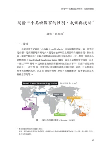 %u958b%u767c%u4e2d%u5c0f%u5cf6%u5dbc%u570b%u5bb6%u7684%u6027%u5225%u3001%u6c23%u5019%u8207%u63f4%u52a935%u958b%u767c%u4e2d%u5c0f%u5cf6%u5dbc%u570b%u5bb6%u7684%u6027%u5225%u3001%u6c23%u5019%u8207%u63f4%u52a9#%u84b2%u84c9%u3001%u5f35%u6587%u63da%uff0a%u4e00%u3001%u524d%u8a00%u4e0d%u77e5%u9053%u7576%u5927%u5bb6%u770b%u5230%u300c%u5c0f%u5cf6%u5dbc%u300d%uff08small islands%uff09%u9019%u500b%u8a5e%u5f59%u7684%u6642%u5019%uff0c%u7b2c%u4e00%u500b%u60f3%u6cd5%u662f%u4ec0%u9ebc%uff1f%u662f%u5ea6%u5047%u52dd%u5730%u99ac%u723e%u5730%u592b%uff1f%u9084%u662f%u5728%u5730%u7de3%u653f%u6cbb%u4e0a%u6240%u8b02%u7684%u5cf6%u93c8%u570b%u5bb6%u5011%uff0c%u4f8b%u5982%u5e1b%u7409%u3001%u7d22%u7f85%u9580%u7fa4%u5cf6%u7b49%uff1f%u5728%u806f%u5408%u570b%u5c0d%u570b%u5bb6%u8207%u5340%u57df%u7684%u5206%u985e%u540d%u55ae%u4e2d%uff0c%u6709%u4e00%u985e%u662f%u300c%u958b%u767c%u4e2d%u5c0f%u5cf6%u5dbc%u570b%u5bb6%u300d%uff08Small Island Developing States, SIDS%uff0c%u6216%u662f%u5c0f%u5cf6%u5dbc%u958b%u767c%u4e2d%u570b%u5bb6%uff0c%u4ee5%u4e0b%u4e00%u5f8b%u4ee5SIDS%u7a31%u547c%uff09%uff0c%u9019%u4e9b%u570b%u5bb6%u53ca%u653f%u6cbb%u5be6%u9ad4%u5206%u5225%u6563%u843d%u5728%u592a%u5e73%u6d0b%u3001%u5370%u5ea6%u6d0b%u6216%u662f%u52a0%u52d2%u6bd4%u6d77%u4e0a%uff0c%u4e00%u5171%u670958%u500b%uff0c%u5176%u4e2d%u5305%u62ec39%u500b%u806f%u5408%u570b%u6703%u54e1%u570b%uff08%u4f8b%u5982%uff1a%u6d77%u5730%u3001%u5410%u74e6%u9b6f%u6216%u662f%u8056%u591a%u7f8e%u666e%u6797%u897f%u6bd4%u7b49%uff09%u4ee5%u53ca19%u500b%u6d77%u5916%u9818%u5730%uff08%u4f8b%u5982%uff1a%u7f8e%u5c6c%u85a9%u6469%u4e9e%u3001%u6ce2%u591a%u9ece%u5404%u6216%u662f%u82f1%u5c6c%u7dad%u4eac%u7fa4%u5cf6%u7b49%uff09%u3002%u5716%u4e00%uff1aSIDS%u5206%u5e03%u5716%uff08%u5716%u6e90%uff1aBeatrice %uff082024%uff09%uff09# %u672c%u6587%u4fc2%u767c%u5c55%u8207%u6539%u5beb%u81ea%u84b2%u84c9%uff082022%uff09%u3002%uff0a%u84b2%u84c9%uff0c%u570b%u7acb%u653f%u6cbb%u5927%u5b78%u5916%u4ea4%u5b78%u7cfb%u78a9%u58eb%u3001%u82f1%u570b%u7d04%u514b%u5927%u5b78%u653f%u6cbb%u8207%u570b%u969b%u95dc%u4fc2%u5b78%u7cfb%u535a%u58eb%u751f%uff1b%u5f35%u6587%u63da%uff0c%u570b%u7acb%u653f%u6cbb%u5927%u5b78%u5916%u4ea4%u5b78%u7cfb%u6559%u6388%u3002