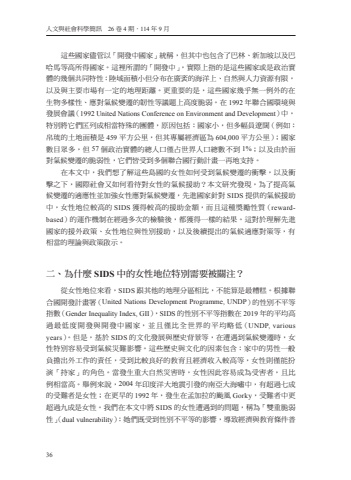 36%u4eba%u6587%u8207%u793e%u6703%u79d1%u5b78%u7c21%u8a0a%u300026%u53774%u671f%uff0e114%u5e749%u6708%u9019%u4e9b%u570b%u5bb6%u5118%u7ba1%u4ee5%u300c%u958b%u767c%u4e2d%u570b%u5bb6%u300d%u7d71%u7a31%uff0c%u4f46%u5176%u4e2d%u4e5f%u5305%u542b%u4e86%u5df4%u6797%u3001%u65b0%u52a0%u5761%u4ee5%u53ca%u5df4%u54c8%u99ac%u7b49%u9ad8%u6240%u5f97%u570b%u5bb6%u3002%u9019%u88e1%u6240%u8b02%u7684%u300c%u958b%u767c%u4e2d%u300d%uff0c%u5be6%u969b%u4e0a%u6307%u7684%u662f%u9019%u4e9b%u570b%u5bb6%u6216%u662f%u653f%u6cbb%u5be6%u9ad4%u7684%u5e7e%u500b%u5171%u540c%u7279%u6027%uff1a%u9678%u57df%u9762%u7a4d%u5c0f%u4f46%u5206%u5e03%u5728%u5ee3%u88a4%u7684%u6d77%u6d0b%u4e0a%u3001%u81ea%u7136%u8207%u4eba%u529b%u8cc7%u6e90%u6709%u9650%uff0c%u4ee5%u53ca%u8207%u4e3b%u8981%u5e02%u5834%u6709%u4e00%u5b9a%u7684%u5730%u7406%u8ddd%u96e2%u3002%u66f4%u91cd%u8981%u7684%u662f%uff0c%u9019%u4e9b%u570b%u5bb6%u5e7e%u4e4e%u7121%u4e00%u4f8b%u5916%u7684%u5728%u751f%u7269%u591a%u6a23%u6027%u3001%u61c9%u5c0d%u6c23%u5019%u8b8a%u9077%u7684%u97cc%u6027%u7b49%u8b70%u984c%u4e0a%u9ad8%u5ea6%u8106%u5f31%u3002%u57281992%u5e74%u806f%u5408%u570b%u74b0%u5883%u8207%u767c%u5c55%u6703%u8b70%uff081992 United Nations Conference on Environment and Development%uff09%u4e2d%uff0c%u7279%u5225%u5c07%u5b83%u5011%u5321%u5217%u6210%u76f8%u7576%u7279%u6b8a%u7684%u5718%u9ad4%uff0c%u539f%u56e0%u5305%u62ec%uff1a%u570b%u5bb6%u5c0f%uff0c%u4f46%u591a%u5e45%u54e1%u907c%u95ca%uff08%u4f8b%u5982%uff1a%u5e1b%u7409%u7684%u571f%u5730%u9762%u7a4d%u662f459%u5e73%u65b9%u516c%u91cc%uff0c%u4f46%u5176%u5c08%u5c6c%u7d93%u6fdf%u5340%u70ba604,000%u5e73%u65b9%u516c%u91cc%uff09%uff1b%u570b%u5bb6%u6578%u76ee%u773e%u591a%uff0c%u4f4657%u500b%u653f%u6cbb%u5be6%u9ad4%u7684%u7e3d%u4eba%u53e3%u50c5%u5360%u4e16%u754c%u4eba%u53e3%u7e3d%u6578%u4e0d%u52301%%uff1b%u4ee5%u53ca%u7531%u65bc%u9762%u5c0d%u6c23%u5019%u8b8a%u9077%u7684%u8106%u5f31%u6027%uff0c%u5b83%u5011%u7686%u53d7%u5230%u591a%u500b%u806f%u5408%u570b%u884c%u52d5%u8a08%u756b%u4e00%u518d%u5730%u652f%u6301%u3002%u5728%u672c%u6587%u4e2d%uff0c%u6211%u5011%u60f3%u4e86%u89e3%u9019%u4e9b%u5cf6%u570b%u7684%u5973%u6027%u5982%u4f55%u53d7%u5230%u6c23%u5019%u8b8a%u9077%u7684%u885d%u64ca%uff0c%u4ee5%u53ca%u885d%u64ca%u4e4b%u4e0b%uff0c%u570b%u969b%u793e%u6703%u53c8%u5982%u4f55%u770b%u5f85%u5c0d%u5973%u6027%u7684%u6c23%u5019%u63f4%u52a9%uff1f%u672c%u6587%u7814%u7a76%u767c%u73fe%uff0c%u70ba%u4e86%u63d0%u9ad8%u6c23%u5019%u8b8a%u9077%u7684%u9069%u61c9%u6027%u4e26%u52a0%u5f37%u5973%u6027%u61c9%u5c0d%u6c23%u5019%u8b8a%u9077%uff0c%u5148%u9032%u570b%u5bb6%u91dd%u5c0dSIDS%u63d0%u4f9b%u7684%u6c23%u5019%u63f4%u52a9%u4e2d%uff0c%u5973%u6027%u5730%u4f4d%u8f03%u9ad8%u7684SIDS%u7372%u5f97%u8f03%u9ad8%u7684%u63f4%u52a9%u91d1%u984d%uff0c%u800c%u4e14%u9019%u7a2e%u734e%u52f5%u6027%u8cea%uff08rewardbased%uff09%u7684%u904b%u4f5c%u6a5f%u5236%u5728%u7d93%u904e%u591a%u6b21%u7684%u6aa2%u9a57%u5f8c%uff0c%u90fd%u7372%u5f97%u4e00%u6a23%u7684%u7d50%u679c%u3002%u9019%u5c0d%u65bc%u7406%u89e3%u5148%u9032%u570b%u5bb6%u7684%u63f4%u5916%u653f%u7b56%u3001%u5973%u6027%u5730%u4f4d%u8207%u6027%u5225%u63f4%u52a9%uff0c%u4ee5%u53ca%u5f8c%u7e8c%u63d0%u51fa%u7684%u6c23%u5019%u9069%u61c9%u5c0d%u7b56%u7b49%uff0c%u6709%u76f8%u7576%u7684%u7406%u8ad6%u8207%u653f%u7b56%u555f%u793a%u3002%u4e8c%u3001%u70ba%u4ec0%u9ebcSIDS%u4e2d%u7684%u5973%u6027%u5730%u4f4d%u7279%u5225%u9700%u8981%u88ab%u95dc%u6ce8%uff1f%u5f9e%u5973%u6027%u5730%u4f4d%u4f86%u770b%uff0cSIDS%u8ddf%u5176%u4ed6%u7684%u5730%u7406%u5206%u5340%u76f8%u6bd4%uff0c%u4e0d%u80fd%u7b97%u662f%u6700%u7cdf%u7cd5%u3002%u6839%u64da%u806f%u5408%u570b%u958b%u767c%u8a08%u756b%u7f72%uff08United Nations Development Programme, UNDP%uff09%u7684%u6027%u5225%u4e0d%u5e73%u7b49%u6307%u6578%uff08Gender Inequality Index, GII%uff09%uff0cSIDS%u7684%u6027%u5225%u4e0d%u5e73%u7b49%u6307%u6578%u57282019%u5e74%u7684%u5e73%u5747%u9ad8%u904e%u6700%u4f4e%u5ea6%u958b%u767c%u8207%u958b%u767c%u4e2d%u570b%u5bb6%uff0c%u4e26%u4e14%u50c5%u6bd4%u5168%u4e16%u754c%u7684%u5e73%u5747%u7565%u4f4e%uff08UNDP, various years%uff09%u3002%u4f46%u662f%uff0c%u57fa%u65bcSIDS%u7684%u6587%u5316%u767c%u5c55%u8207%u6b77%u53f2%u80cc%u666f%u7b49%uff0c%u5728%u906d%u9047%u5230%u6c23%u5019%u8b8a%u9077%u6642%uff0c%u5973%u6027%u7279%u5225%u5bb9%u6613%u53d7%u5230%u6c23%u5019%u707d%u96e3%u5f71%u97ff%u3002%u9019%u4e9b%u6b77%u53f2%u8207%u6587%u5316%u7684%u56e0%u7d20%u5305%u542b%uff1a%u5bb6%u4e2d%u7684%u7537%u6027%u4e00%u822c%u8ca0%u64d4%u51fa%u5916%u5de5%u4f5c%u7684%u8cac%u4efb%uff0c%u53d7%u5230%u6bd4%u8f03%u826f%u597d%u7684%u6559%u80b2%u4e14%u7d93%u6fdf%u6536%u5165%u8f03%u9ad8%u7b49%uff0c%u5973%u6027%u5247%u50c5%u80fd%u626e%u6f14%u300c%u6301%u5bb6%u300d%u7684%u89d2%u8272%u3002%u7576%u767c%u751f%u91cd%u5927%u81ea%u7136%u707d%u5bb3%u6642%uff0c%u5973%u6027%u56e0%u6b64%u5bb9%u6613%u6210%u70ba%u53d7%u5bb3%u8005%uff0c%u4e14%u6bd4%u4f8b%u76f8%u7576%u9ad8%u3002%u8209%u4f8b%u4f86%u8aaa%uff0c2004%u5e74%u5370%u5ea6%u6d0b%u5927%u5730%u9707%u5f15%u767c%u7684%u5357%u4e9e%u5927%u6d77%u562f%u4e2d%uff0c%u6709%u8d85%u904e%u4e03%u6210%u7684%u53d7%u96e3%u8005%u662f%u5973%u6027%uff1b%u5728%u66f4%u65e9%u76841992%u5e74%uff0c%u767c%u751f%u5728%u5b5f%u52a0%u62c9%u7684%u98b1%u98a8Gorky%uff0c%u53d7%u96e3%u8005%u4e2d%u66f4%u8d85%u904e%u4e5d%u6210%u662f%u5973%u6027%u3002%u6211%u5011%u5728%u672c%u6587%u4e2d%u5c07SIDS%u7684%u5973%u6027%u906d%u9047%u5230%u7684%u554f%u984c%uff0c%u7a31%u70ba%u300c%u96d9%u91cd%u8106%u5f31%u6027%u300d%uff08dual vulnerability%uff09%uff1a%u5979%u5011%u65e2%u53d7%u5230%u6027%u5225%u4e0d%u5e73%u7b49%u7684%u5f71%u97ff%uff0c%u5c0e%u81f4%u7d93%u6fdf%u8207%u6559%u80b2%u689d%u4ef6%u666e