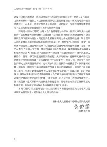2%u4eba%u6587%u8207%u793e%u6703%u79d1%u5b78%u7c21%u8a0a%u300026%u53774%u671f%uff0e114%u5e749%u6708%u9032%u5ea6%u53ef%u4ee5%u9806%u5229%u5730%u63a8%u9032%u3002%u6240%u4ee5%u7814%u7a76%u502b%u7406%u6240%u626e%u6f14%u7684%u89d2%u8272%u5982%u540c%u662f%u5728%u300c%u5275%u65b0%u300d%u53ca%u300c%u8aa0%u4fe1%u300d%u4e4b%u9593%u6240%u7dad%u7e6b%u7684%u4e00%u80a1%u5f35%u529b%uff0c%u9019%u500b%u7dca%u5f35%u95dc%u4fc2%u53ef%u4ee5%u8b93%u5275%u65b0%u5efa%u69cb%u5728%u4e00%u500b%u66f4%u70ba%u53ef%u9760%u7684%u8aa0%u4fe1%u57fa%u790e%u4e4b%u4e0a%uff0c%u800c%u4e0d%u662f%u4e00%u500b%u907f%u4e4b%u552f%u6050%u4e0d%u53ca%u7684%u727d%u7d46%u3002%u53ea%u662f%u5f9e%u9019%u4e00%u6b21%u4e8b%u4ef6%u7684%u767c%u5c55%u6a23%u8c8c%u4f86%u770b%uff0c%u9019%u6a23%u7684%u4fe1%u5ff5%u6050%u6015%u9084%u9700%u8981%u6709%u66f4%u591a%u7684%u63a8%u5ee3%u8207%u6e9d%u901a%u3002%u56de%u5230%u9019%u4e00%u671f%u7684%u300a%u7c21%u8a0a%u300b%u4e3b%u984c%uff0c%u5728%u300c%u767c%u71d2%u5c08%u984c%u300d%u7684%u90e8%u5206%uff0c%u6578%u7bc7%u6587%u7ae0%u805a%u7126%u65bc%u5730%u7de3%u653f%u6cbb%u3001%u6c23%u5019%u8b8a%u9077%u8207%u80fd%u6e90%u5371%u6a5f%u7684%u4ea4%u932f%u6311%u6230%u3002%u5f9e%u5ddd%u666e2.0%u6642%u4ee3%u7684%u7d93%u6fdf%u91d1%u878d%u885d%u64ca%u3001%u5c0d%u7b49%u95dc%u7a05%u653f%u7b56%u4e0b%u81fa%u7063%u7684%u61c9%u5c0d%uff0c%u5230%u80fd%u6e90%u5b89%u5168%u65b0%u6846%u67b6%u8207%u96fb%u529b%u7cfb%u7d71%u97cc%u6027%u7684%u5efa%u69cb%uff0c%u5b78%u8005%u5011%u6df1%u5165%u5256%u6790%u81fa%u7063%u5728%u5168%u7403%u7d93%u8cbf%u8207%u80fd%u6e90%u8f49%u578b%u4e2d%u7684%u8655%u5883%u3002%u5728%u300c%u805a%u7126%u5b78%u9580%u300d%u7684%u90e8%u5206%uff0c%u4e2d%u6587%u3001%u79d1%u5b78%u6559%u80b2%u8207%u7ba1%u7406%u4e09%u500b%u9818%u57df%u7684%u6587%u7ae0%uff0c%u5206%u5225%u5c55%u73fe%u51fa%u77e5%u8b58%u5834%u57df%u7684%u56de%u9867%u8207%u524d%u77bb%u3002%u6587%u5b78%u4e00%u5b78%u9580%u9762%u5c0d%u5c11%u5b50%u5316%u8207%u4eba%u6587%u5f0f%u5fae%uff0c%u5617%u8a66%u8de8%u57df%u5ef6%u4f38%u81f3%u751f%u614b%u74b0%u5883%u3001%u5a92%u9ad4%u7d20%u990a%u8207%u7642%u7652%u5be6%u8e10%uff1b%u79d1%u5b78%u6559%u80b2%u5247%u5728AI%u666e%u53ca%u7684%u6642%u4ee3%u91cd%u65b0%u601d%u8003%u79d1%u5b78%u7d20%u990a%uff0c%u5f37%u8abf%u63d0%u554f%u80fd%u529b%u3001%u6279%u5224%u601d%u7dad%u8207%u4eba%u6a5f%u5354%u4f5c%uff1b%u7ba1%u7406%u4e8c%u5b78%u9580%u5247%u900f%u904e%u570b%u969b%u6d88%u8cbb%u8005%u884c%u70ba%u5927%u5e2b%u7684%u7d93%u9a57%uff0c%u63d0%u9192%u7814%u7a76%u990a%u6210%u9700%u5f9e%u751f%u6d3b%u89c0%u5bdf%u4e2d%u57f9%u80b2%u554f%u984c%u610f%u8b58%uff0c%u4e26%u5f37%u8abf%u8de8%u570b%u5408%u4f5c%u7684%u91cd%u8981%u6027%u3002%u300c%u5b78%u8853%u65e5%u5e38%u300d%u55ae%u5143%u4e2d%uff0c%u5305%u62ec%u5c0d%u65bc%u7814%u7a76%u65b9%u6cd5%u8207%u7406%u8ad6%u7684%u63a2%u7d22%uff0c%u4e5f%u6709%u5c0d%u591a%u5e74%u671f%u8a08%u756b%u64b0%u5beb%u7684%u7d93%u9a57%u5206%u4eab%uff0c%u5f37%u8abf%u908f%u8f2f%u7d50%u69cb%u3001%u5275%u65b0%u6027%u3001%u5718%u968a%u5206%u5de5%u8207%u7533%u8acb%u7b56%u7565%u5728%u5b78%u8853%u751f%u6daf%u4e2d%u7684%u95dc%u9375%u4f5c%u7528%u3002%u6700%u5f8c%u7684%u300c%u9918%u97f3%u7e5e%u6881%u300d%u55ae%u5143%uff0c%u5448%u73fe%u4e86%u8de8%u9818%u57df%u8ad6%u58c7%u8207%u4eba%u6587%u6c99%u9f8d%u7684%u8c50%u5bcc%u7d00%u9304%u3002%u300c%u77e5%u8b58%u4e4b%u773c%u300d%u7814%u8a0e%u6703%u8a0e%u8ad6AI%u79d1%u6280%u5728%u5b78%u8853%u7814%u7a76%u4e2d%u7684%u6f5b%u529b%u8207%u98a8%u96aa%uff1b%u91d1%u9580%u5883%u4e3b%u795e%u7684%u7814%u7a76%u5247%u63ed%u793a%u4e86%u50b3%u7d71%u805a%u843d%u5100%u5f0f%u5982%u4f55%u5efa%u69cb%u793e%u7fa4%u908a%u754c%u8207%u4fe1%u4ef0%u5be6%u8e10%uff1b%u300c%u756b%u4e2d%u4ed9%u754c%u300d%u7684%u4eba%u6587%u6c99%u9f8d%uff0c%u900f%u904e%u9053%u58c7%u756b%u8207%u5341%u738b%u5716%uff0c%u5c55%u73fe%u4f5b%u3001%u9053%u51a5%u754c%u89c0%u7684%u4ea4%u6d41%u8207%u751f%u547d%u6559%u80b2%u610f%u6db5%uff1b%u800c%u5351%u5357%u65cf%u5357%u738b%u90e8%u843d%u50b3%u7d71%u6b4c%u8b20%u7684%u5c0d%u5076%u539f%u5247%uff0c%u5247%u53cd%u6620%u4e86%u5351%u5357%u65cf%u793e%u6703%u7684%u50b3%u7d71%u50f9%u503c%u8207%u6587%u5316%u610f%u7fa9%u3002%u672c%u671f%u300a%u7c21%u8a0a%u300b%u7684%u4e3b%u984c%u8207%u5167%u5bb9%u4e00%u5982%u4ee5%u5f80%u7684%u7cbe%u5f69%uff0c%u5e0c%u5180%u9019%u4e9b%u8c50%u5bcc%u7684%u5167%u5bb9%u4e5f%u53ef%u4ee5%u4fc3%u6210%u7814%u7a76%u502b%u7406%u7684%u53cd%u601d%uff0c%u66f4%u52a0%u6df1%u5316%u4eba%u793e%u7814%u7a76%u7684%u5167%u6db5%u3002%u570b%u79d1%u6703%u4eba%u6587%u53ca%u793e%u6703%u79d1%u5b78%u7814%u7a76%u767c%u5c55%u8655%u8655%u9577%u9ec3%u4fca%u51122025%u5e749%u6708