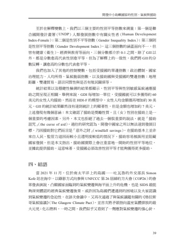 %u958b%u767c%u4e2d%u5c0f%u5cf6%u5dbc%u570b%u5bb6%u7684%u6027%u5225%u3001%u6c23%u5019%u8207%u63f4%u52a939%u81f3%u65bc%u5728%u89e3%u91cb%u8b8a%u6578%u4e0a%uff0c%u6211%u5011%u4ee5%u4e09%u500b%u4e3b%u8981%u7684%u6027%u5225%u5e73%u7b49%u6307%u6578%u4f86%u6e2c%u91cf%uff1a%u7b2c%u4e00%u500b%u662f%u806f%u5408%u570b%u958b%u767c%u8a08%u756b%u7f72%uff08UNDP%uff09%u4eba%u985e%u767c%u5c55%u6307%u6578%u4e2d%u6709%u95dc%u5973%u6027%u8005%uff08Human Development Index-Female%uff09%uff1b%u7b2c%u4e8c%u500b%u662f%u6027%u5225%u4e0d%u5e73%u7b49%u6307%u6578%uff08Gender Inequality Index%uff09%uff1b%u7b2c%u4e09%u500b%u5247%u662f%u6027%u5225%u5e73%u7b49%u6307%u6578%uff08Gender Development Index%uff09%u3002%u9019%u4e09%u500b%u6307%u6578%u7684%u6db5%u84cb%u9762%u5411%u4e0d%u4e00%uff0c%u4f46%u7686%u6709%u5065%u5eb7%uff08%u885b%u751f%uff09%u3001%u7d93%u6fdf%u8207%u6559%u80b2%u7b49%u9762%u5411%uff0c%u4e09%u500b%u5206%u6578%u90fd%u4ecb%u65bc0-1%u4e4b%u9593%uff0c%u9664%u4e86GII%u4ee5%u5916%uff0c%u90fd%u662f%u5206%u6578%u6108%u9ad8%u4ee3%u8868%u6027%u5225%u6108%u5e73%u7b49%uff0c%u4f46%u70ba%u4e86%u89e3%u91cb%u4e0a%u7684%u4e00%u81f4%u6027%uff0c%u6211%u5011%u5c07GII%u7684%u5206%u6578%u53cd%u8f49%uff0c%u8b93%u6108%u9ad8%u7684%u5206%u6578%u4e5f%u4ee3%u8868%u6108%u5e73%u7b49%u3002%u6211%u5011%u4e5f%u52a0%u5165%u4e86%u5176%u4ed6%u7684%u63a7%u5236%u8b8a%u6578%uff0c%u5305%u62ec%u53d7%u63f4%u570b%u7684%u55ae%u908a%u6307%u6578%uff1a%u653f%u6cbb%u9ad4%u5236%u3001%u570b%u5bb6%u6cbb%u7406%u80fd%u529b%u3001%u4eba%u5747%u6240%u5f97%u3001%u6c23%u5019%u8106%u5f31%u6307%u6578%uff0c%u4ee5%u53ca%u63f4%u52a9%u570b%u8207%u53d7%u63f4%u570b%u7684%u96d9%u908a%u6307%u6578%uff1a%u5730%u7406%u8ddd%u96e2%u3001%u96d9%u908a%u8cbf%u6613%u3001%u8a9e%u8a00%u540c%u8cea%u6027%u8207%u662f%u5426%u6709%u6b96%u6c11%u95dc%u4fc2%u7b49%u3002%u7d71%u8a08%u7d50%u679c%u4ee5%u53ca%u7a69%u5065%u6027%u6aa2%u6e2c%u7684%u7d50%u679c%u90fd%u986f%u793a%uff0c%u6027%u5225%u5e73%u7b49%u8207%u6027%u5225%u654f%u611f%u6c23%u5019%u9069%u61c9%u63f4%u52a9%u4e4b%u9593%u5448%u73fe%u6b63%u76f8%u95dc%u3002%u8209%u4f8b%u4f86%u8aaa%uff0cGDI%u6bcf%u589e%u52a0%u4e00%u55ae%u4f4d%uff0c%u53d7%u63f4%u570b%u5c31%u53ef%u4ee5%u591a%u7372%u5f97%u7d0460%u7f8e%u5143%u7684%u5973%u6027%u4eba%u5747%u63f4%u52a9%uff0c%u7136%u800c%u5728HDI-F%u7684%u6a21%u578b%u4e2d%uff0c%u5973%u6027%u4eba%u5747%u91d1%u984d%u50c5%u518d%u589e%u52a0%u7d0430%u7f8e%u5143%u3002GII%u7684%u7d71%u8a08%u7d50%u679c%u96d6%u7136%u6c92%u6709%u9054%u5230%u7d71%u8a08%u4e0a%u7684%u986f%u8457%u6027%uff0c%u4f46%u662f%u91d1%u984d%u4e5f%u589e%u52a0%u7d047%u7f8e%u5143%u3002%u4e0a%u8ff0%u767c%u73fe%u6709%u5e7e%u500b%u610f%u6db5%uff1a%u672c%u6587%u78ba%u8a8d%u4e86%u63f4%u52a9%u662f%u734e%u52f5%u6027%u8cea%uff0c%u4e14%uff08%u5973%uff09%u6027%u5225%u5728%u63f4%u52a9%u4e0a%u662f%u4e00%u500b%u91cd%u8981%u7684%u8003%u616e%u56e0%u7d20%u3002%u53e6%u5916%uff0c%u672c%u6587%u4e5f%u62d2%u7d55%u4e86%u904e%u53bb%u4e00%u500b%u5f88%u91cd%u8981%u7684%u8aaa%u6cd5%uff0c%u5c31%u662f%u300c%u63f4%u52a9%u8a5b%u5492%u300d%uff08the curse of aid%uff09%u3002%u904e%u5f80%u7684%u7814%u7a76%u8a8d%u70ba%uff0c%u958b%u767c%u4e2d%u570b%u5bb6%u4e4b%u6240%u4ee5%u7121%u6cd5%u9054%u5230%u767c%u5c55%u76ee%u6a19%uff0c%u4e43%u56e0%u63f4%u52a9%u5c0d%u5b83%u5011%u800c%u8a00%u662f%u300c%u610f%u5916%u4e4b%u8ca1%u300d%uff08windfall savings%uff09%u3002%u5728%u63f4%u52a9%u57fa%u672c%u4e0a%u4e26%u975e%u4f86%u81ea%u4eba%u6c11%u3001%u76e3%u7ba1%u529b%u9053%u56e0%u800c%u8f03%u5c0f%u4e14%u900f%u660e%u5ea6%u8f03%u4f4e%u7684%u60c5%u6cc1%u4e0b%uff0c%u63f4%u52a9%u5bb9%u6613%u88ab%u8aa4%u7528%u4e26%u963b%u7919%u570b%u5bb6%u767c%u5c55%u3002%u4f46%u662f%u672c%u6587%u6307%u51fa%uff0c%u63f4%u52a9%u570b%u5be6%u969b%u4e0a%u6703%u6ce8%u91cd%u7576%u5730%u4e00%u958b%u59cb%u7684%u6027%u5225%u5e73%u7b49%u5730%u4f4d%uff0c%u4e26%u64da%u6b64%u63d0%u4f9b%u63f4%u52a9%uff0c%u9019%u610f%u5473%u8457%uff0c%u53d7%u63f4%u570b%u5fc5%u9808%u6539%u5584%u6027%u5225%u5e73%u7b49%u624d%u80fd%u5920%u7372%u5f97%u66f4%u591a%u63f4%u52a9%u3002%u56db%u3001%u7d50%u8a9e%u75762021%u5e7411%u6708%uff0c%u4f4d%u65bc%u5357%u592a%u5e73%u6d0b%u4e0a%u7684%u5cf6%u570b%u5410%u74e6%u9b6f%u7684%u5916%u4ea4%u90e8%u9577Simon Kofe%u7ad9%u5728%u6d77%u4e2d%uff0c%u4ee5%u9304%u5f71%u65b9%u5f0f%u5411%u53c3%u8207UNFCCC%u7b2c26%u5c46%u7de0%u7d04%u65b9%u5927%u6703%uff08COP26%uff09%u7684%u6703%u773e%u767c%u8868%u6f14%u8aaa%uff0c%u51f8%u986f%u570b%u5bb6%u9762%u81e8%u5230%u7684%u6c23%u5019%u8b8a%u9077%u8207%u6d77%u5e73%u9762%u4e0a%u5347%u7684%u5371%u6a5f%uff0c%u4e5f%u662fSIDS%u6700%u80fd%u5920%u6df1%u523b%u9ad4%u8a8d%u7684%u7d93%u5178%u6c23%u5019%u8b8a%u9077%u5f8c%u679c%u3002%u6216%u8a31%u56e0%u70ba%u5cf6%u570b%u5011%u906d%u9047%u5230%u7684%u56f0%u5883%u4ee5%u53ca%u5927%u5bb6%u8a8d%u8b58%u5230%u6c23%u5019%u8b8a%u9077%u7684%u6025%u8feb%u6027%uff0c%u5728%u8a72%u6b21%u6703%u8b70%u4e2d%uff0c%u53c8%u518d%u6b21%u901a%u904e%u4e86%u8207%u6c23%u5019%u8b70%u984c%u6709%u95dc%u7684%u300a%u683c%u62c9%u65af%u54e5%u6c23%u5019%u5354%u8b70%u300b%uff08The Glasgow Climate Pact%uff09%uff0c%u4e26%u9996%u6b21%u5c07%u77db%u982d%u6307%u5411%u6eab%u5ba4%u6c23%u9ad4%u6392%u653e%u7684%u6700%u5927%u5143%u5147%uff1a%u5316%u77f3%u71c3%u6599%u3002%u4e00%u6642%u4e4b%u9593%uff0c%u6211%u5011%u4f3c%u4e4e%u53c8%u770b%u5230%u4e86%u4e00%u5291%u61c9%u5c0d%u6c23%u5019%u8b8a%u9077%u7684%u5f37%u5fc3%u91dd%u3002