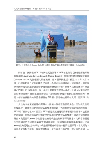 40%u4eba%u6587%u8207%u793e%u6703%u79d1%u5b78%u7c21%u8a0a%u300026%u53774%u671f%uff0e114%u5e749%u6708%u5716%u4e8c%uff1a%u5410%u74e6%u9b6f%u5916%u9577Simon Kofe%u65bcCOP26%u6642%u7ad9%u5728%u6d77%u4e2d%u767c%u8868%u6f14%u8aaa%uff08%u5716%u6e90%uff1aKofe %uff082023%uff09%uff09%u56db%u5e74%u5f8c%uff0c%u6fb3%u6d32%u6839%u64da2023%u5e74%u8207%u5410%u74e6%u9b6f%u7c3d%u7f72%u30012024%u5e74%u751f%u6548%u7684%u300a%u6fb3%u5410%u7766%u9130%u53cb%u597d%u806f%u76df%u5354%u8b70%u300b%uff08Australia-Tuvalu Falepili Union Treaty%uff09%uff0c%u958b%u59cb%u5411%u5410%u570b%u958b%u653e%u6c23%u5019%u7c3d%u8b49%uff08climate visa%uff09%uff0c%u5141%u8a31%u5410%u570b%u4eba%u6c11%u5728%u6fb3%u6d32%u5de5%u4f5c%u3001%u7559%u5b78%u8207%u751f%u6d3b%u3002%u622a%u81f32025%u5e747%u670823%u65e5%uff0c%u5df2%u7d93%u6709%u8d85%u904e%u516b%u6210%u7684%u5410%u570b%u4eba%u6c11%u7533%u8acb%uff0c%u5e0c%u671b%u53ef%u4ee5%u79fb%u5c45%u6fb3%u6d32%u3002%u9019%u610f%u5473%u8457%uff0c%u5118%u7ba1%u4e16%u754c%u5404%u570b%u8207%u570b%u969b%u7d44%u7e54%u91dd%u5c0d%u6c23%u5019%u8b8a%u9077%u554f%u984c%u9678%u7e8c%u7aef%u51fa%u5c0d%u7b56%uff0c%u671f%u671b%u53ef%u4ee5%u6709%u6548%u61c9%u5c0d%uff0c%u4f46%u7576%u81ea%u5df1%u7684%u570b%u571f%u57282050%u5e74%u6642%uff0c%u6709%u4e00%u534a%u4ee5%u4e0a%u5c07%u7d93%u5e38%u6027%u88ab%u6f6e%u6c34%u6df9%u6c92%uff0c%u5410%u570b%u4eba%u6c11%u9084%u662f%u5fc5%u9808%u63a1%u53d6%u5be6%u969b%u884c%u52d5%uff0c%u96e2%u958b%u5bb6%u9109%u91cd%u65b0%u5b9a%u5c45%uff0c%u907f%u514d%u6c23%u5019%u8b8a%u9077%u5c0d%u4ed6%u5011%u7684%u5a01%u8105%u8207%u5371%u5bb3%u3002%u7136%u800c%uff0c%u6bcf%u5e74%u6fb3%u6d32%u63d0%u4f9b%u7684%u7c3d%u8b49%u540d%u984d%u50c5%u6709280%u500b%uff0c%u8981%u5bb9%u7d0d%u5410%u570b%u6240%u6709%u4eba%u6c11%uff0c%u9700%u8981%u56db%u5341%u5e74%u5de6%u53f3%u7684%u6642%u9593%u3002%u5973%u6027%u5411%u4f86%u5728%u6c23%u5019%u8b8a%u9077%u7684%u5c0d%u7b56%u4e2d%uff0c%u626e%u6f14%u4e00%u500b%u76f8%u7576%u91cd%u8981%u7684%u89d2%u8272%uff0c%u56e0%u70ba%u5f9e%u5973%u6027%u7684%u89d2%u5ea6%u51fa%u767c%uff0c%u6703%u4f7f%u5f97%u6211%u5011%u66f4%u7406%u89e3%u6c23%u5019%u8b8a%u9077%u7684%u554f%u984c%uff0c%u4e5f%u80fd%u5920%u5236%u5b9a%u51fa%u66f4%u5468%u5ef6%u7684%u65b9%u6848%u3002SIDS%u7684%u300c%u512a%u52e2%u300d%u5728%u65bc%uff0c%u6b63%u56e0%u70baSIDS%u90fd%u662f%u6c23%u5019%u8b8a%u9077%u7684%u53d7%u5bb3%u8005%u800c%u975e%u52a0%u5bb3%u8005%uff0c%u5b83%u5011%u66f4%u80fd%u8a8d%u77e5%u5230%uff0c%u4ec0%u9ebc%u653f%u7b56%u6216%u662f%u884c%u52d5%u66f4%u80fd%u5920%u5354%u52a9%u5b83%u5011%u61c9%u5c0d%u6c23%u5019%u8b8a%u9077%u3002%u900f%u904e%u672c%u6587%u7684%u5be6%u8b49%u7814%u7a76%uff0c%u6211%u5011%u767c%u73feSIDS%u4e2d%u5973%u6027%u5730%u4f4d%u8f03%u9ad8%u6216%u662f%u6027%u5225%u8f03%u5e73%u7b49%u7684%u570b%u5bb6%uff0c%u6bd4%u8f03%u5bb9%u6613%u7372%u5f97OECD%u570b%u5bb6%u7684%u6027%u5225%u654f%u611f%u6c23%u5019%u8b8a%u9077%u9069%u61c9%u63f4%u52a9%u3002%u9019%u7a2e%u63f4%u52a9%u6a23%u614b%u662f%u734e%u52f5%u5c0e%u5411%uff0c%u4ee3%u8868SIDS%u80fd%u5920%u900f%u904e%u81ea%u8eab%u7684%u52aa%u529b%uff0c%u6216%u662f%u570b%u969b%u793e%u6703%u7684%u5354%u52a9%u4f86%u63d0%u9ad8%u6027%u5225%u5e73%u7b49%u3002%u672c%u6587%u8a8d%u70ba%uff0c%u9019%u4e5f%u6703%u4f7f%u5f97%u5c0d%u5916%u63f4%u52a9%u3001%u6c23%u5019%u8b8a%u9077%u5c0d%u7b56%u3001%u5973%u6027%u5730%u4f4d%u4e09%u8005%u4e4b%u9593%uff0c%u6709%u6b63%u5411%u7684%u767c%u5c55%u3002%u5973