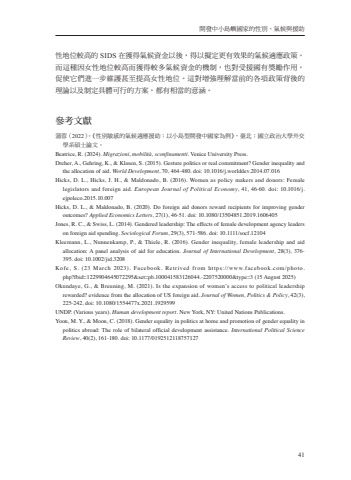 %u958b%u767c%u4e2d%u5c0f%u5cf6%u5dbc%u570b%u5bb6%u7684%u6027%u5225%u3001%u6c23%u5019%u8207%u63f4%u52a941%u6027%u5730%u4f4d%u8f03%u9ad8%u7684SIDS%u5728%u7372%u5f97%u6c23%u5019%u8cc7%u91d1%u4ee5%u5f8c%uff0c%u5f97%u4ee5%u64ec%u5b9a%u66f4%u6709%u6548%u679c%u7684%u6c23%u5019%u9069%u61c9%u653f%u7b56%u3002%u800c%u9019%u7a2e%u56e0%u5973%u6027%u5730%u4f4d%u8f03%u9ad8%u800c%u7372%u5f97%u8f03%u591a%u6c23%u5019%u8cc7%u91d1%u7684%u6a5f%u5236%uff0c%u4e5f%u5c0d%u53d7%u63f4%u570b%u6709%u734e%u52f5%u4f5c%u7528%uff0c%u4fc3%u4f7f%u5b83%u5011%u9032%u4e00%u6b65%u7dad%u8b77%u751a%u81f3%u63d0%u9ad8%u5973%u6027%u5730%u4f4d%u3002%u9019%u5c0d%u589e%u5f37%u7406%u89e3%u7576%u524d%u7684%u5404%u9805%u653f%u7b56%u80cc%u5f8c%u7684%u7406%u8ad6%u4ee5%u53ca%u5236%u5b9a%u5177%u9ad4%u53ef%u884c%u7684%u65b9%u6848%uff0c%u90fd%u6709%u76f8%u7576%u7684%u610f%u6db5%u3002%u53c3%u8003%u6587%u737b%u84b2%u84c9%uff082022%uff09%u3002%u300a%u6027%u5225%u654f%u611f%u7684%u6c23%u5019%u9069%u61c9%u63f4%u52a9%uff1a%u4ee5%u5c0f%u5cf6%u578b%u958b%u767c%u4e2d%u570b%u5bb6%u70ba%u4f8b%u300b%uff0c%u81fa%u5317%uff1a%u570b%u7acb%u653f%u6cbb%u5927%u5b78%u5916%u4ea4%u5b78%u7cfb%u78a9%u58eb%u8ad6%u6587%u3002Beatrice, R. (2024). Migrazioni, mobilit%u00e0, sconfinamenti. Venice University Press.Dreher, A., Gehring, K., & Klasen, S. (2015). Gesture politics or real commitment? Gender inequality and the allocation of aid. World Development, 70, 464-480. doi: 10.1016/j.worlddev.2014.07.016Hicks, D. L., Hicks, J. H., & Maldonado, B. (2016). Women as policy makers and donors: Female legislators and foreign aid. European Journal of Political Economy, 41, 46-60. doi: 10.1016/j.ejpoleco.2015.10.007Hicks, D. L., & Maldonado, B. (2020). Do foreign aid donors reward recipients for improving gender outcomes? Applied Economics Letters, 27(1), 46-51. doi: 10.1080/13504851.2019.1606405Jones, R. C., & Swiss, L. (2014). Gendered leadership: The effects of female development agency leaders on foreign aid spending. Sociological Forum, 29(3), 571-586. doi: 10.1111/socf.12104Kleemann, L., Nunnenkamp, P., & Thiele, R. (2016). Gender inequality, female leadership and aid allocation: A panel analysis of aid for education. Journal of International Development, 28(3), 376-395. doi: 10.1002/jid.3208Kofe, S. (23 March 2023). Facebook. Retrived from https://www.facebook.com/photo.php?fbid=1229904645072295&set=pb.100041583126044.-2207520000&type=3 (15 August 2025)Okundaye, G., & Breuning, M. (2021). Is the expansion of women%u2019s access to political leadership rewarded? evidence from the allocation of US foreign aid. Journal of Women, Politics & Policy, 42(3), 225-242. doi: 10.1080/1554477x.2021.1929599UNDP. (Various years). Human development report. New York, NY: United Nations Publications.Yoon, M. Y., & Moon, C. (2018). Gender equality in politics at home and promotion of gender equality in politics abroad: The role of bilateral official development assistance. International Political Science Review, 40(2), 161-180. doi: 10.1177/0192512118757127