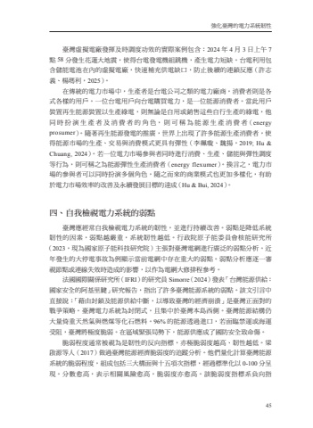 %u5f37%u5316%u81fa%u7063%u7684%u96fb%u529b%u7cfb%u7d71%u97cc%u602745%u81fa%u7063%u865b%u64ec%u96fb%u5ee0%u767c%u63ee%u53ca%u6642%u8abf%u5ea6%u529f%u6548%u7684%u5be6%u969b%u6848%u4f8b%u5305%u542b%uff1a2024%u5e744%u67083%u65e5%u4e0a%u53487%u9ede58%u5206%u767c%u751f%u82b1%u84ee%u5927%u5730%u9707%uff0c%u4f7f%u5f97%u53f0%u96fb%u767c%u96fb%u6a5f%u7d44%u8df3%u6a5f%uff0c%u7522%u751f%u96fb%u529b%u77ed%u7f3a%u3002%u53f0%u96fb%u5229%u7528%u5305%u542b%u5132%u80fd%u96fb%u6c60%u5728%u5167%u7684%u865b%u64ec%u96fb%u5ee0%uff0c%u5feb%u901f%u88dc%u5145%u4f9b%u96fb%u7f3a%u53e3%uff0c%u9632%u6b62%u5f8c%u7e8c%u7684%u9023%u9396%u53cd%u61c9%uff08%u8a31%u5fd7%u7fa9%u3001%u694a%u746a%u5229%uff0c2025%uff09%u3002%u5728%u50b3%u7d71%u7684%u96fb%u529b%u5e02%u5834%u4e2d%uff0c%u751f%u7522%u8005%u662f%u53f0%u96fb%u516c%u53f8%u4e4b%u985e%u7684%u96fb%u529b%u5ee0%u5546%uff0c%u6d88%u8cbb%u8005%u5247%u662f%u5404%u5f0f%u5404%u6a23%u7684%u7528%u6236%u3002%u4e00%u4f4d%u53f0%u96fb%u7528%u6236%u5411%u53f0%u96fb%u8cfc%u8cb7%u96fb%u529b%uff0c%u662f%u4e00%u4f4d%u80fd%u6e90%u6d88%u8cbb%u8005%u3002%u7576%u6b64%u7528%u6236%u88dd%u7f6e%u518d%u751f%u80fd%u6e90%u88dd%u7f6e%u4ee5%u751f%u7522%u7da0%u96fb%uff0c%u5247%u7121%u8ad6%u662f%u81ea%u7528%u6216%u92b7%u552e%u9019%u4e9b%u81ea%u884c%u751f%u7522%u7684%u7da0%u96fb%uff0c%u4ed6%u540c %u6642 %u626e %u6f14 %u751f %u7522 %u8005 %u53ca %u6d88 %u8cbb %u8005 %u7684 %u89d2 %u8272%uff0c %u5247 %u53ef %u7a31 %u70ba %u80fd %u6e90 %u751f %u7522 %u6d88 %u8cbb %u8005%uff08energy prosumer%uff09%u3002%u96a8%u8457%u518d%u751f%u80fd%u6e90%u767c%u96fb%u7684%u63a8%u5ee3%uff0c%u4e16%u754c%u4e0a%u51fa%u73fe%u4e86%u8a31%u591a%u80fd%u6e90%u751f%u7522%u6d88%u8cbb%u8005%uff0c%u4f7f%u5f97%u80fd%u6e90%u5e02%u5834%u7684%u751f%u7522%u3001%u4ea4%u6613%u8207%u6d88%u8cbb%u6a21%u5f0f%u66f4%u5177%u6709%u5f48%u6027%uff08%u674e%u59f5%u7487%u3001%u9b4f%u63da%uff0c2019; Hu & Chuang, 2024%uff09%u3002%u82e5%u4e00%u4f4d%u96fb%u529b%u5e02%u5834%u53c3%u8207%u8005%u540c%u6642%u9032%u884c%u6d88%u8cbb%u3001%u751f%u7522%u3001%u5132%u80fd%u8207%u5f48%u6027%u8abf%u5ea6%u7b49%u884c%u70ba%uff0c%u5247%u53ef%u7a31%u4e4b%u70ba%u80fd%u6e90%u5f48%u6027%u751f%u7522%u6d88%u8cbb%u8005%uff08energy flexumer%uff09%u3002%u63db%u8a00%u4e4b%uff0c%u96fb%u529b%u5e02%u5834%u7684%u53c3%u8207%u8005%u53ef%u4ee5%u540c%u6642%u626e%u6f14%u591a%u500b%u89d2%u8272%uff0c%u96a8%u4e4b%u800c%u4f86%u7684%u5546%u696d%u6a21%u5f0f%u4e5f%u66f4%u52a0%u591a%u6a23%u5316%uff0c%u6709%u52a9%u65bc%u96fb%u529b%u5e02%u5834%u6548%u7387%u7684%u6539%u5584%u53ca%u6c38%u7e8c%u767c%u5c55%u76ee%u6a19%u7684%u9054%u6210%uff08Hu & Bui, 2024%uff09%u3002%u56db%u3001%u81ea%u6211%u6aa2%u8996%u96fb%u529b%u7cfb%u7d71%u7684%u5f31%u9ede%u81fa%u7063%u61c9%u7d93%u5e38%u81ea%u6211%u6aa2%u8996%u96fb%u529b%u7cfb%u7d71%u7684%u97cc%u6027%uff0c%u4e26%u9032%u884c%u6301%u7e8c%u6539%u5584%u3002%u5f31%u9ede%u662f%u964d%u4f4e%u7cfb%u7d71%u97cc%u6027%u7684%u56e0%u7d20%uff0c%u5f31%u9ede%u8d8a%u56b4%u91cd%uff0c%u7cfb%u7d71%u97cc%u6027%u8d8a%u4f4e%u3002%u884c%u653f%u9662%u539f%u5b50%u80fd%u59d4%u54e1%u6703%u6838%u80fd%u7814%u7a76%u6240%uff082023%uff0c%u73fe%u70ba%u570b%u5bb6%u539f%u5b50%u80fd%u79d1%u6280%u7814%u7a76%u9662%uff09%u4e3b%u5f35%u5c0d%u81fa%u7063%u96fb%u7db2%u9032%u884c%u5ee3%u6cdb%u7684%u5f31%u9ede%u5206%u6790%u3002%u8fd1%u5e74%u767c%u751f%u7684%u5927%u505c%u96fb%u4e8b%u6545%u70ba%u4f8b%u986f%u793a%u7576%u524d%u96fb%u7db2%u4e2d%u5b58%u5728%u91cd%u5927%u7684%u5f31%u9ede%u3002%u5f31%u9ede%u5206%u6790%u61c9%u9010%u4e00%u5be9%u8996%u7bc0%u9ede%u6216%u9023%u7dda%u5931%u6548%u6642%u9020%u6210%u7684%u5f71%u97ff%uff0c%u4ee5%u4f5c%u70ba%u96fb%u7db2%u5927%u4fee%u6392%u7a0b%u53c3%u8003%u3002%u6cd5%u570b%u570b%u969b%u95dc%u4fc2%u7814%u7a76%u6240%uff08IFRI%uff09%u7684%u7814%u7a76%u54e1Simorre %uff082024%uff09%u767c%u8868%u300c%u53f0%u7063%u80fd%u6e90%u4f9b%u7d66%uff1a%u570b%u5bb6%u5b89%u5168%u7684%u963f%u57fa%u91cc%u8171%u300d%u7814%u7a76%u5831%u544a%uff0c%u6307%u51fa%u4e86%u8a31%u591a%u81fa%u7063%u80fd%u6e90%u7cfb%u7d71%u7684%u5f31%u9ede%u3002%u8a72%u6587%u5f15%u8a00%u4e2d%u76f4%u63a5%u8aaa%uff1a%u300c%u85c9%u7531%u5c01%u9396%u53ca%u80fd%u6e90%u4f9b%u7d66%u4e2d%u65b7%uff0c%u4ee5%u5c0e%u81f4%u81fa%u7063%u7684%u7d93%u6fdf%u5d29%u6f70%u300d%u662f%u81fa%u7063%u6b63%u9762%u5c0d%u7684%u6230%u722d%u7b56%u7565%u3002%u81fa%u7063%u96fb%u529b%u7cfb%u7d71%u70ba%u5c01%u9589%u5f0f%uff0c%u4e14%u96c6%u4e2d%u65bc%u81fa%u7063%u672c%u5cf6%u897f%u5074%u3002%u81fa%u7063%u80fd%u6e90%u7d50%u69cb%u4ecd%u5927%u91cf%u501a%u91cd%u5929%u7136%u6c23%u8207%u71c3%u7164%u7b49%u5316%u77f3%u71c3%u6599%u300296%%u7684%u80fd%u6e90%u900f%u904e%u9032%u53e3%uff0c%u82e5%u9762%u81e8%u7981%u904b%u6216%u6d77%u904b%u53d7%u963b%uff0c%u81fa%u7063%u5c07%u6975%u5ea6%u8106%u5f31%u3002%u5728%u5340%u57df%u7dca%u5f35%u5c40%u52e2%u4e0b%uff0c%u80fd%u6e90%u4f9b%u61c9%u6210%u4e86%u570b%u9632%u5b89%u5168%u81f4%u547d%u50b7%u3002%u8106%u5f31%u7a0b%u5ea6%u901a%u5e38%u88ab%u8996%u70ba%u662f%u97cc%u6027%u7684%u53cd%u5411%u6307%u6a19%uff0c%u4ea6%u6975%u8106%u5f31%u5ea6%u8d8a%u9ad8%u3001%u97cc%u6027%u8d8a%u4f4e%u3002%u6881%u555f%u6e90%u7b49%u4eba%uff082017%uff09%u505a%u904e%u81fa%u7063%u80fd%u6e90%u7d93%u6fdf%u8106%u5f31%u5ea6%u7684%u8ffd%u8e64%u5206%u6790%u3002%u4ed6%u5011%u91cf%u5316%u8a08%u7b97%u81fa%u7063%u80fd%u6e90%u7cfb%u7d71%u7684%u8106%u5f31%u7a0b%u5ea6%uff0c%u7d44%u6210%u5305%u62ec%u4e09%u5927%u69cb%u9762%u8207%u5341%u4e94%u9805%u6b21%u6307%u6a19%uff0c%u7d93%u904e%u6a19%u6e96%u5316%u4ee50-100%u5206%u5448%u73fe%u3002%u5206%u6578%u6108%u9ad8%uff0c%u8868%u793a%u76f8%u95dc%u98a8%u96aa%u6108%u9ad8%uff0c%u8106%u5f31%u5ea6%u4ea6%u6108%u9ad8%u3002%u8a72%u8106%u5f31%u5ea6%u6307%u6a19%u7cfb%u8ca0%u5411%u6307