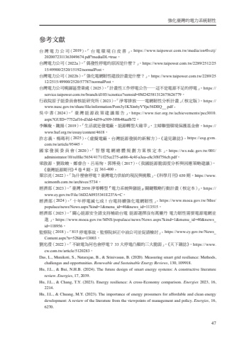 %u5f37%u5316%u81fa%u7063%u7684%u96fb%u529b%u7cfb%u7d71%u97cc%u602747%u53c3%u8003%u6587%u737b%u53f0%u7063%u96fb%u529b%u516c%u53f8%uff082019%uff09%u3002%u300c %u53f0 %u96fb %u74b0 %u5883 %u767d %u76ae %u66f8 %u300d%u3002https://www.taipower.com.tw/media/on4lvctj/ 2020072311363049674.pdf?mediaDL=true%u3002%u53f0%u7063%u96fb%u529b%u516c%u53f8%uff082022a%uff09%u3002%u300c%u5076%u767c%u6027%u505c%u96fb%u7684%u539f%u56e0%u662f%u4ec0%u9ebc%uff1f%u300d%u3002https://www.taipower.com.tw/2289/2512/2515/49900/2520/15192/normalPost%u3002%u53f0%u7063%u96fb%u529b%u516c%u53f8%uff082022b%uff09%u3002%u300c%u5f37%u5316%u96fb%u7db2%u97cc%u6027%u5efa%u8a2d%u8a08%u756b%u662f%u4ec0%u9ebc%uff1f%u300d%u3002https://www.taipower.com.tw/2289/2512/2515/49900/2520/57787/normalPost%u3002%u53f0%u7063%u96fb%u529b%u516c%u53f8%u6843%u5712%u5340%u71df%u696d%u8655%uff082025%uff09%u3002%u300c%u8a08%u756b%u6027%u5de5%u4f5c%u505c%u96fb%u516c%u544a%u9019%u4e0d%u662f%u96fb%u6e90%u4e0d%u8db3%u7684%u505c%u96fb%u300d%u3002https://service.taipower.com.tw/branch/d103/xcnotice?xsmsid=0M242581312675626779%u3002%u884c%u653f%u9662%u539f%u5b50%u80fd%u59d4%u54e1%u6703%u6838%u80fd%u7814%u7a76%u6240%uff082023%uff09%u3002%u300c%u6de8%u96f6%u6392%u653e%u96fb%u7db2%u97cc%u6027%u5206%u6790%u8a08%u756b%u300d%uff08%u6838%u5b9a%u7248%uff09%u3002https://www.nusc.gov.tw/share/file/information/Pom3y1KXtn6yVYpc56DllQ__.pdf%u3002%u5433%u4e2d%u66f8%uff082024%uff09%u3002%u300c %u81fa %u7063 %u80fd %u6e90 %u653f %u7b56 %u5efa %u8b70 %u5831 %u544a %u300d%u3002https://www.tier.org.tw/achievements/pec3010.aspx?GUID=7752af16-d3dd-4d59-a509-3f0b48aafb72%u3002%u674e%u59f5%u7487%u3001%u9b4f%u63da%uff082019%uff09%u3002%u300c%u751f%u6d3b%u5c31%u662f%u767c%u96fb%u5ee0%uff0c%u80fd%u6e90%u8f49%u578b%u5927%u78ba%u5e78%u300d%uff0c%u4e3b%u5a66%u806f%u76df%u74b0%u5883%u4fdd%u8b77%u57fa%u91d1%u6703%u3002https://www.huf.org.tw/essay/content/4618%u3002%u8a31%u5fd7%u7fa9%u3001%u694a%u746a%u5229%uff082025%uff09%u3002%u3008%u865b%u64ec%u96fb%u5ee0%uff0c%u53f0%u7063%u80fd%u6e90%u767c%u5c55%u7684%u65b0%u89e3%u65b9%u3009%uff0c%u300a%u9060%u898b%u96dc%u8a8c%u300b%u3002https://esg.gvm.com.tw/article/95445%u3002%u570b%u5bb6%u767c%u5c55%u59d4%u54e1%u6703%uff082020%uff09%u3002%u300c %u667a %u6167 %u96fb %u7db2 %u7e3d %u9ad4 %u898f %u5283 %u65b9 %u6848 %u6838 %u5b9a %u672c %u300d%u3002https://ws.ndc.gov.tw/001/administrator/10/relfile/5654/4171/f25cc275-a686-4c4f-a3ea-e8c3f8f756cb.pdf%u3002%u6881%u555f%u6e90%u3001%u5289%u81f4%u5cfb%u3001%u912d%u777f%u5408%u3001%u5442%u6613%u6042%u3001%u90ed%u535a%u582f%uff082017%uff09%u3002%u3008%u6211%u570b%u80fd%u6e90%u8106%u5f31%u5ea6%u5206%u6790%u8207%u56e0%u61c9%u7b56%u7565%u5efa%u8b70%u3009%uff0c%u300a%u81fa%u7063%u80fd%u6e90%u671f%u520a%u300b 4%u53774%u671f%uff0c%u9801361-400%u3002%u8449%u5b97%u6d38%uff082022%uff09%u3002%u300c%u70ba%u4ec0%u9ebc%u6703%u505c%u96fb%uff1f%u81fa%u7063%u96fb%u529b%u4f9b%u7d66%u7684%u73fe%u6cc1%u8207%u6311%u6230%u300d%uff0c%u300a%u79d1%u5b78%u6708%u520a%u300b 630%u671f%u3002https://www.scimonth.com.tw/archives/5734%u3002%u7d93%u6fdf%u90e8%uff082023%uff09%u3002%u300c%u81fa%u70632050%u6de8%u96f6%u8f49%u578b%u300e%u96fb%u529b%u7cfb%u7d71%u8207%u5132%u80fd%u300f%u95dc%u9375%u6230%u7565%u884c%u52d5%u8a08%u756b%uff08%u6838%u5b9a%u672c%uff09%u300d%u3002https://www.ey.gov.tw/File/16D2A0935341E23?A=C%u3002%u7d93%u6fdf%u90e8%uff082024%uff09%u3002%u300c%u5341%u5e74%u505c%u96fb%u6e1b%u4e03%u6210%uff01%u53f0%u96fb%u6301%u7e8c%u5f37%u5316%u96fb%u7db2%u97cc%u6027%u300d%u3002https://www.moea.gov.tw/Mns/populace/news/News.aspx?kind=1&menu_id=40&news_id=113515%u3002%u7d93%u6fdf%u90e8%uff082025%uff09%u3002%u300c%u95dc%u5fc3%u80fd%u6e90%u5b89%u5168%u8acb%u652f%u6301%u88dc%u52a9%u53f0%u96fb%u80fd%u6e90%u9078%u64c7%u6c92%u6709%u842c%u9748%u4e39%u96fb%u529b%u97cc%u6027%u9700%u8981%u96fb%u6e90%u96fb%u7db2%u4e26%u9032 %u300d%u3002https://www.moea.gov.tw/MNS/populace/news/News.aspx?kind=1&menu_id=40&news_id=118956%u3002%u76e3%u5bdf%u9662%uff082018%uff09%u3002%u300c815%u505c%u96fb%u4e8b%u6545%uff0c%u76e3%u5bdf%u9662%u7cfe%u6b63%u4e2d%u6cb9%u516c%u53f8%u4e26%u4fc3%u8acb%u6aa2%u8a0e%u300d%u3002https://www.cy.gov.tw/News_Content.aspx?n=528&s=13003%u3002%u5289%u5149%u7005%uff082022%uff09%u3002%u300c%u4e0d%u7f3a%u96fb%u70ba%u4f55%u4e5f%u6703%u505c%u96fb%uff1f33%u5927%u505c%u96fb%u51f8%u986f%u7684%u4e09%u5927%u8106%u5f31%u300d%uff0c%u300a%u5929%u4e0b%u96dc%u8a8c%u300b%u3002https://www.cw.com.tw/article/5120283%u3002Das, L., Munikoti, S., Natarajan, B., & Srinivasan, B. (2020). Measuring smart grid resilience: Methods, challenges and opportunities. Renewable and Sustainable Energy Reviews, 130, 109918.Hu, J.L., & Bui, N.H.B. (2024). The future design of smart energy systems: A constructive literature review. Energies, 17, 2039.Hu, J.L., & Chang, T.Y. (2023). Energy resilience: A cross-Economy comparison. Energies 2023, 16, 2214.Hu, J.L., & Chuang, M.Y. (2023). The importance of energy prosumers for affordable and clean energy development: A review of the literature from the viewpoints of management and policy. Energies, 16, 6270.