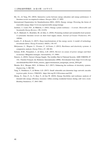 48%u4eba%u6587%u8207%u793e%u6703%u79d1%u5b78%u7c21%u8a0a%u300026%u53774%u671f%uff0e114%u5e749%u6708Hu, J.L., & Yang, P.S. (2024). Interactive cycles between energy education and energy preferences: A literature review on empirical evidence. Energies 2024, 17, 5092.International Organization for Standardization (ISO). (2025). Energy storage: Powering the future of renewable energy. https://www.iso.org/renewable-energy/storageJasi%u016bnas, J., Lund, P.D., & Mikkola, J. (2021). Energy system resilience %u2013 A review. Renewable and Sustainable Energy Reviews, 150, 111476.Jia, F., Shahzadi, G., Bourlakis, M., & John, A. (2024). Promoting resilient and sustainable food systems: A systematic literature review on short food supply chains. Journal of Cleaner Production, 435, 140364.Landis, F., & Rausch, S. (2017). Deep transformations of the energy sector: A model of technology investment choice. Energy Economics, 68(S1), 136-147.Molyneaux, L., Wagner, L., Froome, C., & Foster, J. (2012). Resilience and electricity systems: A comparative analysis. Energy Policy, 47, 188-201.Salman, H.M., Pasupuleti, J., & Sabry, A.H. (2023). Review on causes of power outages and their occurrence: Mitigation strategies. Sustainability, 15, 15001.Simorre, A. (2024). Taiwan%u2019s Energy Supply: The Achilles Heel of National Security. ASIE.VISIONS, N%u00b0 142, l%u2019Institut Fran%u00e7ais des Relations Internationales (IFRI). Downloaded from https://www.ifri.org/sites/default/files/2024-10/ifri_simorre_approvisionnement_energetique_taiwan_2024.pdfWender, B.A., Morgan, M.G., & Holmes, K.J. (2017). Enhancing the resilience of electricity systems. Engineering, 3, 580-582.Yang, Y., Nishikawa, T., & Motter, A.E. (2017). Small vulnerable sets determine large network cascades in power grids. Science, 358(6365). https://doi.org/10.1126/science.aan3184Zhang, X., Xiao, F., Li, Y., Ran, Y., & Gao W. (2024). Energy flexibility and resilience analysis of demand-side energy efficiency measures within existing residential houses during cold wave event. Building Simulation, 17, 1043-1063.