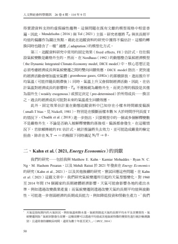 50%u4eba%u6587%u8207%u793e%u6703%u79d1%u5b78%u7c21%u8a0a%u300026%u53774%u671f%uff0e114%u5e749%u6708%u5f97%u5be6%u8b49%u8cc7%u6599%u652f%u6301%u7684%u865b%u5047%u7dda%u6027%u8da8%u52e2%u3002%u9019%u500b%u554f%u984c%u5728%u65e2%u6709%u6587%u737b%u7684%u6a21%u578b%u898f%u683c%u4e2d%u76f8%u7576%u666e%u904d%u3002%u56e0%u6b64%uff0cMendelsohn %uff082016%uff09%u8207Tol %uff082021%uff09%u4e3b%u5f35%uff0c%u7814%u7a76%u8005%u61c9%u5c07%u8207%u5176%u9577%u671f%u5e73%u5747%u503c%u7684%u504f%u96e2%u4f5c%u70ba%u95dc%u6ce8%u7126%u9ede%uff0c%u85c9%u6b64%u5728%u8ffd%u8e64%u8cc7%u6599%u7684%u7814%u7a76%u4e2d%u7372%u5f97%u4e0d%u504f%u4f30%u8a08%u3002%u9019%u6a23%u7684%u8f49%u63db%u540c%u6642%u4e5f%u96b1%u542b%u4e86%u4e00%u7a2e%u300c%u9069%u61c9%u300d%uff08adaptation%uff09%u7684%u6a21%u578b%u5316%u65b9%u5f0f%u3002%u7b2c%u4e09%uff0c%u8ffd%u8e64%u8cc7%u6599%u7814%u7a76%u4e2d%u5e38%u7528%u7684%u56fa%u5b9a%u6548%u679c%uff08fixed effects, FE%uff09%u4f30%u8a08%u5f0f%uff0c%u5f80%u5f80%u5047%u8a2d%u6c23%u5019%u8b8a%u6578%u662f%u56b4%u683c%u5916%u751f%u7684%u3002%u7136%u800c%uff0c%u5728Nordhaus %uff081992%uff09%u7684%u52d5%u614b%u6574%u5408%u6c23%u5019%u7d93%u6fdf%u6a21%u578b%uff08the Dynamic Integrated Climate-Economy model, DICE model%uff09%u4e2d%uff0c%u6838%u5fc3%u601d%u60f3%u6b63%u662f%u5fc5%u9808%u8003%u616e%u7d93%u6fdf%u6210%u9577%u8207%u6c23%u5019%u8b8a%u9077%u4e4b%u9593%u7684%u96d9%u5411%u56de%u994b%u6548%u61c9%u3002DICE model%u6307%u51fa%uff0c%u66f4%u5feb%u901f%u7684%u7d93%u6fdf%u6d3b%u52d5%u6703%u589e%u52a0%u6eab%u5ba4%u6c23%u9ad4%uff08greenhouse gases, GHGs%uff09%u7684%u7d2f%u7a4d%u6392%u653e%uff0c%u9032%u800c%u63a8%u5347%u5e73%u5747%u6c23%u6eab%uff08%u53ef%u80fd%u4f34%u96a8%u9577%u671f%u6eef%u5f8c%uff09%uff1b%u540c%u6642%uff0c%u6c23%u6eab%u4e0a%u5347%u53c8%u6703%u6291%u5236%u7d93%u6fdf%u6d3b%u52d5%u3002%u56e0%u6b64%uff0c%u5728%u4f30%u8a08%u6c23%u6eab%u5c0d%u7d93%u6fdf%u6210%u9577%u7684%u5f71%u97ff%u6642%uff0c%u4e0d%u61c9%u88ab%u8996%u70ba%u56b4%u683c%u5916%u751f%uff0c%u800c%u66f4%u5408%u7406%u7684%u5047%u8a2d%u662f%u5176%u50c5%u70ba%u5f31%u5916%u751f%uff08weakly exogenous%uff09%u6216%u9810%u5b9a%u6c7a%u5b9a%uff08pre-determined%uff09%u65bc%u6240%u5f97%u6210%u9577%u2500%u63db%u8a00%u4e4b%uff0c%u904e%u53bb%u7684%u7d93%u6fdf%u6210%u9577%u53ef%u80fd%u5c0d%u672a%u4f86%u7684%u6c23%u6eab%u7522%u751f%u56de%u994b%u6548%u61c9%u3002%u6b64%u5916%uff0c%u56fa%u5b9a%u6548%u679c%u4f30%u8a08%u91cf%u5728%u52d5%u614b%u8ffd%u8e64%u8cc7%u6599%u4e2d%u5df2%u77e5%u5b58%u5728%u5c0f%u6a23%u672c%u6642%u9593%u7dad%u5ea6%u504f%u8aa4%uff08small-T bias%uff0c%u898bNickell, 1981%uff09%uff0c%u7279%u5225%u662f%u5728%u6a6b%u65b7%u9762%u6a23%u672c%u6578N%u5927%u65bc%u6642%u9593%u5e8f%u5217%u9577%u5ea6T%u7684%u60c5%u6cc1%u4e0b%u3002Chudik et al. %uff082018%uff09%u9032%u4e00%u6b65%u6307%u51fa%uff0c%u53ea%u8981%u6a21%u578b%u4e2d%u7684%u4e00%u500b%u6216%u591a%u500b%u89e3%u91cb%u8b8a%u6578%u4e0d%u662f%u56b4%u683c%u5916%u751f%uff0c%u4e0d%u8ad6%u662f%u5426%u7d0d%u5165%u88ab%u89e3%u91cb%u8b8a%u6578%u7684%u843d%u5f8c%u9805%uff0c%u504f%u8aa4%u90fd%u6703%u767c%u751f%u3002%u5728%u9019%u7a2e%u60c5%u6cc1%u4e0b%uff0c%u82e5%u4f9d%u8cf4%u50b3%u7d71%u7684FE%u4f30%u8a08%u5f0f%uff0c%u7d71%u8a08%u63a8%u8ad6%u5c07%u5931%u53bb%u6548%u529b%uff0c%u4e26%u53ef%u80fd%u9020%u6210%u56b4%u91cd%u7684%u6aa2%u5b9a%u626d%u66f2%uff0c%u9664%u975e%u5728%u7684%u6975%u9650%u4e0b%u540c%u6642%u6eff%u8db3%u3002%u4e8c%u3001 Kahn et al. %uff082021, Energy Economics%uff09%u7684%u8ca2%u737b%u6211%u5011%u7684%u7814%u7a76%u5305%u62ec%u6211%u8207Matthew E. Kahn%u3001Kamiar Mohaddes%u3001Ryan N. C. Ng%u3001M. Hashem Pesaran%u3001%u4ee5%u53caMehdi Raissi%u65bc2021%u5e74%u767c%u8868%u5728Energy Economics%u7684%u7814%u7a76%uff08Kahn et al., 2021%uff09%uff0c%u4ee5%u53ca%u5176%u4ed6%u5f8c%u7e8c%u7684%u7814%u7a76%uff0c%u5617%u8a66%u56de%u61c9%u9019%u4e9b%u554f%u984c%u3002%u5728Kahn et al. %uff082021%uff09%u9019%u7bc7%u6587%u7ae0%u4e2d%uff0c%u6211%u5011%u7814%u7a76%u6c23%u5019%u8b8a%u9077%u6240%u5f15%u8d77%u7684%u5929%u6c23%u578b%u614b%u8b8a%u5316%uff0c%u5c0d1960%u81f32014%u5e74%u9593174%u500b%u570b%u5bb6%u7684%u9577%u671f%u7e3d%u9ad4%u7d93%u6fdf%u5f71%u97ff%u3002%u5929%u6c23%u53ef%u80fd%u6703%u5f71%u97ff%u5404%u5730%u7684%u7522%u51fa%u6c34%u6e96%uff0c%u4f8b%u5982%u900f%u904e%u6539%u8b8a%u8fb2%u696d%u7522%u91cf%uff1b%u800c%u6c23%u5019%u8b8a%u9077%u5247%u900f%u904e%u6539%u8b8a%u5929%u6c23%u7684%u9577%u671f%u5e73%u5747%u503c%u8207%u6ce2%u52d5%u6027%uff0c%u53ef%u80fd%u9032%u4e00%u6b65%u524a%u5f31%u7d93%u6fdf%u7684%u9577%u671f%u6210%u9577%u80fd%u529b%uff0c%u4f8b%u5982%u964d%u4f4e%u6295%u8cc7%u548c%u52de%u52d5%u751f%u7522%u529b%u30021%u6211%u50111%u5929%u6c23%u662f%u6307%u77ed%u671f%u5167%u7684%u5927%u6c23%u72c0%u6cc1%uff0c%u4f8b%u5982%u6c23%u6eab%u548c%u964d%u6c34%u91cf%u3002%u6c23%u5019%u5247%u63cf%u8ff0%u5929%u6c23%u7684%u9577%u671f%u5e73%u5747%u6c34%u5e73%u53ca%u5176%u8b8a%u7570%u6027%u3002%u6c23%u5019%u8b8a%u9077%u5247%u6307%u300c%u6c23%u5019%u72c0%u614b%u767c%u751f%u6539%u8b8a%uff0c%u9019%u7a2e%u6539%u8b8a%u53ef%u4ee5%u900f%u904e%u5e73%u5747%u503c%u6216%u5176%u4ed6%u6c23%u5019%u7279%u5fb5%u7684%u8b8a%u7570%u6027%u9032%u884c%u7d71%u8a08%u6aa2%u6e2c%u8b58%u5225%uff0c%u4e14%u901a%u5e38%u6703%u6301%u7e8c%u8f03%u9577%u6642%u9593%uff0c%u901a%u5e38%u70ba%u6578%u5341%u5e74%u751a%u81f3%u66f4%u4e45%u300d%u3002%uff08IPCC, 2014%uff09