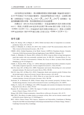 56%u4eba%u6587%u8207%u793e%u6703%u79d1%u5b78%u7c21%u8a0a%u300026%u53774%u671f%uff0e114%u5e749%u6708%u7531%u65bc%u57fa%u6e96%u4f30%u8a08%u7d50%u679c%u986f%u793a%uff0c%u964d%u6c34%u8b8a%u6578%u76f8%u5c0d%u6b77%u53f2%u5e38%u614b%u7684%u504f%u96e2%uff08%u7121%u8ad6%u9ad8%u65bc%u6216%u4f4e%u65bc%uff09%u5728m=30%u7684%u60c5%u6cc1%u4e0b%u5747%u4e0d%u5177%u7d71%u8a08%u986f%u8457%u6027%uff0c%u56e0%u6b64%u6211%u5011%u91cd%u65b0%u4f30%u8a08%u65b9%u7a0b%u5f0f%uff0c%u53bb%u6389%u964d%u6c34%u8b8a%u6578%uff0c%u5728%u6a21%u578b%u8a2d%u5b9a2%u4e2d%u8a2d%u5b9a%u3002%u7d50%u679c%u986f%u793a%uff0c%u6c23%u6eab%u6301%u7e8c%u504f%u96e2%u5176%u6b77%u53f2%u5e38%u614b%uff0c%u5c0d%u9577%u671f%u7d93%u6fdf%u6210%u9577%u5177%u6709%u8ca0%u9762%u5f71%u97ff%u3002%u5177%u9ad4%u800c%u8a00%uff0cHPJ-FE%u7684%u4f30%u8a08%u7d50%u679c%u986f%u793a%uff0c%u82e5%u6c23%u6eab%u6301%u7e8c%u6bcf%u5e74%u9ad8%u65bc%u5176%u6b77%u53f2%u5e38%u614b0.01%u02daC%uff0c%u5c07%u4f7f%u4eba%u5747%u5be6%u8ceaGDP%u6210%u9577%u7387%u5728%u9577%u671f%u4e0b%u964d0.0586%u500b%u767e%u5206%u9ede%uff08%u8a08%u7b97%u65b9%u5f0f%u70ba%uff09%uff1b%u82e5%u6c23%u6eab%u6bcf%u5e74%u4f4e%u65bc%u5176%u6b77%u53f2%u5e38%u614b0.01%u02daC%uff0c%u5c07%u4f7f%u4eba%u5747%u5be6%u8ceaGDP%u6210%u9577%u7387%u6bcf%u5e74%u4e0b%u964d0.0520%u500b%u767e%u5206%u9ede%uff08%u8a08%u7b97%u65b9%u5f0f%u70ba%uff09%u3002%u53c3%u8003%u6587%u737bBurke, M., Hsiang, S.M., & Miguel, E. (2015). Global non-linear effect of temperature on economic production. Nature, 527, 235-239.Cashin, P., Mohaddes, K., & Raissi, M. (2017). Fair weather or foul? The macroeconomic effects of El Ni%u00f1o. Journal of International Economics, 106, 37-54.CIESIN. (2016). Gridded Population of the World, Version 4 (GPWv4): Population Density. Columbia University, NASA Socioeconomic Data and Applications Center (SEDAC), Palisades, NY.Chudik, A., Mohaddes, K., Pesaran, M.H., & Raissi, M. (2016). Long-run effects in large heterogeneous panel data models with cross-sectionally correlated errors. In: Hill, R.C., Gonzalez-Rivera, G., Lee, T.-H. (Eds.), Advances in Econometrics (Volume 36): Essays in Honor of Aman Ullah. Emerald Publishing, pp. 85-135 (Chapter 4).Chudik, A., Pesaran, M.H., & Yang, J.-C. (2018). Half-panel jackknife fixed effects estimation of panels with weakly exogenous regressors. Journal of Applied Econometrics, 33(6), 816-836.Dell, M., Jones, B.F., & Olken, B.A. (2009). Temperature and income: Reconciling new cross-sectional and panel estimates. The American Economic Review, 99(2), 198-204.Dell, M., Jones, B.F., & Olken, B.A. (2012). Temperature shocks and economic growth: Evidence from the last half century. American Economic Journal: Macroeconomics, 4(3), 66-95.Dell, M., Jones, B.F., & Olken, B.A. (2014). What do we learn from the weather? The new climateeconomy literature. Journal of Economic Literature, 52(3), 740-798.Desbordes, R., & Eberhardt, M. (2024). Climate change and economic prosperity: Evidence from a flexible damage function. Journal of Environmental Economics and Management, 125, 102974.Gallup, J.L., Sachs, J.D., & Mellinger, A.D. (1999). Geography and economic development. International Regional Science Review, 22(2), 179-232.Henseler, M., & Schumacher, I. (2019). The impact of weather on economic growth and its production factors. Climatic Change, 154(3), 417-433.Hsiang, S.M. (2016). Climate econometrics. Annual Review of Resource Economics, 8(1), 43-75.IMF. (2017). The effects of weather shocks on economic activity: How can low-income countries cope? In World Economic Outlook, pp. 117-183(Chapter 3).IPCC. (2014). Climate Change 2014: Impacts, Adaptation and Vulnerability, Contribution of Working Group II to the Fifth Assessment Report of the Intergovernmental Panel on Climate Change, Volume 1. Cambridge University Press, Cambridge.
