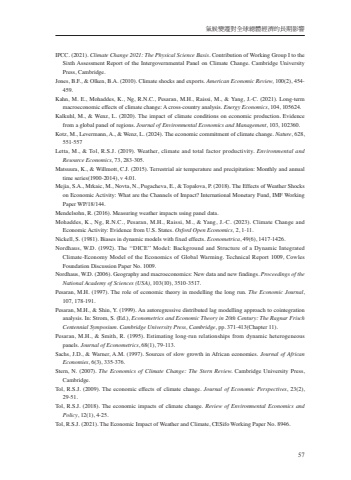 %u6c23%u5019%u8b8a%u9077%u5c0d%u5168%u7403%u7e3d%u9ad4%u7d93%u6fdf%u7684%u9577%u671f%u5f71%u97ff57IPCC. (2021). Climate Change 2021: The Physical Science Basis. Contribution of Working Group I to the Sixth Assessment Report of the Intergovernmental Panel on Climate Change. Cambridge University Press, Cambridge.Jones, B.F., & Olken, B.A. (2010). Climate shocks and exports. American Economic Review, 100(2), 454-459.Kahn, M. E., Mohaddes, K., Ng, R.N.C., Pesaran, M.H., Raissi, M., & Yang, J.-C. (2021). Long-term macroeconomic effects of climate change: A cross-country analysis. Energy Economics, 104, 105624.Kalkuhl, M., & Wenz, L. (2020). The impact of climate conditions on economic production. Evidence from a global panel of regions. Journal of Environmental Economics and Management, 103, 102360.Kotz, M., Levermann, A., & Wenz, L. (2024). The economic commitment of climate change. Nature, 628, 551-557Letta, M., & Tol, R.S.J. (2019). Weather, climate and total factor productivity. Environmental and Resource Economics, 73, 283-305.Matsuura, K., & Willmott, C.J. (2015). Terrestrial air temperature and precipitation: Monthly and annual time series(1900-2014), v 4.01.Mejia, S.A., Mrkaic, M., Novta, N., Pugacheva, E., & Topalova, P. (2018). The Effects of Weather Shocks on Economic Activity: What are the Channels of Impact? International Monetary Fund, IMF Working Paper WP/18/144.Mendelsohn, R. (2016). Measuring weather impacts using panel data.Mohaddes, K., Ng, R.N.C., Pesaran, M.H., Raissi, M., & Yang, J.-C. (2023). Climate Change and Economic Activity: Evidence from U.S. States. Oxford Open Economics, 2, 1-11.Nickell, S. (1981). Biases in dynamic models with fixed effects. Econometrica, 49(6), 1417-1426.Nordhaus, W.D. (1992). The %u2018%u2018DICE%u2019%u2019 Model: Background and Structure of a Dynamic Integrated Climate-Economy Model of the Economics of Global Warming. Technical Report 1009, Cowles Foundation Discussion Paper No. 1009.Nordhaus, W.D. (2006). Geography and macroeconomics: New data and new findings. Proceedings of the National Academy of Sciences (USA), 103(10), 3510-3517.Pesaran, M.H. (1997). The role of economic theory in modelling the long run. The Economic Journal, 107, 178-191.Pesaran, M.H., & Shin, Y. (1999). An autoregressive distributed lag modelling approach to cointegration analysis. In: Strom, S. (Ed.), Econometrics and Economic Theory in 20th Century: The Ragnar Frisch Centennial Symposium. Cambridge University Press, Cambridge, pp. 371-413(Chapter 11).Pesaran, M.H., & Smith, R. (1995). Estimating long-run relationships from dynamic heterogeneous panels. Journal of Econometrics, 68(1), 79-113.Sachs, J.D., & Warner, A.M. (1997). Sources of slow growth in African economies. Journal of African Economies, 6(3), 335-376.Stern, N. (2007). The Economics of Climate Change: The Stern Review. Cambridge University Press, Cambridge.Tol, R.S.J. (2009). The economic effects of climate change. Journal of Economic Perspectives, 23(2), 29-51.Tol, R.S.J. (2018). The economic impacts of climate change. Review of Environmental Economics and Policy, 12(1), 4-25.Tol, R.S.J. (2021). The Economic Impact of Weather and Climate, CESifo Working Paper No. 8946.