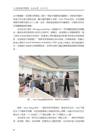 66%u4eba%u6587%u8207%u793e%u6703%u79d1%u5b78%u7c21%u8a0a%u300026%u53774%u671f%uff0e114%u5e749%u6708%u6cd5%u4e0d%u5920%u56b4%u8b39%uff0c%u5176%u5f71%u97ff%u529b%u5c07%u964d%u4f4e%uff1b%u7b2c%u56db%uff0c%u5b78%u8853%u624b%u7a3f%u64b0%u5beb%u7684%u56b4%u8b39%u6027%uff0c%u5373%u4f7f%u7814%u7a76%u512a%u79c0%uff0c%u8868%u9054%u4e0d%u4f73%u4e5f%u6703%u4ee4%u8b80%u8005%u6cae%u55aa%uff0c%u96e3%u4ee5%u7372%u5f97%u5be9%u7a3f%u4eba%u9752%u775e%uff0cAlice Wang%u8a8d%u70ba%uff0c%u4f5c%u8005%u61c9%u78ba%u4fdd%u7a3f%u4ef6%u6e05%u6670%u6613%u61c2%u4e14%u5f15%u4eba%u5165%u52dd%uff0c%u4e26%u5f9e%u4e00%u958b%u59cb%u5c31%u91cd%u8996%u5beb%u4f5c%u7684%u56b4%u8b39%u6027%uff0c%u4ed4%u7d30%u601d%u8003%u5982%u4f55%u5448%u73fe%u95dc%u9375%u8ad6%u9ede%u548c%u8b49%u64da%u3002%u9019%u4e5f%u662f%u70ba%u4ec0%u9ebc%u5728%u201cPrivileged and Picky%u201d%u9019%u7bc7%u8ad6%u6587%u4e2d%uff0c%u7814%u7a76%u5718%u968a%u900f%u904e%u5305%u62ec%u5be6%u9a57%u6cd5%u3001%u8abf%u67e5%u6cd5%u8207%u771f%u5be6%u8cc7%u6599%u5206%u6790%u7684%u4e94%u9805%u7814%u7a76%uff0c%u5efa%u69cb%u51fa%u4e00%u5957%u6e05%u6670%u7684%u5fc3%u7406%u6a5f%u5236%u6a21%u578b%uff1a%u500b%u4eba%u5c0d%u65bc%u81ea%u8eab%u793e%u6703%u5730%u4f4d%u7684%u8a8d%u77e5%uff0c%u80fd%u6fc0%u767c%u5fc3%u7406%u7279%u6b0a%u611f%u9032%u800c%u5f71%u97ff%u5176%u5c0d%u7522%u54c1%u7684%u6311%u5254%u7a0b%u5ea6%u3002%u9019%u5957%u6a21%u578b%u4e0d%u50c5%u6311%u6230%u4e86%u300c%u5f31%u52e2%u8005%u66f4%u9700%u6311%u5254%u4ee5%u4fdd%u5b58%u8cc7%u6e90%u300d%u7684%u50b3%u7d71%u5047%u8a2d%uff0c%u66f4%u878d%u5408%u793e%u6703%u5fc3%u7406%u5b78%u4e2dSocial Dominance Orientation %uff08SDO, %u793e%u6703%u4e3b%u5bb0%u50be%u5411%uff09%u8207%u884c%u92b7%u6d88%u8cbb%u884c%u70ba%uff0c%u70ba%u6311%u5254%u884c%u70ba%u63d0%u4f9b%u5168%u65b0%u89e3%u91cb%u6846%u67b6%uff0c%u4e26%u5e36%u4f86%u54c1%u724c%u53ef%u64da%u6b64%u8abf%u6574%u6e9d%u901a%u7b56%u7565%u7684%u5be6%u52d9%u61c9%u7528%u3002%u5716%u4e8c%uff1aAlice Wang%u6f14%u8b1b%u5999%u8a9e%u5982%u73e0%uff0c%u73fe%u5834%u5b78%u8005%u53cd%u61c9%u71b1%u70c8%u6700%u5f8c%uff0cAlice Wang%u6307%u51fa%uff0c%u4e00%u7bc7%u597d%u7684%u7814%u7a76%u9700%u8981%u6709%u4e00%u500b%u826f%u597d%u7684%u5b9a%u4f4d%u3002%u5b9a%u4f4d%u4e0d%u50c5%u662f%u70ba%u4e86%u51f8%u986f%u7814%u7a76%u8ca2%u737b%uff0c%u66f4%u662f%u8aaa%u670d%u5be9%u7a3f%u4eba%u8207%u8b80%u8005%u7684%u6838%u5fc3%u7b56%u7565%u3002%u800c%u8ad6%u6587%u7684%u826f%u597d%u5b9a%u4f4d%u9700%u5305%u542b%u4e09%u8981%u7d20%uff1a%uff081%uff09%u6709%u6545%u4e8b%uff1b%uff082%uff09%u6982%u5ff5%u6e05%u6670%uff1b%u8207%uff083%uff09%u958b%u5834%u5f15%u4eba%u5165%u52dd%u3002%u5728%u6545%u4e8b%u6027%u65b9%u9762%uff0c%u7814%u7a76%u5b9a%u4f4d%u5c31%u50cf%u662f%u4f01%u696d%u7684%u7522%u54c1%u300c%u50f9%u503c%u4e3b%u5f35%u300d%uff0c%u4e00%u500b%u597d%u7684%u5b78%u8853%u6545%u4e8b%uff0c%u662f%u660e%u78ba%u3001%u7c21%u77ed%u3001%u5bb9%u6613%u7406%u89e3%uff0c%u80fd%u5e6b%u52a9%u81ea%u5df1%u91d0%u6e05%u91cd%u9ede%uff0c%u4e5f%u6709%u52a9%u65bc%u4ed6%u4eba%u5feb%u901f%u638c%u63e1