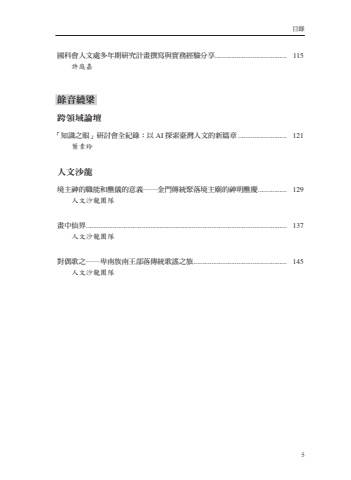 %u76ee%u93045%u570b%u79d1%u6703%u4eba%u6587%u8655%u591a%u5e74%u671f%u7814%u7a76%u8a08%u756b%u64b0%u5beb%u8207%u5be6%u52d9%u7d93%u9a57%u5206%u4eab........................................ 115%u8a31%u5ead%u5609%u9918%u97f3%u7e5e%u6881%u8de8%u9818%u57df%u8ad6%u58c7%u300c%u77e5%u8b58%u4e4b%u773c%u300d%u7814%u8a0e%u6703%u5168%u7d00%u9304%uff1a%u4ee5AI%u63a2%u7d22%u81fa%u7063%u4eba%u6587%u7684%u65b0%u7bc7%u7ae0 ........................... 121%u8449%u7d20%u73b2%u4eba%u6587%u6c99%u9f8d%u5883%u4e3b%u795e%u7684%u8077%u80fd%u548c%u91ae%u5100%u7684%u610f%u7fa9%u91d1%u9580%u50b3%u7d71%u805a%u843d%u5883%u4e3b%u5edf%u7684%u795e%u660e%u91ae%u6176................ 129%u4eba%u6587%u6c99%u9f8d%u5718%u968a%u756b%u4e2d%u4ed9%u754c................................................................................................................ 137%u4eba%u6587%u6c99%u9f8d%u5718%u968a%u5c0d%u5076%u6b4c%u4e4b%u2500%u5351%u5357%u65cf%u5357%u738b%u90e8%u843d%u50b3%u7d71%u6b4c%u8b20%u4e4b%u65c5.................................................... 145%u4eba%u6587%u6c99%u9f8d%u5718%u968a
