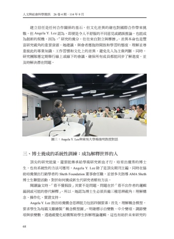 68%u4eba%u6587%u8207%u793e%u6703%u79d1%u5b78%u7c21%u8a0a%u300026%u53774%u671f%uff0e114%u5e749%u6708%u5efa%u7acb%u4fe1%u4efb%u662f%u4efb%u4f55%u5408%u4f5c%u95dc%u4fc2%u7684%u57fa%u77f3%uff0c%u4f46%u6587%u5316%u5dee%u7570%u7684%u78ba%u4e5f%u5c0d%u570b%u969b%u5408%u4f5c%u5e36%u4f86%u6311%u6230%uff0c%u4f46Angela Y. Lee%u8a8d%u70ba%uff0c%u5373%u4fbf%u662f%u4ee4%u4eba%u4e0d%u8212%u670d%u7684%u4e0d%u540c%u610f%u898b%u6216%u932f%u8aa4%u63a8%u8ad6%uff0c%u4e5f%u80fd%u6210%u70ba%u5275%u65b0%u7684%u5951%u6a5f%uff0c%u56e0%u70ba%uff0c%u300c%u7814%u7a76%u7684%u990a%u5206%uff0c%u5f80%u5f80%u4f86%u81ea%u5c0d%u7acb%u8207%u6469%u64e6%u300d%uff0c%u5dee%u7570%u672c%u8eab%u4e5f%u662f%u8c50%u5bcc%u7814%u7a76%u8996%u89d2%u7684%u91cd%u8981%u8cc7%u6e90%u3002%u5979%u5efa%u8b70%uff0c%u8207%u6703%u8005%u61c9%u62b1%u6301%u958b%u653e%u548c%u5b78%u7fd2%u7684%u614b%u5ea6%uff0c%u7406%u89e3%u4e26%u5c0a%u91cd%u5f7c%u6b64%u7684%u5c08%u696d%u77e5%u8b58%u3001%u5de5%u4f5c%u7fd2%u6163%u548c%u6587%u5316%u4e0a%u7684%u5dee%u7570%uff0c%u907f%u514d%u5148%u5165%u70ba%u4e3b%u505a%u5224%u65b7%u3002%u540c%u6642%uff0c%u7814%u7a76%u5718%u968a%u61c9%u5b9a%u671f%u8209%u884c%u7dda%u4e0a%u6216%u7dda%u4e0b%u7684%u6703%u8b70%uff0c%u78ba%u4fdd%u6240%u6709%u6210%u54e1%u90fd%u80fd%u540c%u6b65%u4e86%u89e3%u9032%u5ea6%uff0c%u4e26%u53ca%u6642%u89e3%u6c7a%u6f5b%u5728%u554f%u984c%u3002%u5716%u4e09%uff1aAngela Y. Lee%u8207%u6771%u5433%u5927%u5b78%u694a%u4fca%u660e%u6559%u6388%u5c0d%u8a71%u4e09%u3001%u535a%u58eb%u990a%u6210%u7684%u7cfb%u7d71%u6027%u8a13%u7df4%uff1a%u6210%u70ba%u89e3%u91cb%u4e16%u754c%u7684%u4eba%u9802%u5c16%u7684%u7814%u7a76%u80fd%u91cf%uff0c%u9084%u8981%u80fd%u50b3%u627f%u7d66%u5b78%u8853%u7814%u7a76%u65b0%u8840%u624d%u884c%uff0c%u57f9%u80b2%u51fa%u512a%u79c0%u7684%u535a%u58eb%u751f%uff0c%u4e5f%u6709%u7cfb%u7d71%u6027%u7684%u65b9%u6cd5%u53ef%u61c9%u7528%u3002Angela Y. Lee%u9664%u4e86%u662f%u9802%u5c16%u671f%u520a%u4e3b%u7de8%uff0c%u540c%u6642%u5728%u5354%u52a9%u57f9%u990a%u5091%u51fa%u884c%u92b7%u5b78%u8005%u7684 Sheth Foundation%u8463%u4e8b%u6703%u4efb%u8077%uff0c%u4e26%u66fe%u591a%u6b21%u6307%u5c0e AMA Sheth %u535a%u58eb%u751f%u806f%u76df%u6d3b%u52d5%uff0c%u5c0d%u65bc%u5982%u4f55%u990a%u6210%u65b0%u751f%u4ee3%u7814%u7a76%u8005%u9817%u6709%u65b9%u6cd5%u3002%u95b1%u8b80%u8ad6%u6587%u6642%uff0c%u300c%u770b%u4e0d%u61c2%u5047%u8a2d%u300d%u5176%u5be6%u4e0d%u662f%u554f%u984c%uff0c%u554f%u984c%u5728%u65bc%u300c%u770b%u4e0d%u51fa%u4f5c%u8005%u7684%u908f%u8f2f%u6f0f%u6d1e%u6216%u53ef%u80fd%u7684%u66ff%u4ee3%u89e3%u91cb%u300d%u3002%u6240%u4ee5%uff0c%u5979%u8a8d%u70ba%u535a%u58eb%u751f%u5fc5%u9808%u5177%u5099%u4e09%u7a2e%u601d%u8fa8%u8996%u89d2%uff1a%u7406%u89e3%u69cb%u5ff5%u3001%u64cd%u4f5c%u5316%u3001%u5be6%u8b49%u652f%u6301%u3002Angela Y. Lee%u6307%u51fa%u57f9%u990a%u69cb%u5ff5%u601d%u8fa8%u80fd%u529b%u5305%u62ec%u56db%u500b%u8981%u7d20%uff1a%u9996%u5148%uff0c%u7406%u89e3%u6982%u5ff5%u6a21%u578b%uff0c%u8981%u6c42%u5b78%u751f%u70ba%u6bcf%u7bc7%u6587%u737b%u7e6a%u88fd%u300c%u6982%u5ff5%u6a21%u578b%u5716%u300d%uff0c%u660e%u78ba%u6a19%u793a%u81ea%u8b8a%u6578%u3001%u4e2d%u4ecb%u8b8a%u9805%u3001%u8abf%u7bc0%u8b8a%u9805%u8207%u4f9d%u8b8a%u6578%uff0c%u900f%u904e%u8996%u89ba%u5316%u7d50%u69cb%u5e6b%u52a9%u5b78%u751f%u62c6%u89e3%u7406%u8ad6%u908f%u8f2f%uff0c%u9019%u4e5f%u6709%u52a9%u65bc%u672a%u4f86%u7814%u7a76%u7684
