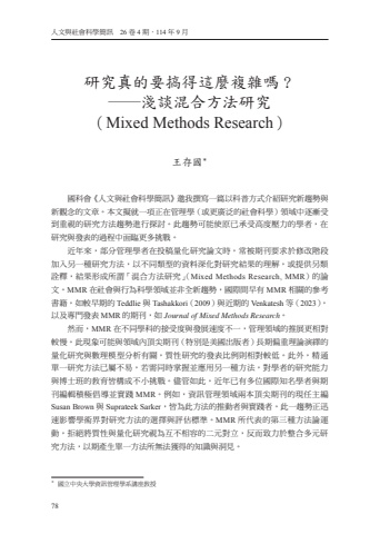 78%u4eba%u6587%u8207%u793e%u6703%u79d1%u5b78%u7c21%u8a0a%u300026%u53774%u671f%uff0e114%u5e749%u6708%u7814%u7a76%u771f%u7684%u8981%u641e%u5f97%u9019%u9ebc%u8907%u96dc%u55ce%uff1f%u2500%u6dfa%u8ac7%u6df7%u5408%u65b9%u6cd5%u7814%u7a76%uff08Mixed Methods Research%uff09%u738b%u5b58%u570b%uff0a%u570b%u79d1%u6703%u300a%u4eba%u6587%u8207%u793e%u6703%u79d1%u5b78%u7c21%u8a0a%u300b%u9080%u6211%u64b0%u5beb%u4e00%u7bc7%u4ee5%u79d1%u666e%u65b9%u5f0f%u4ecb%u7d39%u7814%u7a76%u65b0%u8da8%u52e2%u8207%u65b0%u89c0%u5ff5%u7684%u6587%u7ae0%u3002%u672c%u6587%u64ec%u5c31%u4e00%u9805%u6b63%u5728%u7ba1%u7406%u5b78%uff08%u6216%u66f4%u5ee3%u6cdb%u7684%u793e%u6703%u79d1%u5b78%uff09%u9818%u57df%u4e2d%u9010%u6f38%u53d7%u5230%u91cd%u8996%u7684%u7814%u7a76%u65b9%u6cd5%u8da8%u52e2%u9032%u884c%u63a2%u8a0e%u3002%u6b64%u8da8%u52e2%u53ef%u80fd%u4f7f%u539f%u5df2%u627f%u53d7%u9ad8%u5ea6%u58d3%u529b%u7684%u5b78%u8005%uff0c%u5728%u7814%u7a76%u8207%u767c%u8868%u7684%u904e%u7a0b%u4e2d%u9762%u81e8%u66f4%u591a%u6311%u6230%u3002%u8fd1%u5e74%u4f86%uff0c%u90e8%u5206%u7ba1%u7406%u5b78%u8005%u5728%u6295%u7a3f%u91cf%u5316%u7814%u7a76%u8ad6%u6587%u6642%uff0c%u5e38%u88ab%u671f%u520a%u8981%u6c42%u65bc%u4fee%u6539%u968e%u6bb5%u52a0%u5165%u53e6%u4e00%u7a2e%u7814%u7a76%u65b9%u6cd5%uff0c%u4ee5%u4e0d%u540c%u985e%u578b%u7684%u8cc7%u6599%u6df1%u5316%u5c0d%u7814%u7a76%u7d50%u679c%u7684%u7406%u89e3%uff0c%u6216%u63d0%u4f9b%u53e6%u985e%u8a6e%u91cb%uff0c%u7d50%u679c%u5f62%u6210%u6240%u8b02%u300c%u6df7%u5408%u65b9%u6cd5%u7814%u7a76%u300d%uff08Mixed Methods Research, MMR%uff09%u7684%u8ad6%u6587%u3002MMR%u5728%u793e%u6703%u8207%u884c%u70ba%u79d1%u5b78%u9818%u57df%u4e26%u975e%u5168%u65b0%u8da8%u52e2%uff0c%u570b%u969b%u9593%u65e9%u6709MMR%u76f8%u95dc%u7684%u53c3%u8003%u66f8%u7c4d%uff0c%u5982%u8f03%u65e9%u671f%u7684Teddlie%u8207Tashakkori %uff082009%uff09%u8207%u8fd1%u671f%u7684Venkatesh%u7b49%uff082023%uff09%uff0c%u4ee5%u53ca%u5c08%u9580%u767c%u8868MMR%u7684%u671f%u520a%uff0c%u5982Journal of Mixed Methods Research%u3002%u7136%u800c%uff0cMMR%u5728%u4e0d%u540c%u5b78%u79d1%u7684%u63a5%u53d7%u5ea6%u8207%u767c%u5c55%u901f%u5ea6%u4e0d%u4e00%uff0c%u7ba1%u7406%u9818%u57df%u7684%u63a8%u5c55%u66f4%u76f8%u5c0d%u8f03%u6162%u3002%u6b64%u73fe%u8c61%u53ef%u80fd%u8207%u9818%u57df%u5167%u9802%u5c16%u671f%u520a%uff08%u7279%u5225%u662f%u7f8e%u570b%u51fa%u7248%u8005%uff09%u9577%u671f%u504f%u91cd%u7406%u8ad6%u6f14%u7e79%u7684%u91cf%u5316%u7814%u7a76%u8207%u6578%u7406%u6a21%u578b%u5206%u6790%u6709%u95dc%uff0c%u8cea%u6027%u7814%u7a76%u7684%u767c%u8868%u6bd4%u4f8b%u5247%u76f8%u5c0d%u8f03%u4f4e%u3002%u6b64%u5916%uff0c%u7cbe%u901a%u55ae%u4e00%u7814%u7a76%u65b9%u6cd5%u5df2%u5c6c%u4e0d%u6613%uff0c%u82e5%u9700%u540c%u6642%u638c%u63e1%u4e26%u61c9%u7528%u53e6%u4e00%u7a2e%u65b9%u6cd5%uff0c%u5c0d%u5b78%u8005%u7684%u7814%u7a76%u80fd%u529b%u8207%u535a%u58eb%u73ed%u7684%u6559%u80b2%u7686%u69cb%u6210%u4e0d%u5c0f%u6311%u6230%u3002%u5118%u7ba1%u5982%u6b64%uff0c%u8fd1%u5e74%u5df2%u6709%u591a%u4f4d%u570b%u969b%u77e5%u540d%u5b78%u8005%u8207%u671f%u520a%u7de8%u8f2f%u7a4d%u6975%u5021%u5c0e%u4e26%u5be6%u8e10MMR%u3002%u4f8b%u5982%uff0c%u8cc7%u8a0a%u7ba1%u7406%u9818%u57df%u5169%u672c%u9802%u5c16%u671f%u520a%u7684%u73fe%u4efb%u4e3b%u7de8Susan Brown%u8207Suprateek Sarker%uff0c%u7686%u70ba%u6b64%u65b9%u6cd5%u7684%u63a8%u52d5%u8005%u8207%u5be6%u8e10%u8005%u3002%u6b64%u4e00%u8da8%u52e2%u6b63%u8fc5%u901f%u5f71%u97ff%u5b78%u8853%u754c%u5c0d%u7814%u7a76%u65b9%u6cd5%u7684%u9078%u64c7%u8207%u8a55%u4f30%u6a19%u6e96%u3002MMR%u6240%u4ee3%u8868%u7684%u7b2c%u4e09%u7a2e%u65b9%u6cd5%u8ad6%u904b%u52d5%uff0c%u62d2%u7d55%u5c07%u8cea%u6027%u8207%u91cf%u5316%u7814%u7a76%u8996%u70ba%u4e92%u4e0d%u76f8%u5bb9%u7684%u4e8c%u5143%u5c0d%u7acb%uff0c%u53cd%u800c%u81f4%u529b%u65bc%u6574%u5408%u591a%u5143%u7814%u7a76%u65b9%u6cd5%uff0c%u4ee5%u671f%u7522%u751f%u55ae%u4e00%u65b9%u6cd5%u6240%u7121%u6cd5%u7372%u5f97%u7684%u77e5%u8b58%u8207%u6d1e%u898b%u3002%uff0a%u570b%u7acb%u4e2d%u592e%u5927%u5b78%u8cc7%u8a0a%u7ba1%u7406%u5b78%u7cfb%u8b1b%u5ea7%u6559%u6388