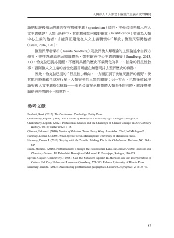 %u4eba%u8207%u975e%u4eba%uff1a%u4eba%u985e%u4e16%u4e0b%u5f8c%u6b96%u6c11%u4e3b%u7fa9%u7814%u7a76%u7684%u8f49%u541187%u8ad6%u5247%u6279%u8a55%u5f8c%u6b96%u6c11%u601d%u7dad%u4ecd%u5b58%u6709%u7269%u7a2e%u4e3b%u7fa9%uff08speciesism%uff09%u50be%u5411%uff0c%u4e3b%u5f35%u5fc5%u9808%u5148%u63ed%u793a%u5728%u4eba%u6587%u4e3b%u7fa9%u69cb%u5efa%u300c%u4eba%u985e%u300d%u904e%u7a0b%u4e2d%uff0c%u5176%u4ed6%u7269%u7a2e%u5982%u4f55%u88ab%u91ce%u7378%u5316%uff08beastification%uff09%u4e26%u6dea%u70ba%u4eba%u985e%u4e2d%u5fc3%u4e3b%u7fa9%u7684%u4ed6%u8005%uff0c%u624d%u80fd%u771f%u6b63%u907f%u514d%u5728%u4eba%u6587%u4e3b%u7fa9%u9a55%u6162%u4e2d%u300c%u89e3%u653e%u300d%u5f8c%u6b96%u6c11%u5f31%u52e2%u4ed6%u8005%uff08Islam, 2016, 120%uff09%u3002%u5f8c%u6b96%u6c11%u5b78%u8005%u6851%u67cf%uff08Juanita Sundberg%uff09%u5247%u6279%u8a55%u5f8c%u4eba%u985e%u7406%u8ad6%u7684%u4e3b%u8981%u8ad6%u8ff0%u4f86%u81ea%u897f%u65b9%u5b78%u754c%uff0c%u5f80%u5f80%u5ffd%u8996%u539f%u4f4f%u6c11%u77e5%u8b58%u9ad4%u7cfb%uff0c%u5e36%u6709%u6b50%u6d32%u4e2d%u5fc3%u4e3b%u7fa9%u7684%u5acc%u7591%uff08Sundberg, 2013, 33%uff09%u3002%u6070%u514b%u62c9%u5df4%u63d0%u4ea6%u63d0%u9192%uff0c%u4e0d%u61c9%u5c07%u5177%u9ad4%u7684%u6b77%u53f2%u4e0d%u7fa9%u7c21%u5316%u70ba%u55ae%u4e00%u3001%u62bd%u8c61%u7684%u884c%u661f%u6027%u6558%u4e8b%uff0c%u5426%u5247%u5f8c%u4eba%u6587%u4e3b%u7fa9%u7684%u666e%u4e16%u5316%u8a9e%u8a00%u53ef%u80fd%u5728%u7121%u610f%u9593%u62b9%u53bb%u6b96%u6c11%u6b77%u53f2%u7684%u75d5%u8de1%u3002%u56e0%u6b64%uff0c%u6070%u514b%u62c9%u5df4%u63d0%u7684%u300c%u884c%u661f%u6027%u300d%u8f49%u5411%uff0c%u4e00%u65b9%u9762%u62d3%u5c55%u4e86%u5f8c%u6b96%u6c11%u6279%u8a55%u7684%u8996%u91ce%uff0c%u4f7f%u5176%u80fd%u540c%u6642%u517c%u9867%u5168%u7403%u8207%u884c%u661f%u3001%u4eba%u985e%u8207%u591a%u65bc%u4eba%u985e%u7684%u95dc%u61f7%uff1b%u53e6%u4e00%u65b9%u9762%uff0c%u4e5f%u5c0d%u5f8c%u6b96%u6c11%u7406%u8ad6%u8207%u5f8c%u4eba%u6587%u4e3b%u7fa9%u63d0%u51fa%u6311%u6230%u2500%u5169%u8005%u5fc5%u9808%u5728%u627f%u64d4%u96c6%u9ad4%u4eba%u985e%u8cac%u4efb%u7684%u540c%u6642%uff0c%u7dad%u8b77%u6b77%u53f2%u8108%u7d61%u8207%u5dee%u7570%u7684%u4e0d%u53ef%u62b9%u715e%u6027%u3002%u53c3%u8003%u6587%u737bBradotti, Rosi. (2013). The Posthuman. Cambridge: Polity Press.Chakrabarty, Dipesh. (2021). The Climate of History in a Planetary Age. Chicago: Chicago UP.Chakrabarty, Dipesh. (2012). Postcolonial Studies and the Challenge of Climate Change. In New Literary History, 43(1) (Winter 2012): 1-18.Glissant, %u00c9douard. (2010). Poetics of Relation. Trans. Betsy Wing. Ann Arbor: The U of Michigan P.Haraway, Donna J. (2008). When Species Meet. Minneapolis: University of Minnesota Press.Haraway, Donna J. (2016). Staying with the Trouble: Making Kin in the Chthulucene. Durham, NC: Duke UP.Islam, Monirul. (2016). Posthumanism: Through the Postcolonial Lens. In Critical Posthu- manism and Planetary Futures, Ed. Debashish Banerji and Makarand R. Paranjape, Springer, 116-129.Spivak, Gayatri Chakravorty. (1988). Can the Subaltern Speak? In Marxism and the Interpretation of Culture. Ed. Cary Nelson and Lawrence Grossberg, 271-313. Urbana: University of Illinois Press.Sundberg, Juanita. (2013). Decolonizing posthumanist geographies. Cultural Geographies, 2(1): 33-47.