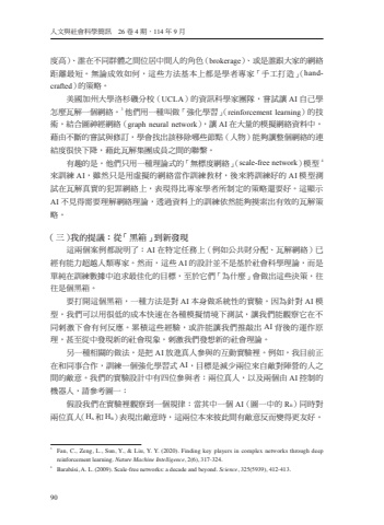 90%u4eba%u6587%u8207%u793e%u6703%u79d1%u5b78%u7c21%u8a0a%u300026%u53774%u671f%uff0e114%u5e749%u6708%u5ea6%u9ad8%uff09%u3001%u8ab0%u5728%u4e0d%u540c%u7fa4%u9ad4%u4e4b%u9593%u4f4d%u5c45%u4e2d%u9593%u4eba%u7684%u89d2%u8272%uff08brokerage%uff09%u3001%u6216%u662f%u8ab0%u8ddf%u5927%u5bb6%u7684%u7db2%u7d61%u8ddd%u96e2%u6700%u77ed%u3002%u7121%u8ad6%u6210%u6548%u5982%u4f55%uff0c%u9019%u4e9b%u65b9%u6cd5%u57fa%u672c%u4e0a%u90fd%u662f%u5b78%u8005%u5c08%u5bb6%u300c%u624b%u5de5%u6253%u9020%u300d%uff08handcrafted%uff09%u7684%u7b56%u7565%u3002%u7f8e%u570b%u52a0%u5dde%u5927%u5b78%u6d1b%u6749%u78ef%u5206%u6821%uff08UCLA%uff09%u7684%u8cc7%u8a0a%u79d1%u5b78%u5bb6%u5718%u968a%uff0c%u5617%u8a66%u8b93AI%u81ea%u5df1%u5b78%u600e%u9ebc%u74e6%u89e3%u4e00%u500b%u7db2%u7d61%u30023%u4ed6%u5011%u7528%u4e00%u7a2e%u53eb%u505a%u300c%u5f37%u5316%u5b78%u7fd2%u300d%uff08reinforcement learning%uff09%u7684%u6280%u8853%uff0c%u7d50%u5408%u5716%u795e%u7d93%u7db2%u7d61%uff08graph neural network%uff09%uff0c%u8b93AI%u5728%u5927%u91cf%u7684%u6a21%u64ec%u7db2%u7d61%u8cc7%u6599%u4e2d%uff0c%u85c9%u7531%u4e0d%u65b7%u7684%u5617%u8a66%u8207%u4fee%u8a02%uff0c%u5b78%u6703%u627e%u51fa%u8a72%u79fb%u9664%u54ea%u4e9b%u7bc0%u9ede%uff08%u4eba%u7269%uff09%u80fd%u5920%u8b93%u6574%u500b%u7db2%u7d61%u7684%u9023%u7d50%u5ea6%u5f88%u5feb%u4e0b%u964d%uff0c%u85c9%u6b64%u74e6%u89e3%u96c6%u5718%u6210%u54e1%u4e4b%u9593%u7684%u806f%u7e6b%u3002%u6709%u8da3%u7684%u662f%uff0c%u4ed6%u5011%u53ea%u7528%u4e00%u7a2e%u7406%u8ad6%u5f0f%u7684%u300c%u7121%u6a19%u5ea6%u7db2%u7d61%u300d%uff08scale-free network%uff09%u6a21%u578b4%u4f86%u8a13%u7df4AI%uff0c%u96d6%u7136%u53ea%u662f%u7528%u865b%u64ec%u7684%u7db2%u7d61%u7576%u4f5c%u8a13%u7df4%u6559%u6750%uff0c%u5f8c%u4f86%u5c07%u8a13%u7df4%u597d%u7684AI%u6a21%u578b%u6e2c%u8a66%u5728%u74e6%u89e3%u771f%u5be6%u7684%u72af%u7f6a%u7db2%u7d61%u4e0a%uff0c%u8868%u73fe%u5f97%u6bd4%u5c08%u5bb6%u5b78%u8005%u6240%u5236%u5b9a%u7684%u7b56%u7565%u9084%u8981%u597d%u3002%u9019%u986f%u793aAI%u4e0d%u898b%u5f97%u9700%u8981%u7406%u89e3%u7db2%u7d61%u7406%u8ad6%uff0c%u900f%u904e%u8cc7%u6599%u4e0a%u7684%u8a13%u7df4%u4f9d%u7136%u80fd%u5920%u6478%u7d22%u51fa%u6709%u6548%u7684%u74e6%u89e3%u7b56%u7565%u3002%uff08%u4e09%uff09%u6211%u7684%u63d0%u8b70%uff1a%u5f9e%u300c%u9ed1%u7bb1%u300d%u5230%u65b0%u767c%u73fe%u9019%u5169%u500b%u6848%u4f8b%u90fd%u8aaa%u660e%u4e86%uff1aAI%u5728%u7279%u5b9a%u4efb%u52d9%u4e0a%uff08%u4f8b%u5982%u516c%u5171%u8ca1%u5206%u914d%u3001%u74e6%u89e3%u7db2%u7d61%uff09%u5df2%u7d93%u6709%u80fd%u529b%u8d85%u8d8a%u4eba%u985e%u5c08%u5bb6%u3002%u7136%u800c%uff0c%u9019%u4e9bAI%u7684%u8a2d%u8a08%u4e26%u4e0d%u662f%u57fa%u65bc%u793e%u6703%u79d1%u5b78%u7406%u8ad6%uff0c%u800c%u662f%u55ae%u7d14%u5728%u8a13%u7df4%u6578%u64da%u4e2d%u8ffd%u6c42%u6700%u4f73%u5316%u7684%u76ee%u6a19%uff0c%u81f3%u65bc%u5b83%u5011%u300c%u70ba%u4ec0%u9ebc%u300d%u6703%u505a%u51fa%u9019%u4e9b%u6c7a%u7b56%uff0c%u5f80%u5f80%u662f%u500b%u9ed1%u7bb1%u3002%u8981%u6253%u958b%u9019%u500b%u9ed1%u7bb1%uff0c%u4e00%u7a2e%u65b9%u6cd5%u662f%u5c0dAI%u672c%u8eab%u505a%u7cfb%u7d71%u6027%u7684%u5be6%u9a57%u3002%u56e0%u70ba%u91dd%u5c0dAI%u6a21%u578b%uff0c%u6211%u5011%u53ef%u4ee5%u7528%u5f88%u4f4e%u7684%u6210%u672c%u5feb%u901f%u5728%u5404%u7a2e%u6a21%u64ec%u60c5%u5883%u4e0b%u6e2c%u8a66%uff0c%u8b93%u6211%u5011%u80fd%u89c0%u5bdf%u5b83%u5728%u4e0d%u540c%u523a%u6fc0%u4e0b%u6703%u6709%u4f55%u53cd%u61c9%u3002%u7d2f%u7a4d%u9019%u4e9b%u7d93%u9a57%uff0c%u6216%u8a31%u80fd%u8b93%u6211%u5011%u63a8%u6572%u51faAI%u80cc%u5f8c%u7684%u904b%u4f5c%u539f%u7406%uff0c%u751a%u81f3%u5f9e%u4e2d%u767c%u73fe%u65b0%u7684%u793e%u6703%u73fe%u8c61%uff0c%u523a%u6fc0%u6211%u5011%u767c%u60f3%u65b0%u7684%u793e%u6703%u7406%u8ad6%u3002%u53e6%u4e00%u7a2e%u76f8%u95dc%u7684%u505a%u6cd5%uff0c%u662f%u628aAI%u653e%u9032%u771f%u4eba%u53c3%u8207%u7684%u4e92%u52d5%u5be6%u9a57%u88e1%u3002%u4f8b%u5982%uff0c%u6211%u76ee%u524d%u6b63%u5728%u548c%u540c%u4e8b%u5408%u4f5c%uff0c%u8a13%u7df4%u4e00%u500b%u5f37%u5316%u5b78%u7fd2%u5f0fAI%uff0c%u76ee%u6a19%u662f%u6e1b%u5c11%u5169%u4f4d%u4f86%u81ea%u6575%u5c0d%u9663%u71df%u7684%u4eba%u4e4b%u9593%u7684%u6575%u610f%u3002%u6211%u5011%u7684%u5be6%u9a57%u8a2d%u8a08%u4e2d%u6709%u56db%u4f4d%u53c3%u8207%u8005%uff1a%u5169%u4f4d%u771f%u4eba%uff0c%u4ee5%u53ca%u5169%u500b%u7531AI%u63a7%u5236%u7684%u6a5f%u5668%u4eba%uff0c%u8acb%u53c3%u8003%u5716%u4e00%uff1a%u5047%u8a2d%u6211%u5011%u5728%u5be6%u9a57%u88e1%u89c0%u5bdf%u5230%u4e00%u500b%u898f%u5f8b%uff1a%u7576%u5176%u4e2d%u4e00%u500bAI %uff08%u5716%u4e00%u4e2d%u7684RB%uff09%u540c%u6642%u5c0d%u5169%u4f4d%u771f%u4eba%uff08HA%u548cHB%uff09%u8868%u73fe%u51fa%u6575%u610f%u6642%uff0c%u9019%u5169%u4f4d%u672c%u4f86%u5f7c%u6b64%u9593%u6709%u6575%u610f%u53cd%u800c%u8b8a%u5f97%u66f4%u53cb%u597d%u30023 Fan, C., Zeng, L., Sun, Y., & Liu, Y. Y. (2020). Finding key players in complex networks through deep reinforcement learning. Nature Machine Intelligence, 2(6), 317-324.4Barab%u00e1si, A. L. (2009). Scale-free networks: a decade and beyond. Science, 325(5939), 412-413.