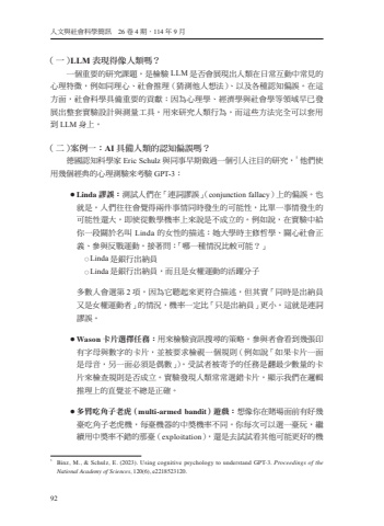 92%u4eba%u6587%u8207%u793e%u6703%u79d1%u5b78%u7c21%u8a0a%u300026%u53774%u671f%uff0e114%u5e749%u6708%uff08%u4e00%uff09 LLM %u8868%u73fe%u5f97%u50cf%u4eba%u985e%u55ce%uff1f%u4e00%u500b%u91cd%u8981%u7684%u7814%u7a76%u8ab2%u984c%uff0c%u662f%u6aa2%u9a57LLM%u662f%u5426%u6703%u5c55%u73fe%u51fa%u4eba%u985e%u5728%u65e5%u5e38%u4e92%u52d5%u4e2d%u5e38%u898b%u7684%u5fc3%u7406%u7279%u5fb5%uff0c%u4f8b%u5982%u540c%u7406%u5fc3%u3001%u793e%u6703%u63a8%u7406%uff08%u731c%u6e2c%u4ed6%u4eba%u60f3%u6cd5%uff09%u3001%u4ee5%u53ca%u5404%u7a2e%u8a8d%u77e5%u504f%u8aa4%u3002%u5728%u9019%u65b9%u9762%uff0c%u793e%u6703%u79d1%u5b78%u5177%u5099%u91cd%u8981%u7684%u8ca2%u737b%uff1a%u56e0%u70ba%u5fc3%u7406%u5b78%u3001%u7d93%u6fdf%u5b78%u8207%u793e%u6703%u5b78%u7b49%u9818%u57df%u65e9%u5df2%u767c%u5c55%u51fa%u6574%u5957%u5be6%u9a57%u8a2d%u8a08%u8207%u6e2c%u91cf%u5de5%u5177%uff0c%u7528%u4f86%u7814%u7a76%u4eba%u985e%u884c%u70ba%uff0c%u800c%u9019%u4e9b%u65b9%u6cd5%u5b8c%u5168%u53ef%u4ee5%u5957%u7528%u5230LLM%u8eab%u4e0a%u3002%uff08%u4e8c%uff09%u6848%u4f8b%u4e00%uff1aAI%u5177%u5099%u4eba%u985e%u7684%u8a8d%u77e5%u504f%u8aa4%u55ce%uff1f%u5fb7%u570b%u8a8d%u77e5%u79d1%u5b78%u5bb6Eric Schulz%u8207%u540c%u4e8b%u65e9%u671f%u505a%u904e%u4e00%u500b%u5f15%u4eba%u6ce8%u76ee%u7684%u7814%u7a76%uff0c5%u4ed6%u5011%u4f7f%u7528%u5e7e%u500b%u7d93%u5178%u7684%u5fc3%u7406%u6e2c%u9a57%u4f86%u8003%u9a57GPT-3%uff1a%u25cf Linda%u8b2c%u8aa4%uff1a%u6e2c%u8a66%u4eba%u5011%u5728%u300c%u9023%u8a5e%u8b2c%u8aa4%u300d%uff08conjunction fallacy%uff09%u4e0a%u7684%u504f%u8aa4%u3002%u4e5f%u5c31%u662f%uff0c%u4eba%u5011%u5f80%u5f80%u6703%u89ba%u5f97%u5169%u4ef6%u4e8b%u60c5%u540c%u6642%u767c%u751f%u7684%u53ef%u80fd%u6027%uff0c%u6bd4%u55ae%u4e00%u4e8b%u60c5%u767c%u751f%u7684%u53ef%u80fd%u6027%u9084%u5927%uff0c%u5373%u4f7f%u5f9e%u6578%u5b78%u6a5f%u7387%u4e0a%u4f86%u8aaa%u662f%u4e0d%u6210%u7acb%u7684%u3002%u4f8b%u5982%u8aaa%uff0c%u5728%u5be6%u9a57%u4e2d%u7d66%u4f60%u4e00%u6bb5%u95dc%u65bc%u540d%u53eb Linda %u7684%u5973%u6027%u7684%u63cf%u8ff0%uff1a%u5979%u5927%u5b78%u6642%u4e3b%u4fee%u54f2%u5b78%u3001%u95dc%u5fc3%u793e%u6703%u6b63%u7fa9%u3001%u53c3%u8207%u53cd%u6230%u904b%u52d5%u3002%u63a5%u8457%u554f%uff1a%u300c%u54ea%u4e00%u7a2e%u60c5%u6cc1%u6bd4%u8f03%u53ef%u80fd%uff1f%u300d%u25cbLinda %u662f%u9280%u884c%u51fa%u7d0d%u54e1%u25cbLinda %u662f%u9280%u884c%u51fa%u7d0d%u54e1%uff0c%u800c%u4e14%u662f%u5973%u6b0a%u904b%u52d5%u7684%u6d3b%u8e8d%u5206%u5b50%u591a%u6578%u4eba%u6703%u9078%u7b2c2%u9805%uff0c%u56e0%u70ba%u5b83%u807d%u8d77%u4f86%u66f4%u7b26%u5408%u63cf%u8ff0%uff0c%u4f46%u5176%u5be6%u300c%u540c%u6642%u662f%u51fa%u7d0d%u54e1%u53c8%u662f%u5973%u6b0a%u904b%u52d5%u8005%u300d%u7684%u60c5%u6cc1%uff0c%u6a5f%u7387%u4e00%u5b9a%u6bd4%u300c%u53ea%u662f%u51fa%u7d0d%u54e1%u300d%u66f4%u5c0f%u3002%u9019%u5c31%u662f%u9023%u8a5e%u8b2c%u8aa4%u3002%u25cf Wason%u5361%u7247%u9078%u64c7%u4efb%u52d9%uff1a%u7528%u4f86%u6aa2%u9a57%u8cc7%u8a0a%u641c%u5c0b%u7684%u7b56%u7565%u3002%u53c3%u8207%u8005%u6703%u770b%u5230%u5e7e%u5f35%u5370%u6709%u5b57%u6bcd%u8207%u6578%u5b57%u7684%u5361%u7247%uff0c%u4e26%u88ab%u8981%u6c42%u6aa2%u8996%u4e00%u500b%u898f%u5247%uff08%u4f8b%u5982%u8aaa%u300c%u5982%u679c%u5361%u7247%u4e00%u9762%u662f%u6bcd%u97f3%uff0c%u53e6%u4e00%u9762%u5fc5%u9808%u662f%u5076%u6578%u300d%uff09%u3002%u53d7%u8a66%u8005%u88ab%u5bc4%u4e88%u7684%u4efb%u52d9%u662f%u7ffb%u6700%u5c11%u6578%u91cf%u7684%u5361%u7247%u4f86%u6aa2%u67e5%u898f%u5247%u662f%u5426%u6210%u7acb%u3002%u5be6%u9a57%u767c%u73fe%u4eba%u985e%u5e38%u5e38%u9078%u932f%u5361%u7247%uff0c%u986f%u793a%u6211%u5011%u5728%u908f%u8f2f%u63a8%u7406%u4e0a%u7684%u76f4%u89ba%u4e26%u4e0d%u7e3d%u662f%u6b63%u78ba%u3002%u25cf%u591a%u81c2%u5403%u89d2%u5b50%u8001%u864e%uff08multi-armed bandit%uff09%u904a%u6232%uff1a%u60f3%u50cf%u4f60%u5728%u8ced%u5834%u9762%u524d%u6709%u597d%u5e7e%u81fa%u5403%u89d2%u5b50%u8001%u864e%u6a5f%uff0c%u6bcf%u81fa%u6a5f%u5668%u7684%u4e2d%u734e%u6a5f%u7387%u4e0d%u540c%u3002%u4f60%u6bcf%u6b21%u53ef%u4ee5%u9078%u4e00%u81fa%u73a9%uff0c%u7e7c%u7e8c%u7528%u4e2d%u734e%u7387%u4e0d%u932f%u7684%u90a3%u81fa%uff08exploitation%uff09%uff0c%u9084%u662f%u53bb%u8a66%u8a66%u770b%u5176%u4ed6%u53ef%u80fd%u66f4%u597d%u7684%u6a5f5 Binz, M., & Schulz, E. (2023). Using cognitive psychology to understand GPT-3. Proceedings of the National Academy of Sciences, 120(6), e2218523120.