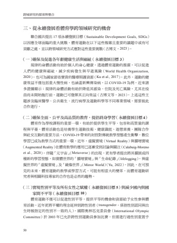 50%u8de8%u57df%u7814%u7a76%u7684%u63a2%u7d22%u8207%u6574%u5408%u4e09%u3001%u5f9e%u6c38%u7e8c%u767c%u5c55%u770b%u9ad4%u80b2%u5b78%u8de8%u9818%u57df%u7814%u7a76%u7684%u6a5f%u6703%u806f%u5408%u570b%u5171%u63d0%u51fa 17 %u9805%u6c38%u7e8c%u767c%u5c55%u76ee%u6a19%uff08Sustainable Development Goals, SDGs%uff09%u4ee5%u56e0%u61c9%u5168%u7403%u9762%u81e8%u7684%u91cd%u5927%u6311%u6230%u3002%u9ad4%u80b2%u904b%u52d5%u5728%u4ee5%u4e0b%u9019%u4e9b%u8907%u96dc%u4e14%u91cd%u8981%u7684%u8b70%u984c%u4e2d%u6216%u6709%u53ef%u8ca2%u737b%u4e4b%u8655%uff0c%u4e26%u4ee5%u8de8%u9818%u57df%u7814%u7a76%u65b9%u5f0f%u61c9%u5c0d%u9019%u4e9b%u91cd%u8981%u6311%u6230%uff08%u53e4%u535a%u6587%uff0c2023%uff09%u3002%uff08%u4e00%uff09%u78ba%u4fdd%u53ca%u4fc3%u9032%u5404%u5e74%u9f61%u5065%u5eb7%u751f%u6d3b%u8207%u798f%u7949%uff08%u6c38%u7e8c%u767c%u5c55%u76ee%u6a19 3%uff09%u898f%u5f8b%u7684%u8eab%u9ad4%u6d3b%u52d5%u6709%u52a9%u65bc%u500b%u4eba%u7684%u8eab%u5fc3%u5065%u5eb7%u3002%u900f%u904e%u9ad4%u80b2%u904b%u52d5%u7684%u63a8%u5ee3%uff0c%u53ef%u4ee5%u4fc3%u9032%u4eba%u5011%u7684%u5065%u5eb7%u8207%u798f%u7949%uff0c%u6e1b%u5c11%u75be%u75c5%u767c%u751f%u8207%u65e9%u901d%u98a8%u96aa%uff08World Health Organization, 2020%uff09%uff0c%u4e5f%u53ef%u70ba%u570b%u5bb6%u7bc0%u7701%u5bf6%u8cb4%u7684%u91ab%u7642%u7167%u8b77%u8cc7%u6e90%uff08Ku et al., 2017%uff09%u3002%u6b64%u5916%uff0c%u904b%u52d5%u7684%u5065%u5eb7%u6548%u76ca%u4e0d%u50c5%u5305%u62ec%u91cd%u5927%u6162%u6027%u75c5%uff0c%u4e5f%u6db5%u84cb%u65b0%u8208%u50b3%u67d3%u75c5%u3002%u4ee5 COVID-19 %u70ba%u4f8b%uff0c%u8fd1%u4f86%u8af8%u591a%u8b49%u64da%u986f%u793a%uff1a%u898f%u5f8b%u7684%u8eab%u9ad4%u6d3b%u52d5%u6709%u52a9%u65bc%u964d%u4f4e%u5176%u611f%u67d3%u3001%u4f4f%u9662%u53ca%u6b7b%u4ea1%u98a8%u96aa%uff0c%u5c24%u5176%u5728%u75ab%u82d7%u5c1a%u672a%u958b%u59cb%u65bd%u6253%u524d%uff0c%u904b%u52d5%u5df2%u53ef%u767c%u63ee%u5176%u6b63%u5411%u6548%u76ca%uff08%u53e4%u535a%u6587%u7b49%uff0c2023%uff09%u3002%u4e0a%u8ff0%u9019%u4e9b%u4e3b%u984c%u6d89%u53ca%u81e8%u5e8a%u91ab%u5b78%u3001%u516c%u5171%u885b%u751f%u3001%u6d41%u884c%u75c5%u5b78%u53ca%u904b%u52d5%u79d1%u5b78%u7b49%u4e0d%u540c%u5c08%u696d%u9818%u57df%uff0c%u9700%u8981%u5f7c%u6b64%u5408%u4f5c%u9032%u884c%u3002%uff08%u4e8c%uff09%u78ba%u4fdd%u5168%u9762%u3001%u516c%u5e73%u53ca%u9ad8%u54c1%u8cea%u7684%u6559%u80b2%uff0c%u63d0%u5021%u7d42%u8eab%u5b78%u7fd2%uff08%u6c38%u7e8c%u767c%u5c55%u76ee%u6a19 4%uff09%u9ad4%u80b2%u4f5c%u70ba%u5b78%u6821%u8ab2%u7a0b%u7684%u91cd%u8981%u4e00%u74b0%uff0c%u6709%u52a9%u65bc%u63d0%u4f9b%u5b78%u751f%u5e73%u7b49%u3001%u5305%u5bb9%u548c%u9ad8%u8cea%u91cf%u7684%u8ab2%u7a0b%u8207%u5e73%u81fa%u3002%u9ad4%u80b2%u6d3b%u52d5%u4e5f%u662f%u57f9%u990a%u5b78%u751f%u904b%u52d5%u6280%u8853%u3001%u5065%u5eb7%u8b58%u80fd%u3001%u904a%u61a9%u7d20%u990a%u3001%u5718%u968a%u5408%u4f5c%u8207%u793e%u4ea4%u4e92%u52d5%u7684%u91cd%u8981%u65b9%u6cd5%u3002COVID-19 %u5e36%u4f86%u7684%u5c01%u63a7%u5c0d%u50b3%u7d71%u6559%u5b78%u578b%u614b%u7522%u751f%u885d%u64ca%uff0c%u6578%u4f4d%u5b78%u7fd2%u5df2%u6210%u70ba%u6559%u5b78%u65b9%u5f0f%u7684%u91cd%u8981%u4e00%u74b0%u3002%u8fd1%u5e74%uff0c%u865b%u64ec%u5be6%u5883%uff08Virtual Reality%uff09%u8207%u64f4%u589e%u5be6%u5883%uff08Augmented Reality%uff09%u5728%u9ad4%u80b2%u6559%u5b78%u7684%u61c9%u7528%u5df2%u9010%u6f38%u53d7%u5230%u8a0e%u8ad6%u8207%u95dc%u6ce8%uff08Calabuig-Moreno et al., 2020%uff09%u3002%u4f34%u96a8%u300c%u5143%u5b87%u5b99%u300d%uff08Metaverse%uff09%u7684%u51fa%u73fe%uff0c%u66f4%u6709%u5b78%u8005%u63d0%u51fa%u5c07%u5176%u64f4%u5c55%u6210%u56db%u7a2e%u65b0%u7684%u5b78%u7fd2%u578b%u614b%uff0c%u5982%u5be6%u9ad4%u4e16%u754c%u7684%u300c%u64f4%u589e%u5be6%u5883%u300d%u8207%u300c%u751f%u547d%u7d00%u9304%u300d%uff08lifelogging%uff09%uff0c%u8207%u865b%u64ec%u4e16%u754c%u7684%u300c%u865b%u64ec%u5be6%u5883%u300d%u53ca%u300c%u93e1%u50cf%u4e16%u754c%u300d%uff08Mirror World%uff09%uff08Yu, 2022%uff09%u3002%u56e0%u6b64%uff0c%u5728%u53ef%u9810%u898b%u7684%u672a%u4f86%uff0c%u9ad4%u80b2%u904b%u52d5%u7684%u6559%u5b78%u6216%u5b78%u7fd2%u65b9%u5f0f%uff0c%u53ef%u80fd%u6709%u76f8%u7576%u5927%u7684%u8b8a%u9769%uff0c%u800c%u9ad4%u80b2%u904b%u52d5%u7814%u7a76%u8005%u8207%u76f8%u95dc%u79d1%u6280%u5c08%u5bb6%u7684%u5408%u4f5c%u4e5f%u662f%u5fc5%u7136%u7684%u8da8%u52e2%u3002%uff08%u4e09%uff09%u5be6%u73fe%u6027%u5225%u5e73%u7b49%u53ca%u6240%u6709%u5973%u6027%u4e4b%u8ce6%u6b0a%uff08%u6c38%u7e8c%u767c%u5c55%u76ee%u6a19 5%uff09%u8207%u6e1b%u5c11%u570b%u5167%u8207%u570b%u5bb6%u9593%u4e0d%u5e73%u7b49%uff08%u6c38%u7e8c%u767c%u5c55%u76ee%u6a19 10%uff09%u9ad4%u80b2%u904b%u52d5%u4e0d%u50c5%u53ef%u4ee5%u4fc3%u9032%u6027%u5225%u5e73%u7b49%uff0c%u63d0%u4f9b%u5e73%u7b49%u7684%u6a5f%u6703%u548c%u8cc7%u6e90%u7d66%u4e88%u5973%u6027%u53c3%u8207%u9ad4%u80b2%u6d3b%u52d5%u3002%u8fd1%u5e74%u66f4%u5c07%u5e73%u6b0a%u7684%u7406%u5ff5%u5ef6%u4f38%u5230%u8de8%u6027%u5225%u8005%uff08transgender%uff0c%u4fc2%u6307%u6027%u5225%u8a8d%u540c%u8207%u51fa%u751f%u6642%u88ab%u6307%u5b9a%u7684%u6027%u5225%u4e0d%u4e00%u81f4%u7684%u4eba%uff09%u3002%u570b%u969b%u5967%u6797%u5339%u514b%u59d4%u54e1%u6703%uff08International Olympic Committee%uff09%u65bc 2003 %u5e74%u5df2%u5141%u8a31%u8de8%u6027%u5225%u904b%u52d5%u54e1%u53c3%u52a0%u6bd4%u8cfd%uff0c%u4f46%u9700%u9032%u884c%u904e%u6027%u5225%u91cd%u7f6e%u624b