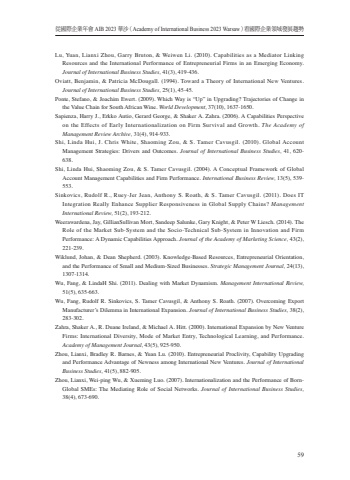 %u5f9e%u570b%u969b%u4f01%u696d%u5e74%u6703 AIB 2023 %u83ef%u6c99%uff08Academy of International Business 2023 Warsaw%uff09%u770b%u570b%u969b%u4f01%u696d%u9818%u57df%u767c%u5c55%u8da8%u52e259Lu, Yuan, Lianxi Zhou, Garry Bruton, & Weiwen Li. (2010). Capabilities as a Mediator Linking Resources and the International Performance of Entrepreneurial Firms in an Emerging Economy. Journal of International Business Studies, 41(3), 419-436.Oviatt, Benjamin, & Patricia McDougall. (1994). Toward a Theory of International New Ventures. Journal of International Business Studies, 25(1), 45-45.Ponte, Stefano, & Joachim Ewert. (2009). Which Way is %u201cUp%u201d in Upgrading? Trajectories of Change in the Value Chain for South African Wine. World Development, 37(10), 1637-1650.Sapienza, Harry J., Erkko Autio, Gerard George, & Shaker A. Zahra. (2006). A Capabilities Perspective on the Effects of Early Internationalization on Firm Survival and Growth. The Academy of Management Review Archive, 31(4), 914-933.Shi, Linda Hui, J. Chris White, Shaoming Zou, & S. Tamer Cavusgil. (2010). Global Account Management Strategies: Drivers and Outcomes. Journal of International Business Studies, 41, 620-638.Shi, Linda Hui, Shaoming Zou, & S. Tamer Cavusgil. (2004). A Conceptual Framework of Global Account Management Capabilities and Firm Performance. International Business Review, 13(5), 539-553.Sinkovics, Rudolf R., Ruey-Jer Jean, Anthony S. Roath, & S. Tamer Cavusgil. (2011). Does IT Integration Really Enhance Supplier Responsiveness in Global Supply Chains? Management International Review, 51(2), 193-212.Weerawardena, Jay, GillianSullivan Mort, Sandeep Salunke, Gary Knight, & Peter W Liesch. (2014). The Role of the Market Sub-System and the Socio-Technical Sub-System in Innovation and Firm Performance: A Dynamic Capabilities Approach. Journal of the Academy of Marketing Science, 43(2), 221-239.Wiklund, Johan, & Dean Shepherd. (2003). Knowledge-Based Resources, Entrepreneurial Orientation, and the Performance of Small and Medium-Sized Businesses. Strategic Management Journal, 24(13), 1307-1314.Wu, Fang, & LindaH Shi. (2011). Dealing with Market Dynamism. Management International Review, 51(5), 635-663.Wu, Fang, Rudolf R. Sinkovics, S. Tamer Cavusgil, & Anthony S. Roath. (2007). Overcoming Export Manufacturer%u2019s Dilemma in International Expansion. Journal of International Business Studies, 38(2), 283-302.Zahra, Shaker A., R. Duane Ireland, & Michael A. Hitt. (2000). International Expansion by New Venture Firms: International Diversity, Mode of Market Entry, Technological Learning, and Performance. Academy of Management Journal, 43(5), 925-950.Zhou, Lianxi, Bradley R. Barnes, & Yuan Lu. (2010). Entrepreneurial Proclivity, Capability Upgrading and Performance Advantage of Newness among International New Ventures. Journal of International Business Studies, 41(5), 882-905.Zhou, Lianxi, Wei-ping Wu, & Xueming Luo. (2007). Internationalization and the Performance of BornGlobal SMEs: The Mediating Role of Social Networks. Journal of International Business Studies,38(4), 673-690.