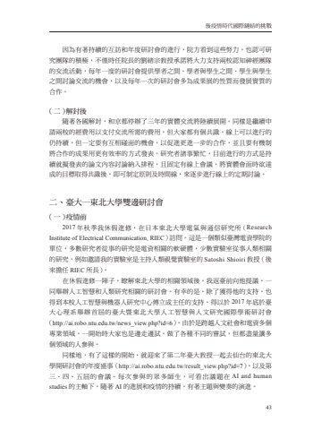 %u5f8c%u75ab%u60c5%u6642%u4ee3%u570b%u969b%u93c8%u7d50%u7684%u6311%u623043%u56e0%u70ba%u6709%u8457%u6301%u7e8c%u7684%u4e92%u8a2a%u548c%u5e74%u5ea6%u7814%u8a0e%u6703%u7684%u9032%u884c%uff0c%u9662%u65b9%u770b%u5230%u9019%u4e9b%u52aa%u529b%uff0c%u4e5f%u8a8d%u53ef%u7814%u7a76%u5718%u968a%u7684%u7a4d%u6975%uff0c%u4e0d%u50c5%u6642%u4efb%u9662%u9577%u7684%u5289%u7dd2%u5b97%u6559%u6388%u627f%u8afe%u5c07%u5927%u529b%u652f%u6301%u5169%u6821%u8a8d%u77e5%u795e%u7d93%u5718%u968a%u7684%u4ea4%u6d41%u6d3b%u52d5%uff0c%u6bcf%u5e74%u4e00%u5ea6%u7684%u7814%u8a0e%u6703%u63d0%u4f9b%u5b78%u8005%u4e4b%u9593%u3001%u5b78%u8005%u8207%u5b78%u751f%u4e4b%u9593%u3001%u5b78%u751f%u8207%u5b78%u751f%u4e4b%u9593%u8a0e%u8ad6%u4ea4%u6d41%u7684%u6a5f%u6703%uff0c%u4ee5%u53ca%u6bcf%u5e74%u4e00%u6b21%u7684%u7814%u8a0e%u6703%u591a%u70ba%u6210%u679c%u5c55%u7684%u6027%u8cea%u800c%u767c%u5c55%u5be6%u8cea%u7684%u5408%u4f5c%u3002%uff08%u4e8c%uff09%u89e3%u5c01%u5f8c%u96a8%u8457%u5404%u570b%u89e3%u5c01%uff0c%u548c%u4eac%u90fd%u505c%u8fa6%u4e86%u4e09%u5e74%u7684%u5be6%u9ad4%u4ea4%u6d41%u5c07%u9678%u7e8c%u5c55%u958b%u3002%u540c%u6a23%u662f%u7e7c%u7e8c%u7533%u8acb%u5169%u6821%u7684%u7d93%u8cbb%u7528%u4ee5%u652f%u4ed8%u4ea4%u6d41%u6240%u9700%u7684%u8cbb%u7528%uff0c%u4f46%u5927%u5bb6%u90fd%u6709%u500b%u5171%u8b58%uff0c%u7dda%u4e0a%u53ef%u4ee5%u9032%u884c%u7684%u4ecd%u6301%u7e8c%uff0c%u4f46%u4e00%u5b9a%u8981%u6709%u4e92%u76f8%u78b0%u9762%u7684%u6a5f%u6703%uff0c%u4ee5%u4fc3%u9032%u66f4%u9032%u4e00%u6b65%u7684%u5408%u4f5c%uff0c%u4e26%u4e14%u8981%u6709%u6a5f%u5236%u5c07%u5408%u4f5c%u7684%u6210%u679c%u7528%u66f4%u6709%u6548%u7387%u7684%u65b9%u5f0f%u767c%u8868%u3002%u7814%u7a76%u8005%u8af8%u4e8b%u7e41%u5fd9%uff0c%u76ee%u524d%u9032%u884c%u7684%u65b9%u5f0f%u662f%u6301%u7e8c%u5c31%u64ec%u767c%u8868%u7684%u8ad6%u6587%u5167%u5bb9%u8a0e%u8ad6%u7d0d%u5165%u6392%u7a0b%uff0c%u4e14%u56fa%u5b9a%u6709%u7dda%u4e0a%u6703%u8b70%uff0c%u5c07%u5be6%u9ad4%u6703%u9762%u6642%u6b32%u9054%u6210%u7684%u76ee%u6a19%u53d6%u5f97%u5171%u8b58%u5f8c%uff0c%u5373%u53ef%u5236%u5b9a%u539f%u5247%u53ca%u6642%u9593%u7dda%uff0c%u4f86%u9010%u6b65%u9032%u884c%u7dda%u4e0a%u7684%u5b9a%u671f%u8a0e%u8ad6%u3002%u4e8c%u3001%u81fa%u5927%u2500%u6771%u5317%u5927%u5b78%u96d9%u908a%u7814%u8a0e%u6703%uff08%u4e00%uff09%u75ab%u60c5%u524d2017 %u5e74%u79cb%u5b63%u6211%u4f11%u5047%u9032%u4fee%uff0c%u5728%u65e5%u672c%u6771%u5317%u5927%u5b78%u96fb%u6c23%u8207%u901a%u4fe1%u7814%u7a76%u6240%uff08Research Institute of Electrical Communication, RIEC%uff09%u8a2a%u554f%u3002%u9019%u662f%u4e00%u500b%u985e%u4f3c%u81fa%u7063%u96fb%u8cc7%u5b78%u9662%u7684%u55ae%u4f4d%uff0c%u591a%u6578%u7814%u7a76%u8005%u5f9e%u4e8b%u7684%u7814%u7a76%u662f%u96fb%u8cc7%u76f8%u95dc%u7684%u8edf%u786c%u9ad4%uff0c%u5c11%u6578%u5be6%u9a57%u5ba4%u5f9e%u4e8b%u4eba%u985e%u76f8%u95dc%u7684%u7814%u7a76%uff0c%u4f8b%u5982%u9080%u8acb%u6211%u7684%u5be6%u9a57%u5ba4%u662f%u4e3b%u6301%u4eba%u985e%u8996%u89ba%u5be6%u9a57%u5ba4%u7684 Satoshi Shioiri %u6559%u6388%uff08%u5f8c%u4f86%u64d4%u4efb RIEC %u6240%u9577%uff09%u3002%u5728%u4f11%u5047%u9032%u4fee%u4e00%u9663%u5b50%uff0c%u77ad%u89e3%u6771%u5317%u5927%u5b78%u7684%u76f8%u95dc%u9818%u57df%u5f8c%uff0c%u6211%u8fd4%u81fa%u524d%u5411%u4ed6%u63d0%u8b70%uff0c%u4e00%u540c%u8209%u8fa6%u4eba%u5de5%u667a%u6167%u548c%u4eba%u985e%u7814%u7a76%u76f8%u95dc%u7684%u7814%u8a0e%u6703%u3002%u6709%u5e78%u7684%u662f%uff0c%u9664%u4e86%u7372%u5f97%u4ed6%u7684%u652f%u6301%uff0c%u4e5f%u5f97%u5230%u672c%u6821%u4eba%u5de5%u667a%u6167%u8207%u6a5f%u5668%u4eba%u7814%u7a76%u4e2d%u5fc3%u5085%u7acb%u6210%u4e3b%u4efb%u7684%u652f%u6301%uff0c%u5f97%u4ee5%u65bc 2017 %u5e74%u5e95%u65bc%u81fa%u5927%u5fc3%u7406%u7cfb%u8209%u8fa6%u9996%u5c46%u7684%u81fa%u5927%u66a8%u6771%u5317%u5927%u5b78%u4eba%u5de5%u667a%u6167%u8207%u4eba%u6587%u7814%u7a76%u570b%u969b%u5b78%u8853%u7814%u8a0e%u6703%uff08http://ai.robo.ntu.edu.tw/news_view.php?id=6%uff09%u3002%u7531%u65bc%u662f%u8de8%u8d8a%u4eba%u6587%u793e%u6703%u548c%u96fb%u8cc7%u591a%u500b%u5c08%u696d%u9818%u57df%uff0c%u4e00%u958b%u59cb%u6642%u5927%u5bb6%u4e5f%u662f%u908a%u8d70%u908a%u8a66%uff0c%u505a%u4e86%u5404%u7a2e%u4e0d%u540c%u7684%u5617%u8a66%uff0c%u4f46%u90fd%u76e1%u91cf%u8b93%u591a%u500b%u9818%u57df%u7684%u4eba%u53c3%u8207%u3002%u540c%u6a23%u5730%uff0c%u6709%u4e86%u9019%u6a23%u7684%u958b%u59cb%uff0c%u5c31%u8fce%u4f86%u4e86%u7b2c%u4e8c%u5e74%u81fa%u5927%u6559%u6388%u4e00%u8d77%u53bb%u4ed9%u53f0%u7684%u6771%u5317%u5927%u5b78%u958b%u7814%u8a0e%u6703%u7684%u5e74%u5ea6%u76db%u4e8b%uff08http://ai.robo.ntu.edu.tw/result_view.php?id=7%uff09%uff0c%u4ee5%u53ca%u7b2c%u4e09%u3001%u56db%u3001%u4e94%u5c46%u7684%u6703%u8b70%u3002%u6bcf%u6b21%u53c3%u8207%u7684%u773e%u591a%u5e2b%u751f%uff0c%u53ef%u770b%u51fa%u8b70%u984c%u5728 AI and human studies %u7684%u4e3b%u8ef8%u4e0b%uff0c%u96a8%u8457 AI %u7684%u9032%u5c55%u548c%u75ab%u60c5%u7684%u6301%u7e8c%uff0c%u6709%u8457%u4e3b%u984c%u8207%u8b8a%u594f%u7684%u6f14%u9032%u3002