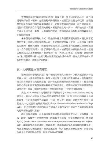 %u5f8c%u75ab%u60c5%u6642%u4ee3%u570b%u969b%u93c8%u7d50%u7684%u6311%u623045%u5be6%u9ad4%u4ea4%u6d41%u7531%u65bc%u53ef%u4ee5%u9762%u5c0d%u9762%u7684%u6e9d%u901a%uff0c%u76f4%u63a5%u4e92%u52d5%uff0c%u9664%u4e86%u53e3%u8a9e%u8a0a%u606f%u4e4b%u5916%uff0c%u9084%u53ef%u4ee5%u900f%u904e%u81c9%u90e8%u8868%u60c5%u3001%u773c%u795e%u3001%u8eab%u9ad4%u59ff%u52e2%u6216%u8072%u8abf%u52d5%u4f5c%uff0c%u6216%u751a%u81f3%u5c0d%u8ac7%u96d9%u65b9%u7684%u7728%u773c%u3001%u8eab%u9ad4%u59ff%u52e2%u7684%u540c%u6b65%u6027%u7b49%u975e%u53e3%u8a9e%u7684%u7dda%u7d22%u50b3%u905e%u8a0a%u606f%uff0c%u66f4%u80fd%u4fc3%u9032%u5f7c%u6b64%u7684%u540c%u7406%u3001%u4fe1%u4efb%u548c%u8a8d%u540c%u611f%uff0c%u9019%u5c0d%u65bc%u5be6%u8cea%u9577%u671f%u5408%u4f5c%u662f%u91cd%u8981%u7684%u57fa%u790e%u3002%u76f8%u5c0d%u65bc%u7dda%u4e0a%u7684%u4e00%u5c0d%u4e00%u3001%u7cfb%u5217%u5730%u4ea4%u6d41%uff0c%u5be6%u9ad4%u4ea4%u6d41%u53ef%u591a%u65b9%u4ea4%u6d41%u3001%u52d5%u614b%u3001%u4e14%u975e%u7dda%u6027%u7684%u65b9%u5f0f%uff0c%u66f4%u5bb9%u6613%u8ff8%u767c%u51fa%u591a%u5c0d%u591a%u7684%u8907%u96dc%u5ea6%u9ad8%u53ca%u975e%u9810%u671f%u7684%u6548%u679c%u3002%u672a%u4f86%u7406%u60f3%u7684%u570b%u969b%u93c8%u7d50%u65b9%u5f0f%uff0c%u5c07%u662f%u64f7%u53d6%u7dda%u4e0a%u548c%u5be6%u9ad4%u6e9d%u901a%u7684%u512a%u9ede%uff0c%u512a%u5316%u5169%u8005%u6df7%u642d%u7684%u6548%u679c%u3002%u4f8b%u5982%u53ef%u4ee5%u5728%u5be6%u969b%u6703%u9762%u524d%uff0c%u5148%u5b89%u6392%u56fa%u5b9a%u7684%u7dda%u4e0a%u4ea4%u6d41%uff0c%u53ef%u4ee5%u7531%u7dda%u4e0a%u8655%u7406%u7684%u5148%u8655%u7406%uff0c%u5be6%u9ad4%u898b%u9762%u6642%uff0c%u5247%u9032%u884c%u5404%u7a2e%u5305%u62ec%u975e%u53e3%u8a9e%u8a0a%u606f%u5728%u5167%u7684%u610f%u5716%u4ea4%u63db%u8207%u60c5%u611f%u4ea4%u6d41%u3002%u5408%u4f5c%u8981%u80fd%u53ef%u9577%u53ef%u4e45%uff0c%u9664%u4e86%u8b70%u984c%u7684%u5951%u5408%u5916%uff0c%u60c5%u611f%u662f%u80fd%u6301%u7e8c%u7684%u52d5%u529b%u4f86%u6e90%u3002%u900f%u904e%u5404%u7a2e%u901a%u8a0a%u65b9%u5f0f%u53ca%u5be6%u9ad4%u4ea4%u6d41%uff0c%u8981%u80fd%u767c%u63ee%u4e00%u52a0%u4e00%u5927%u65bc%u4e8c%u7684%u6548%u76ca%u3002%u540c%u6a23%u5730%uff0c%u5408%u4f5c%u7684%u96d9%u65b9%uff08%u548c%u4eba%u969b%u95dc%u4fc2%u4e00%u6a23%uff09%u5fc5%u9808%u6bd4%u7368%u7acb%u4f5c%u696d%u8981%u80fd%u6709%u52a0%u4e58%u7684%u6548%u679c%uff0c%u800c%u5f7c%u6b64%u90fd%u4e0d%u5403%u8667%uff0c%u5e73%u8861%u7684%u5c0d%u7b49%u95dc%u4fc2%uff0c%u624d%u80fd%u5171%u597d%u4e14%u6301%u7e8c%u3002%u4e94%u3001%u5927%u5b78%u61c9%u8a2d%u7acb%u5c08%u8cac%u55ae%u4f4d%u81fa%u7063%u76ee%u524d%u7684%u5b78%u8853%u73fe%u6cc1%u662f%uff0c%u6bcf%u4e00%u9818%u57df%u7684%u5b78%u8853%u4eba%u53e3%u7686%u5c11%uff0c%u5c11%u6578%u4eba%u5c31%u8981%u4ee3%u8868%u7279%u5b9a%u9818%u57df%uff0c%u52a0%u4e0a%u5927%u5b78%u6559%u5e2b%u7684%u670d%u52d9%u3001%u6559%u5b78%u3001%u7814%u7a76%u7b49%u4e09%u8db3%u9f0e%u7acb%u7684%u91cd%u64d4%u58d3%u8eab%uff0c%u9032%u884c%u570b%u969b%u4ea4%u6d41%u82e5%u6c92%u6709%u5c08%u8cac%u55ae%u4f4d%u7684%u884c%u653f%u5354%u52a9%uff0c%u5c0d%u65bc%u6709%u5fc3%u62d3%u5ee3%u570b%u969b%u4ea4%u6d41%u7684%u6559%u5e2b%u800c%u8a00%uff0c%u5c07%u82b1%u8cbb%u904e%u591a%u7684%u5fc3%u529b%u5728%u548c%u7814%u7a76%u6559%u5b78%u7121%u95dc%u7684%u806f%u7d61%u6216%u884c%u653f%u4e8b%u52d9%u4e0a%uff0c%u6642%u9593%u7684%u5207%u5272%u4e0b%u5c07%u5f71%u97ff%u5be6%u969b%u7684%u7814%u7a76%u5408%u4f5c%uff0c%u5f62%u6210%u4e00%u7a2e%u96b1%u6027%u7684%u61f2%u7f70%uff0c%u5bb9%u6613%u6f86%u7184%u71b1%u60c5%uff0c%u4e0d%u5229%u65bc%u6301%u7e8c%u7684%u63a8%u5ee3%u3002%u6211%u5728 2019-2020 %u66fe%u70ba%u53f2%u4e39%u4f5b%u9ad8%u7b49%u884c%u70ba%u7814%u7a76%u4e2d%u5fc3%uff08https://casbs.stanford.edu%uff09%u7684%u7814%u7a76%u54e1%uff0c%u8a72%u4e2d%u5fc3%u6bcf%u5e74%u6709%u5927%u7d04 40 %u4f4d%u7684%u570b%u969b%u5b78%u8005%u9032%u99d0%uff0c%u6709 20 %u4f4d%u5de6%u53f3%u7684%u5c08%u8cac%u4eba%u54e1%u5354%u52a9%u6bcf%u5e74%u4e00%u4efb%u7684%u5b78%u8005%u8655%u7406%u5305%u62ec%u7c3d%u8b49%u3001%u4f4f%u5bbf%u3001%u8fa6%u516c%u5ba4%u3001%u96fb%u8166%u3001%u904b%u52d5%u7b49%u5927%u5c0f%u4e8b%u5b9c%u3002%u6211%u5011%u5728%u6b64%u4e2d%u5fc3%u80fd%u76e1%u60c5%u5730%u7814%u7a76%u8207%u4ea4%u6d41%uff08https://humanityisland.nccu.edu.tw/su-lingyeh/%uff09%uff0c%u5f97%u529b%u65bc%u5176%u4ed6%u884c%u653f%u4e8b%u9805%u7531%u9019%u4e9b%u5c08%u8cac%u4eba%u54e1%u8655%u7406%u59a5%u5207%uff0c%u800c%u9019%u4e9b%u4eba%u5354%u52a9%u570b%u969b%u5b78%u8005%u7684%u884c%u653f%u7d93%u9a57%u4e5f%u5f97%u4ee5%u7d2f%u7a4d%u3002%u7531%u65bc%u4e16%u754c%u5404%u570b%u6709%u4e00%u767e%u591a%u500b%u9019%u985e%u5b78%u8005%u9032%u99d0%u578b%u7684%u9ad8%u7b49%u7814%u7a76%u4e2d%u5fc3%uff0c%u5305%u62ec%u97d3%u570b%u3001%u4e2d%u570b%u3001%u5370%u5ea6%u3001%u6ce2%u862d%u7b49%uff0c%u4f46%u81fa%u7063%u6c92%u6709%uff0c%u56e0%u6b64%u6211%u591a%u6b21%u9f13%u5439%uff0c%u5e0c%u671b%u81fa%u7063%u80fd%u5efa%u7f6e%u4e00%u500b%u985e%u4f3c%u7684%u4e2d%u5fc3%uff08https://www.science.ntu.edu.tw/fiveyears/newsletter45/09.Psy-SuLingYeh.pdf%uff09%uff0c%u8b93%u570b%u969b%u5b78%u8005%u80fd%u4f86%u9032%u99d0%uff0c%u77ad%u89e3%u81fa%u7063%uff0c%u900f%u904e%u8207%u570b%u5167%u5b78%u8005%u8f03%u9577%u671f%u7684%u63a5%u89f8%u4ea4%u6d41%uff0c%u589e%u9032%u81fa%u7063%u570b%u969b%u4ea4%u6d41%u7684%u52d5%u80fd%uff0c%u671f%u80fd%u7d30%u6c34%u9577%u6d41%u3002%u4e5f%u8a31%u521d%u671f%u898f%u6a21%u7121%u6cd5%u592a%u5927%uff0c%u4f46%u5c08%u8cac%u7684%u884c%u653f%u4eba%u54e1%u4e4b%u5354%u52a9%u662f%u5fc5%u8981%u7684%uff0c%u4e5f%u662f%u6210%u529f%u8207%u5426%u7684%u95dc%u9375%u3002