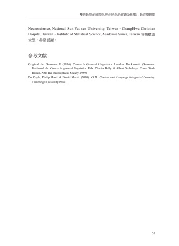 %u96d9%u8a9e%u6559%u5b78%u7684%u570b%u969b%u5316%u8207%u5728%u5730%u5316%u7684%u5be6%u8e10%u53ca%u6311%u6230%uff1a%u6559%u80b2%u5b78%u89c0%u9ede53Neuroscience, National Sun Yat-sen University, Taiwan%u3001ChangHwa Christian Hospital, Taiwan%u3001Institute of Statistical Science, Academia Sinica, Taiwan %u7b49%u6a5f%u69cb%u6216%u5927%u5b78%uff0c%u975e%u5e38%u611f%u8b1d%u3002%u53c3%u8003%u6587%u737bOriginal: de Saussure, F. (1916). Course in General Linguistics. London: Duckworth. (Saussure, Ferdinand de. Course in general linguistics. Eds. Charles Bally & Albert Sechehaye. Trans. Wade Baskin, NY: The Philosophical Society, 1959)Do Coyle, Philip Hood, & David Marsh. (2010). CLIL: Content and Language Integrated Learning. Cambridge University Press.